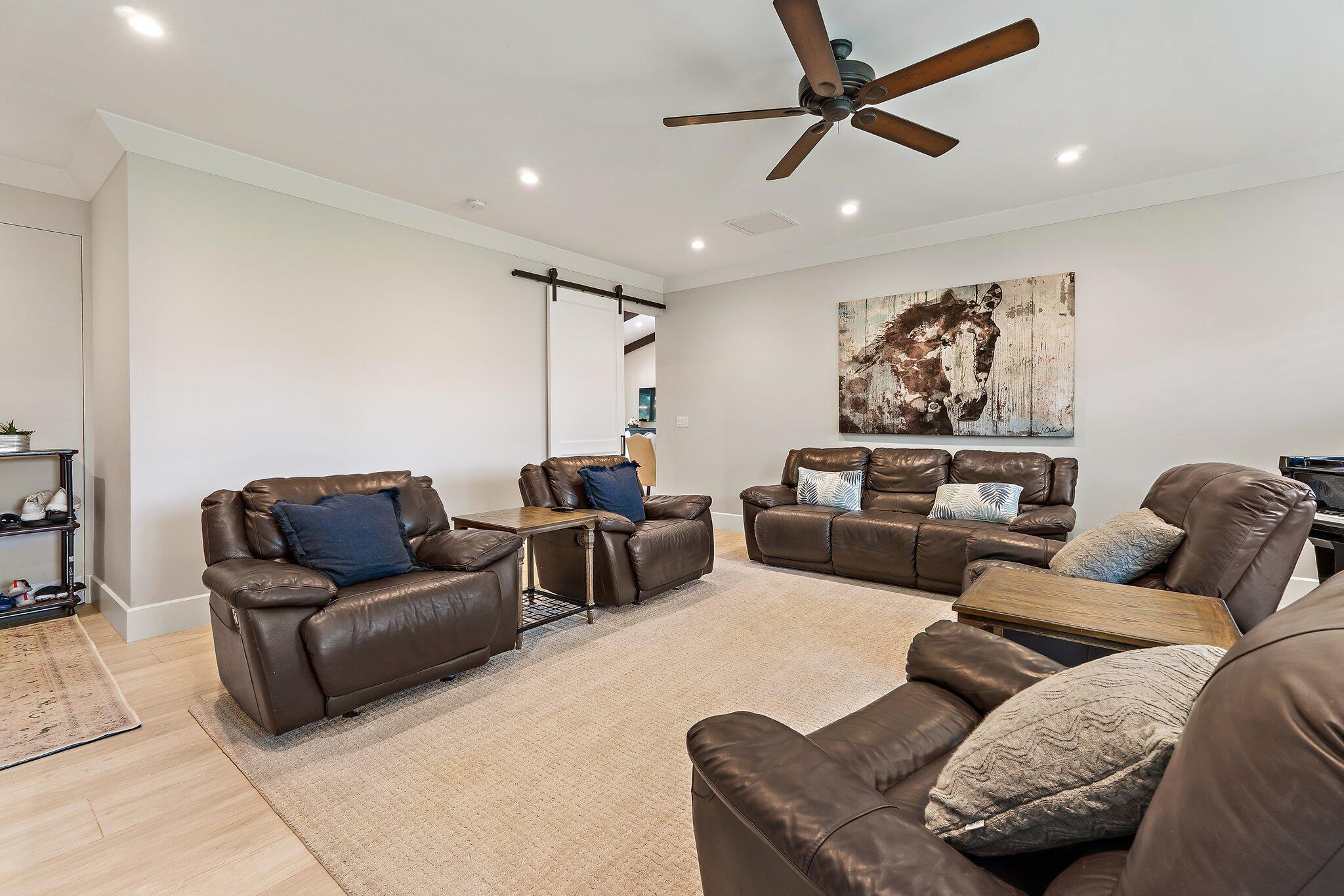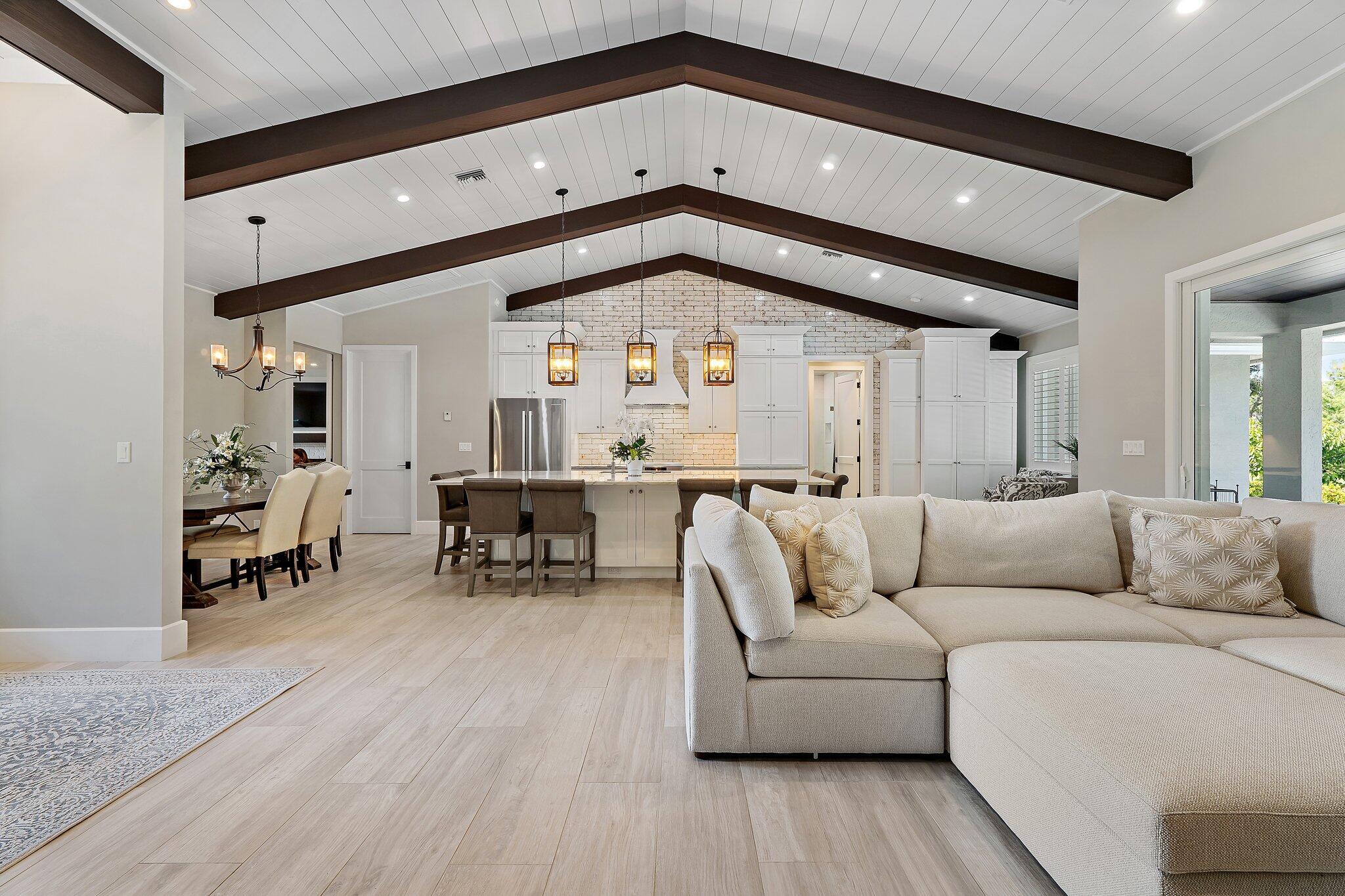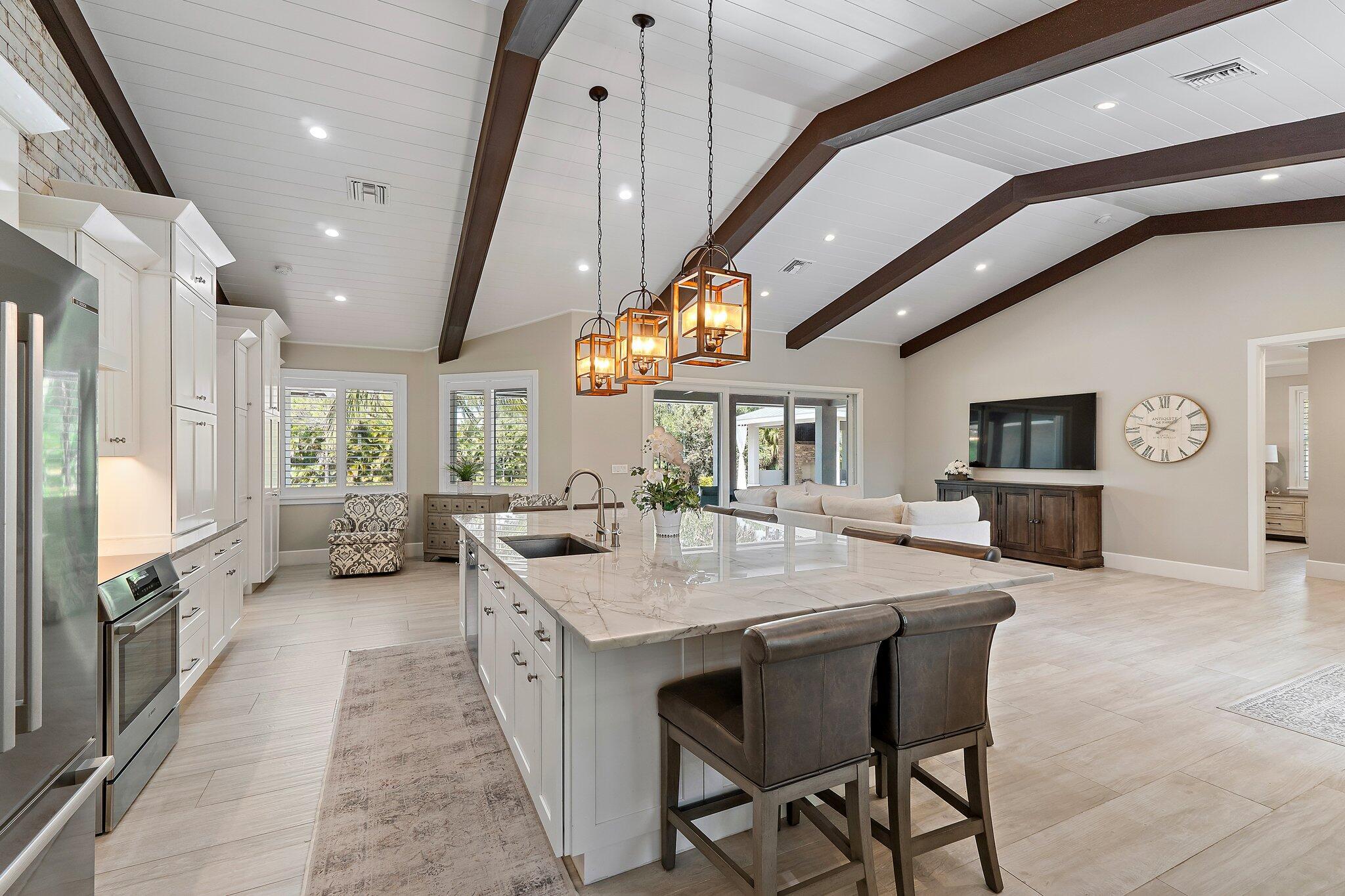 A rare opportunity to own 2.4 acres of pure sophistication, privacy, and purpose anchored by an extraordinary 1,750 square foot CBS garage that is fully air conditioned with 16 foot ceilings, ideal for car collectors, RV enthusiasts, guest quarters, or a business retreat. The space alone redefines versatility and luxury.Every inch of this remodeled estate home reflects thoughtful design and refined craftsmanship. With 3 bedrooms, 2 baths, and a spacious den, the interior features elegant 7 inch crown moldings, solid 8 foot core doors, vaulted beam ceilings, custom cabinetry, plantation shutters, and designer lighting throughout. The beautifully curated home office creates an inspiring environment to work or create from home.The gourmet kitchen is a showpiece of style and function,