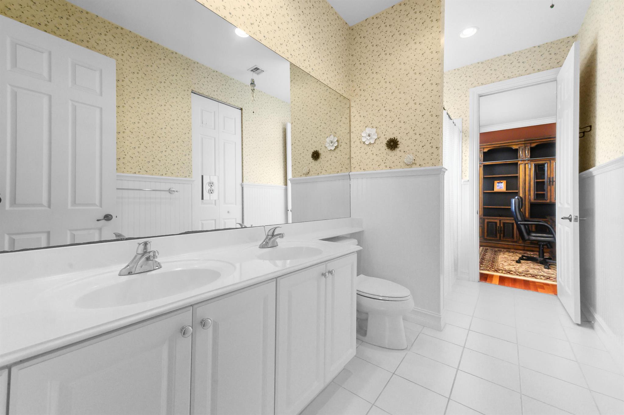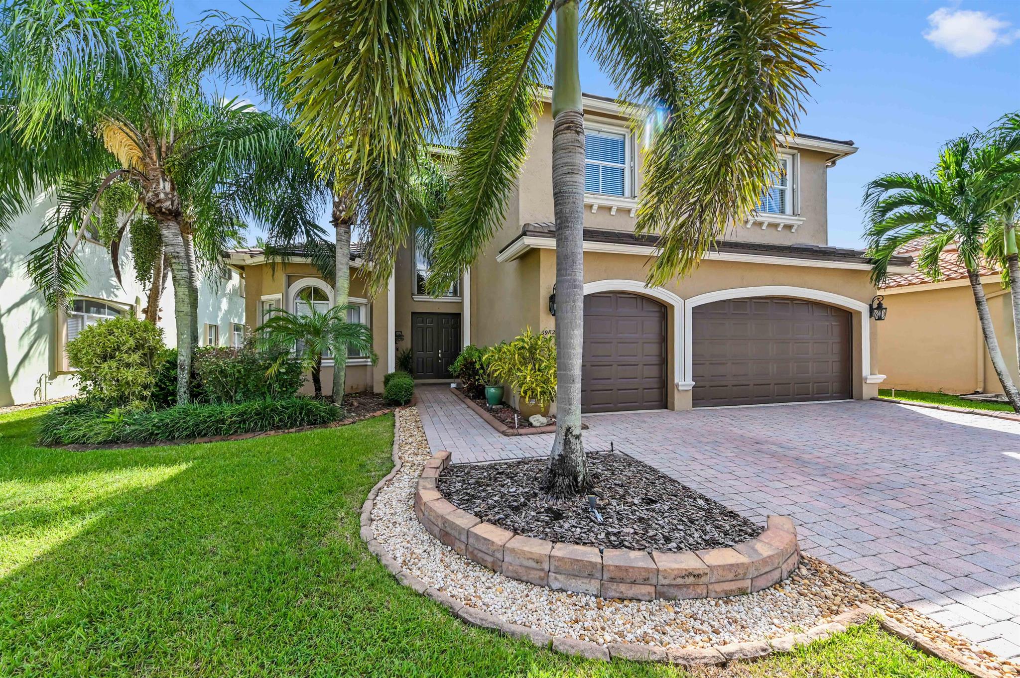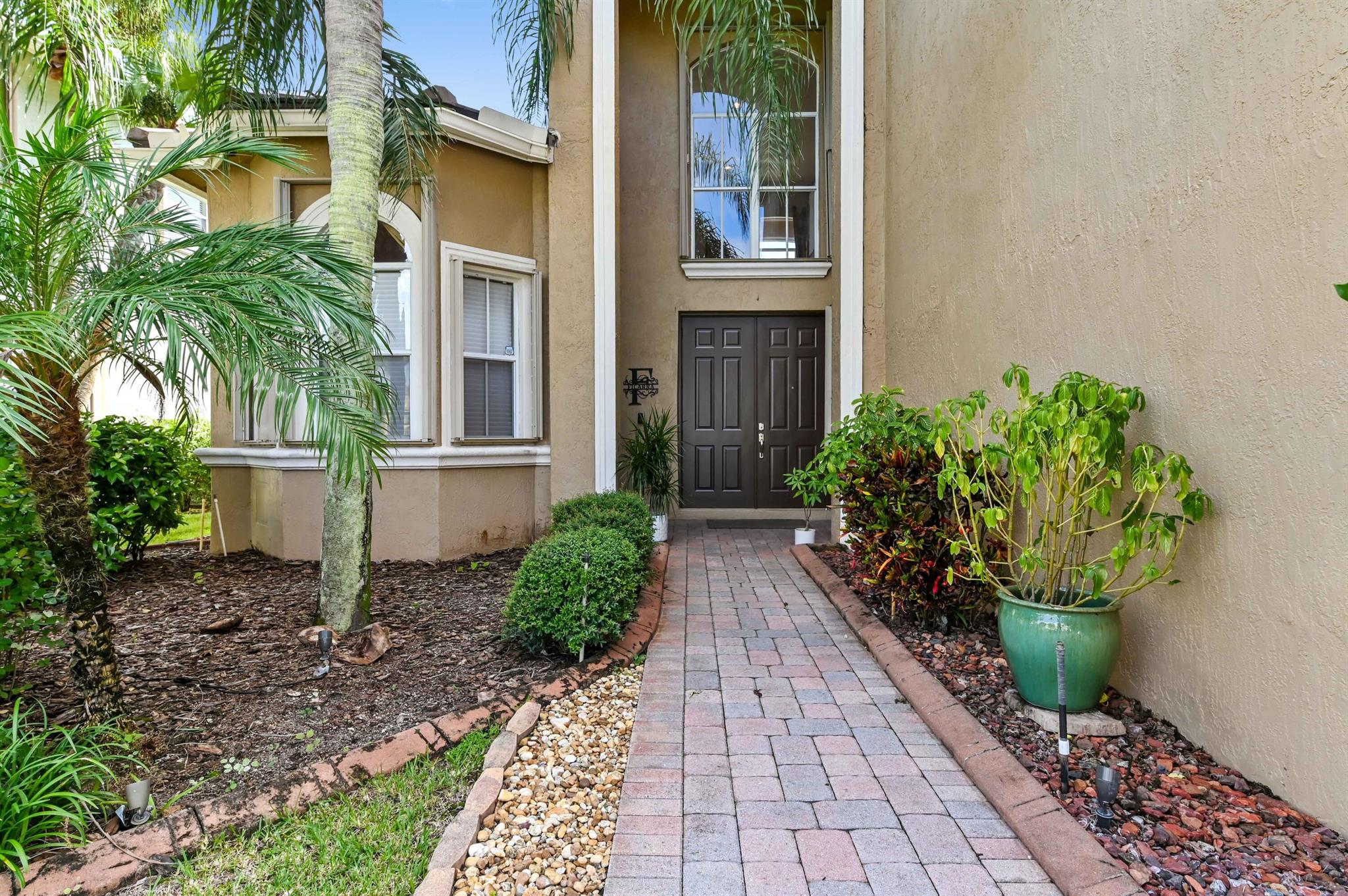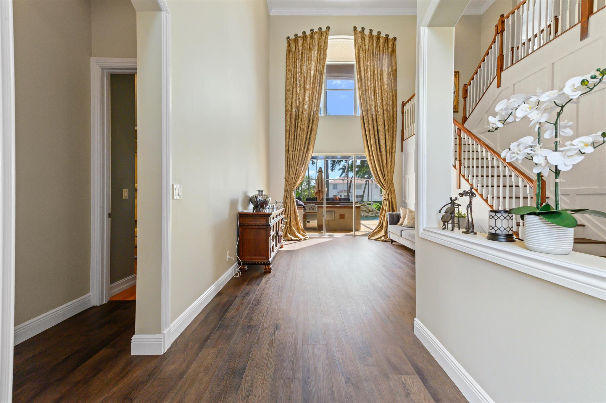 Welcome to this stunning, executive pool & waterfront home, perfectly situated in the highly sought-after, Journey's End community in Lake Worth. NEW ROOF & AC UNIT!!! The luxury begins the moment you pull up the paver driveway, framed by lush tropical landscaping and a beautiful 3-car garage with arched doors. Step inside to a grand, two-story foyer where you are greeted by rich, dark wood-look flooring and elegant wainscoting that lines the beautiful staircase. The main level is designed for sophisticated entertaining, featuring a formal dining room defined by a sparkling crystal chandelier and tasteful trim work.