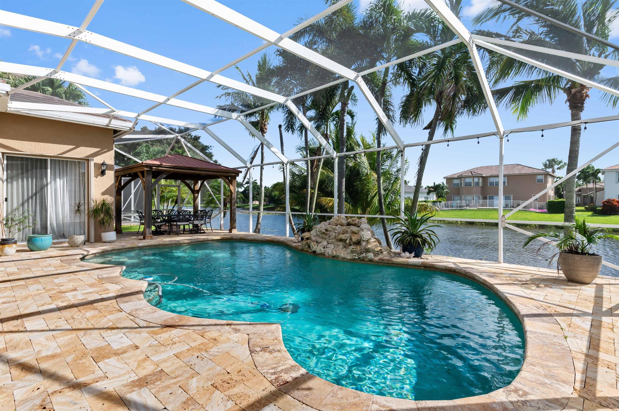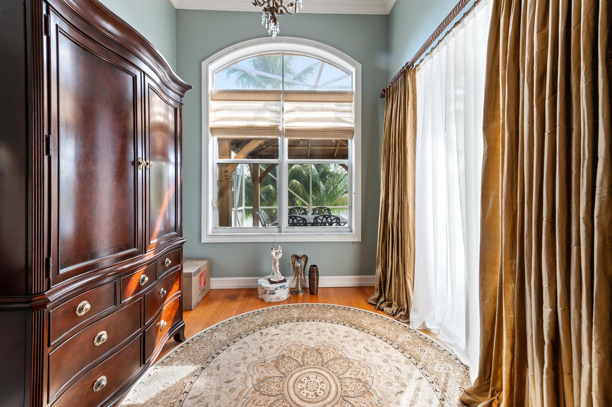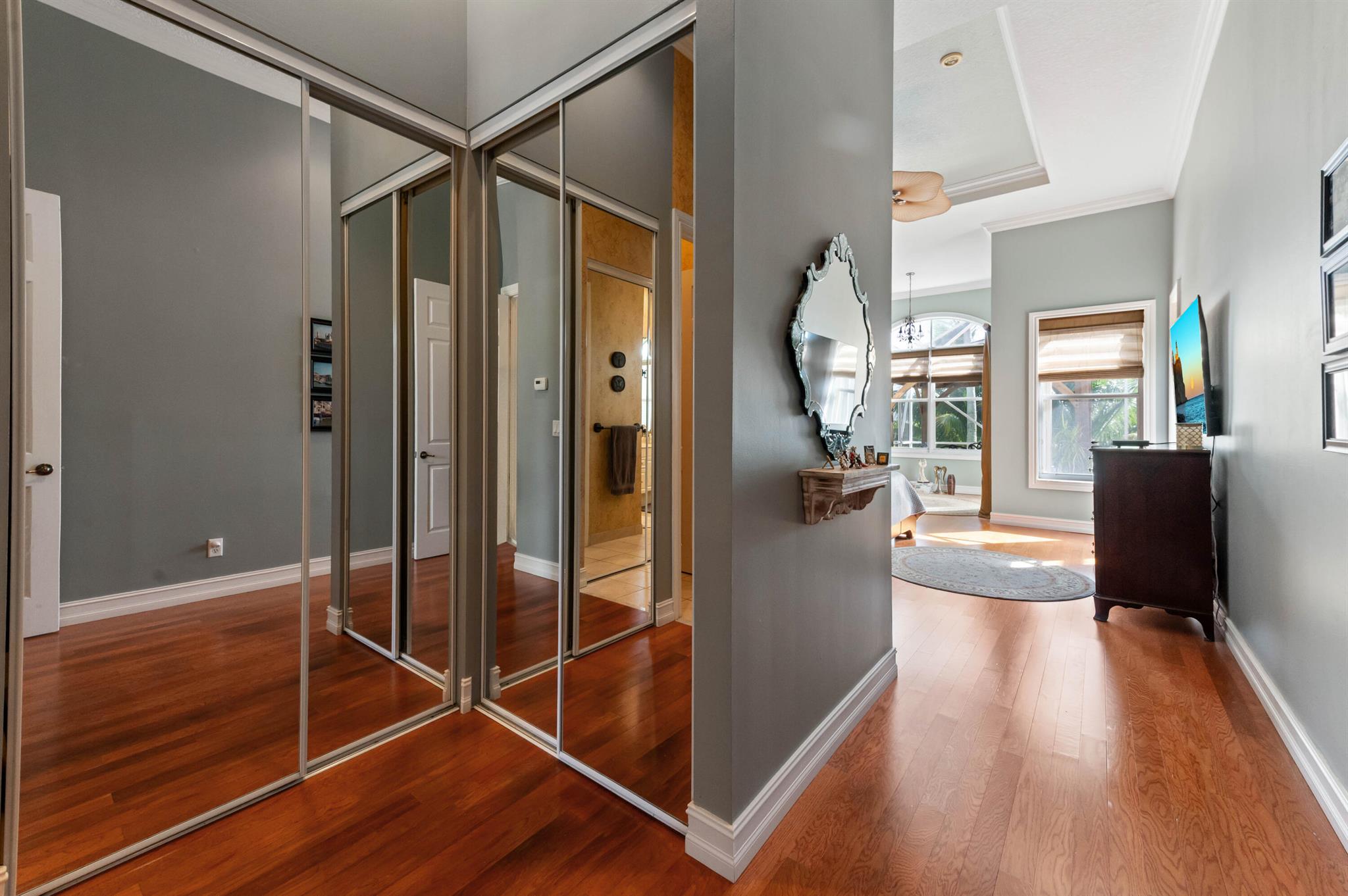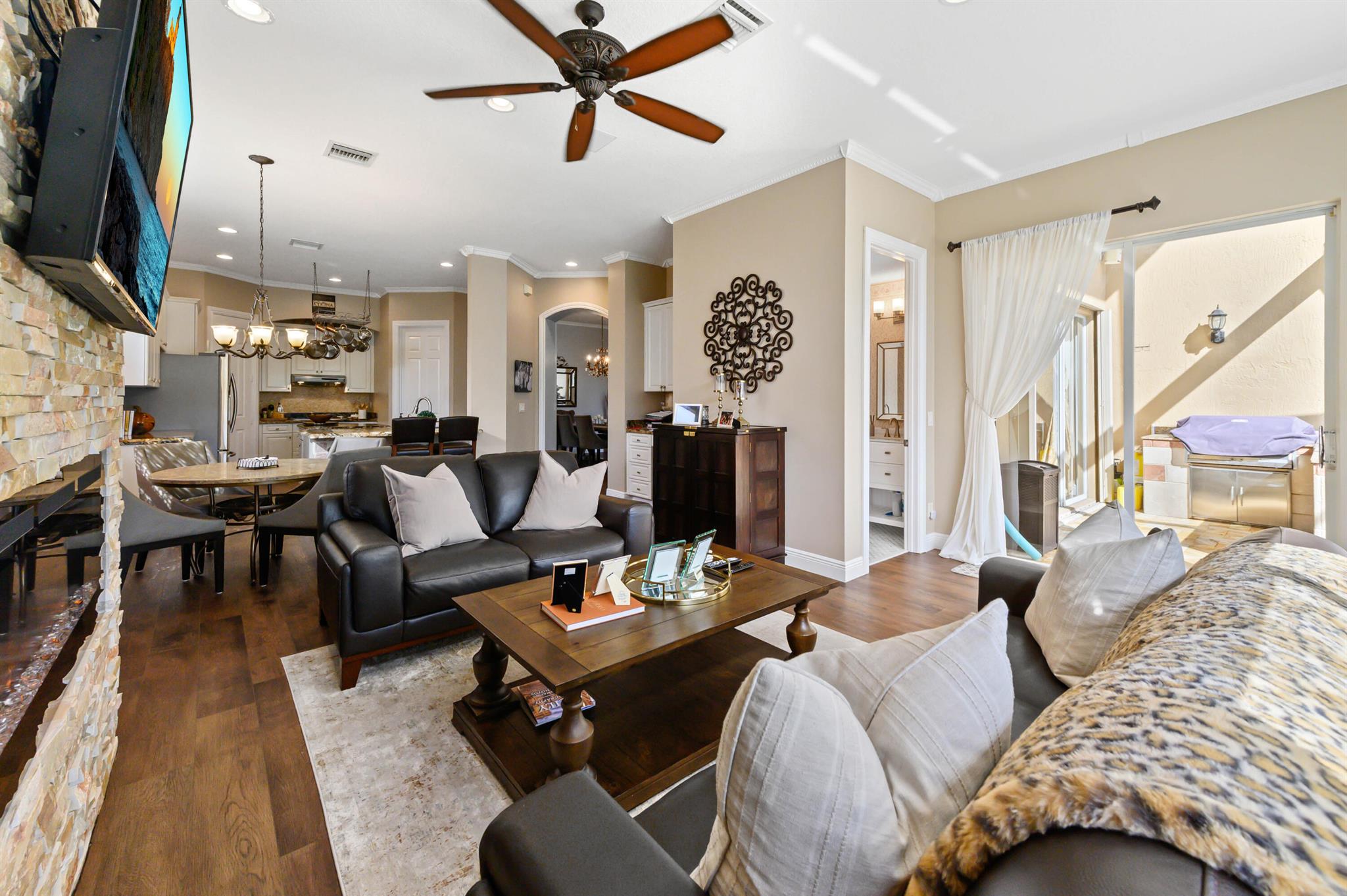 Welcome to this stunning, executive pool & waterfront home, perfectly situated in the highly sought-after, Journey's End community in Lake Worth. NEW ROOF & AC UNIT!!! The luxury begins the moment you pull up the paver driveway, framed by lush tropical landscaping and a beautiful 3-car garage with arched doors. Step inside to a grand, two-story foyer where you are greeted by rich, dark wood-look flooring and elegant wainscoting that lines the beautiful staircase. The main level is designed for sophisticated entertaining, featuring a formal dining room defined by a sparkling crystal chandelier and tasteful trim work.