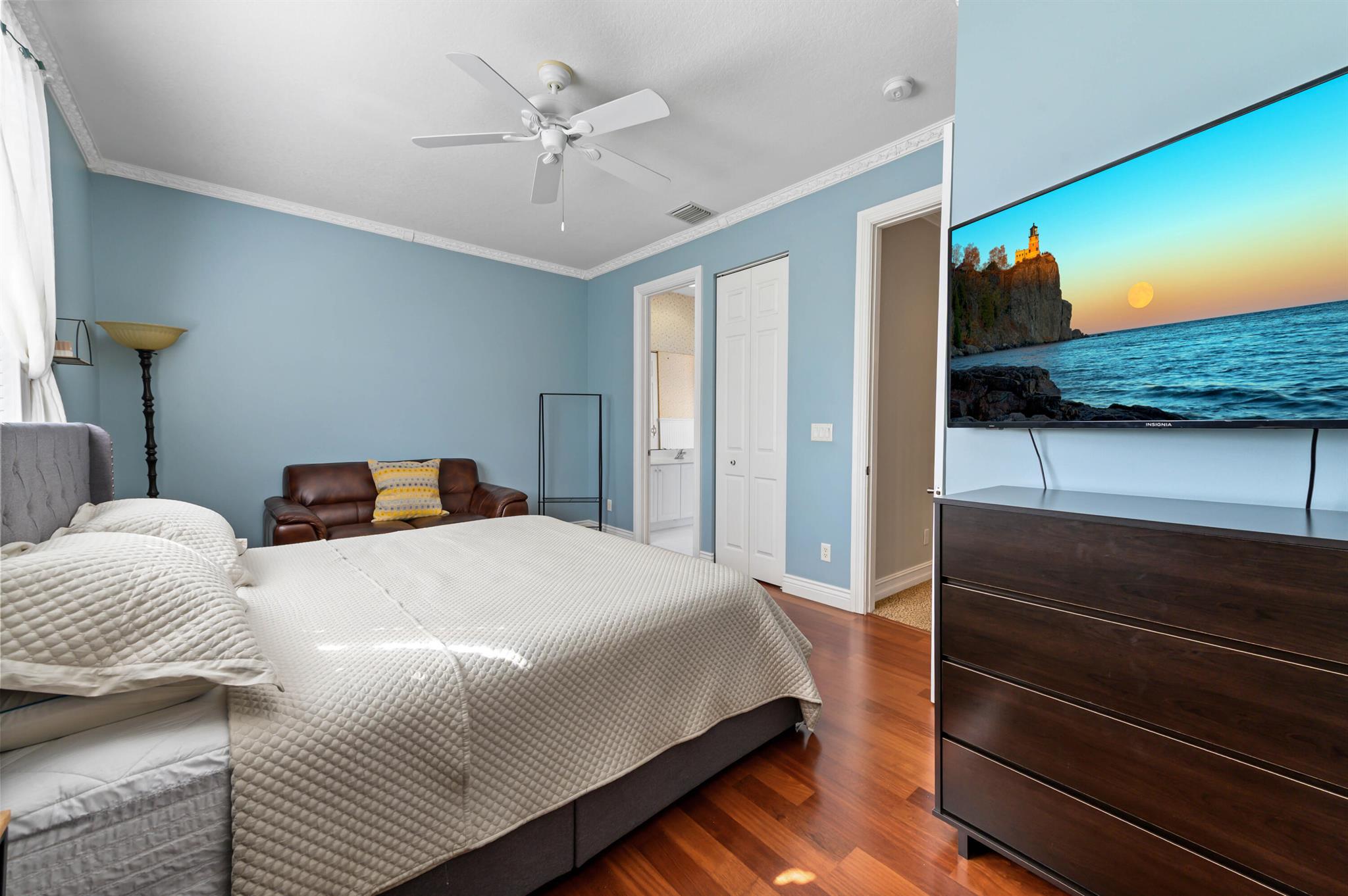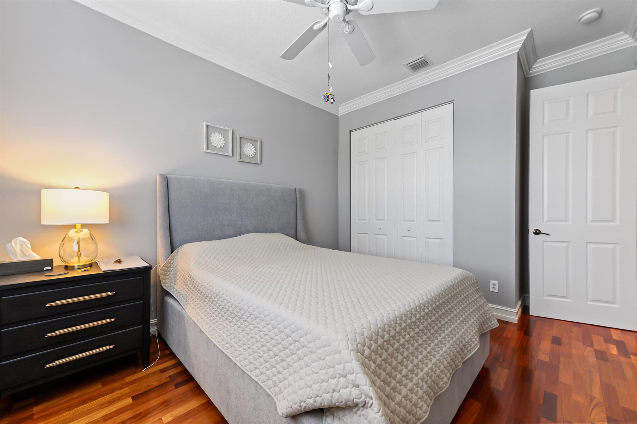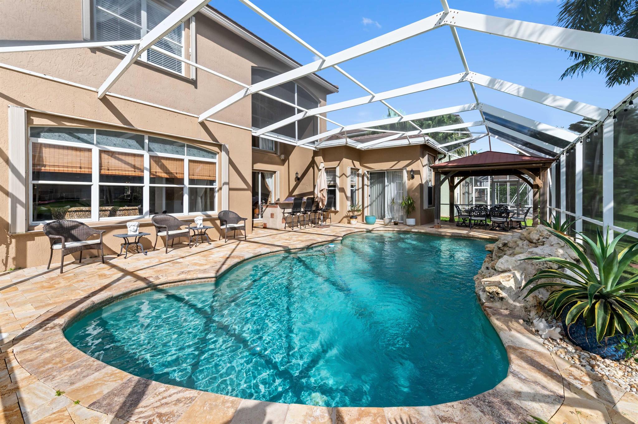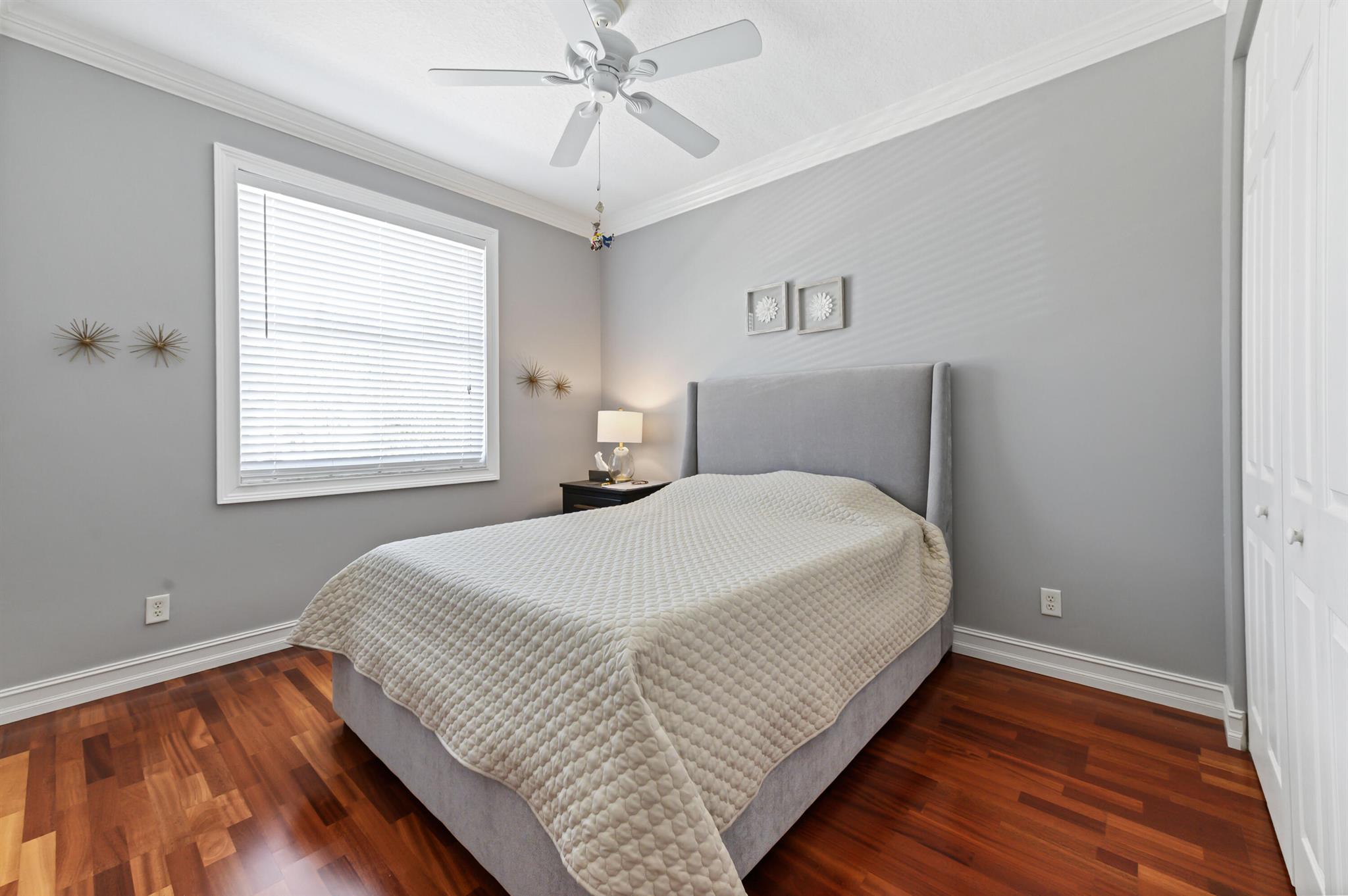 Welcome to this stunning, executive pool & waterfront home, perfectly situated in the highly sought-after, Journey's End community in Lake Worth. NEW ROOF & AC UNIT!!! The luxury begins the moment you pull up the paver driveway, framed by lush tropical landscaping and a beautiful 3-car garage with arched doors. Step inside to a grand, two-story foyer where you are greeted by rich, dark wood-look flooring and elegant wainscoting that lines the beautiful staircase. The main level is designed for sophisticated entertaining, featuring a formal dining room defined by a sparkling crystal chandelier and tasteful trim work.