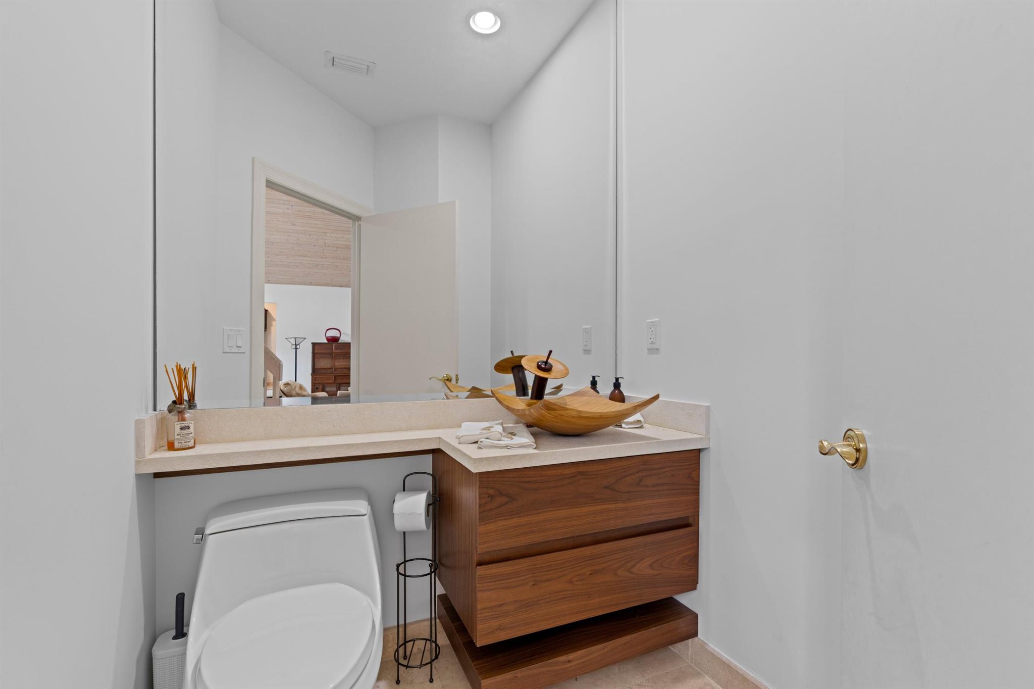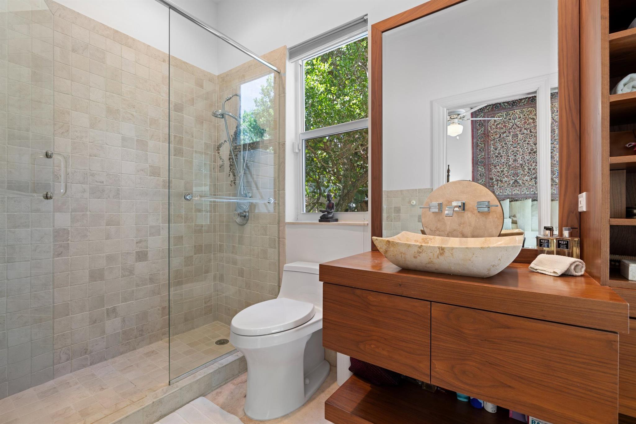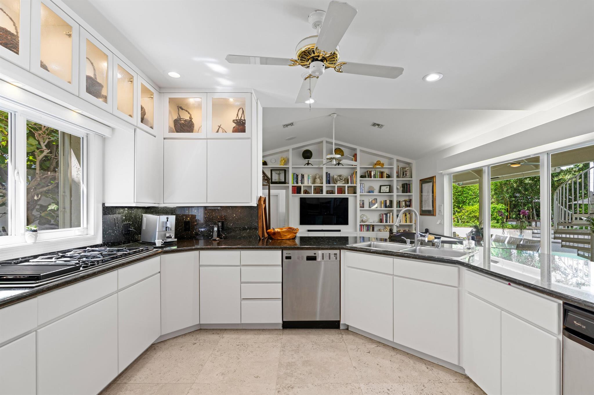 Exuding coastal sophistication, this lushly landscaped four-bedroom estate in prestigious Ocean Ridge combines modern elegance with timeless design. Dramatic vaulted ceilings, polished Saturnia floors, and a striking stone-mantel fireplace highlight the open living spaces, while walls of glass invite natural light and garden views. The expansive yard, surrounded by tropical landscaping with recent upgrades, creates a private oasis. Just three blocks from the beach, this storm-secure home features hurricane-impact windows and a generator, epitomizing refined coastal living.