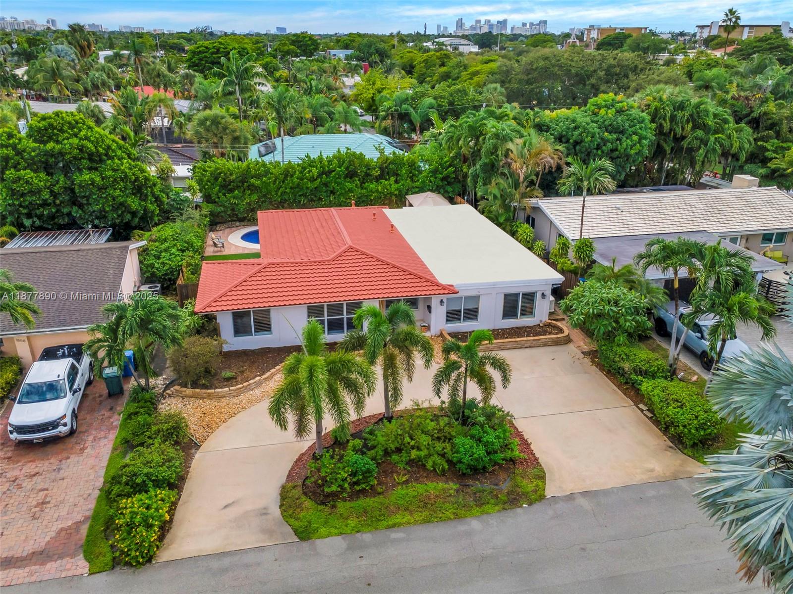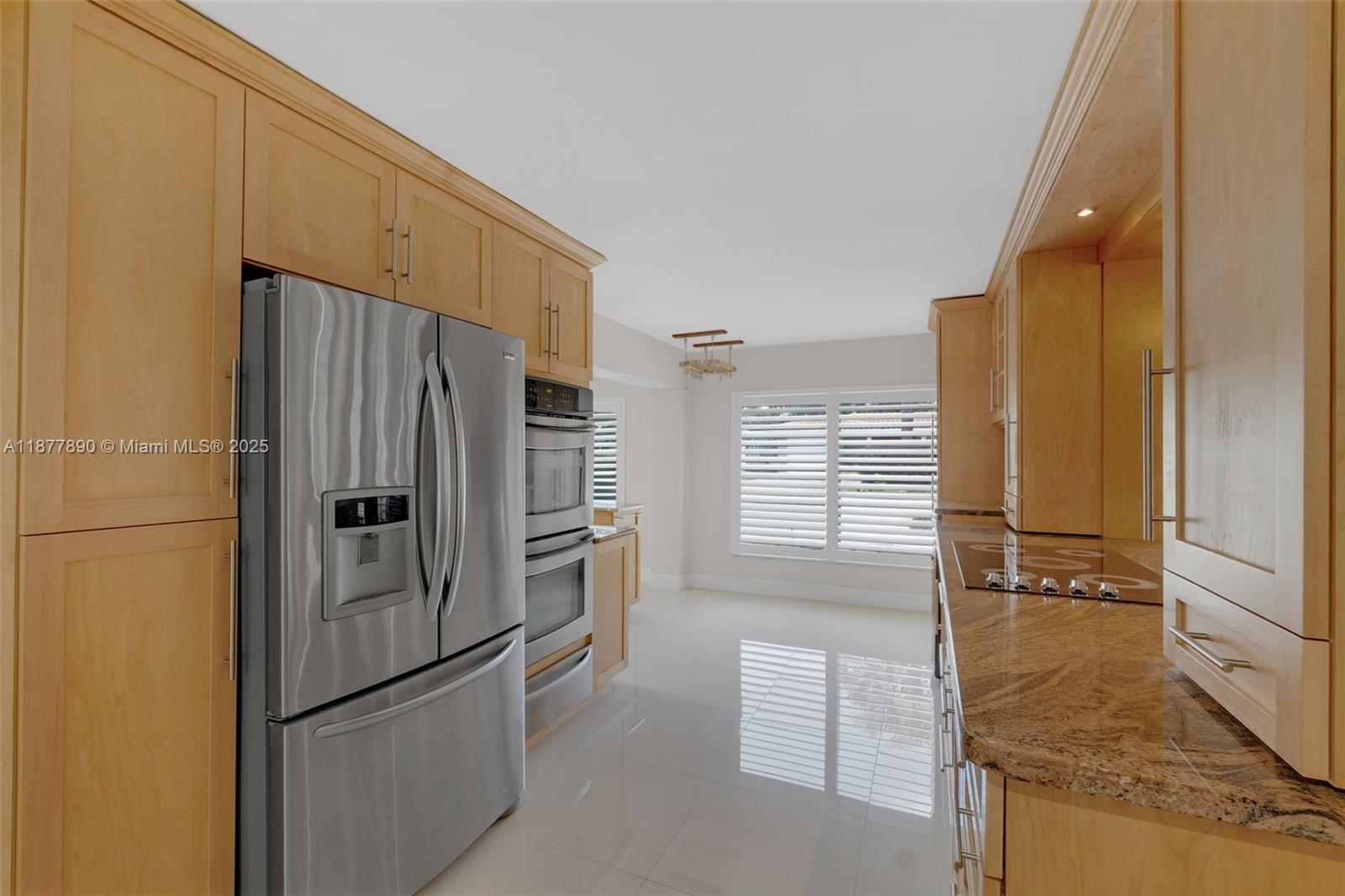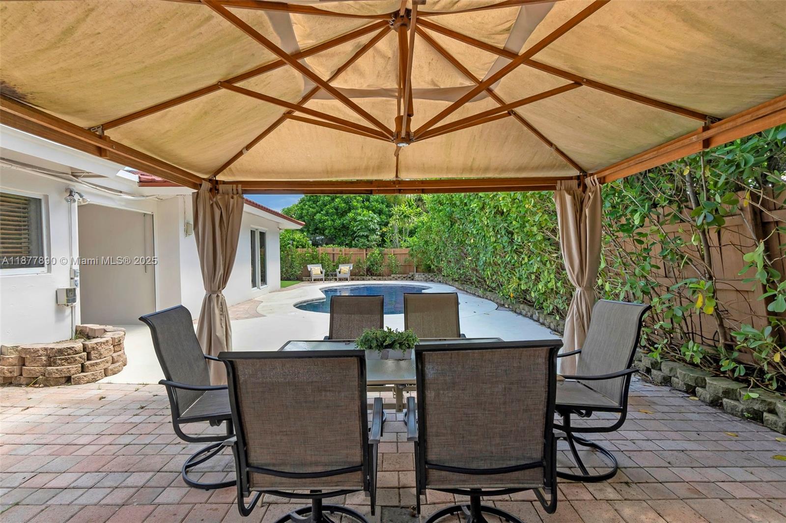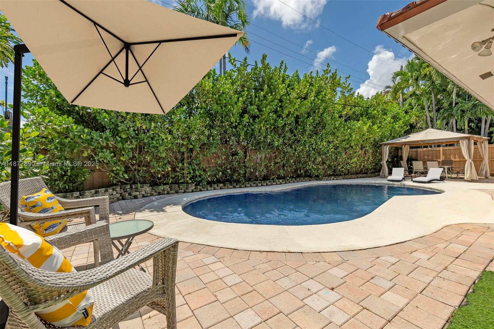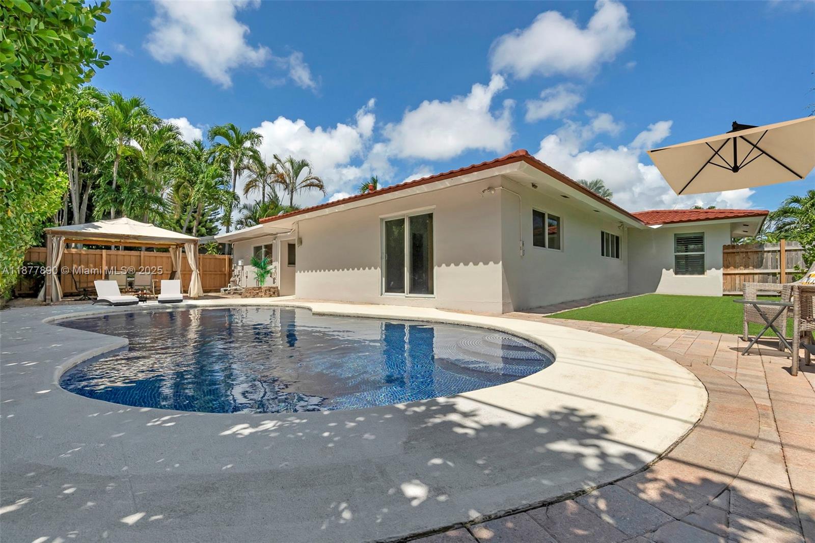 All about LOCATION! This large 3-bedroom (OVER 2000 SQFT), 3-bathroom home features spacious split bedrooms and a large dream kitchen with butler's pantry. Redwood flooring throughout and an open-concept design create spectacular living space. The large backyard is your private resort featuring a fully tiled, heated saltwater pool and large grassy area with cabana. Recent major updates include new metal roof (2021), new A/C (2020), and $30,000 whole-house gas-piped GENERAC generator. Additional premium features include impact hurricane-rated windows and doors, tankless water heater, 2-zone AC, and fully insulated attic. This move-in ready home combines luxury amenities with energy efficiency and storm protection. Motivated seller has already relocated north. Furniture photoshopped!