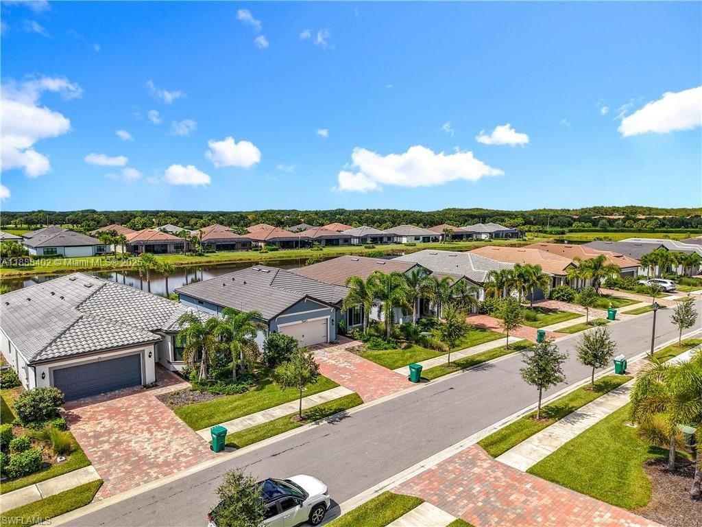 Upgraded Prosperity floor plan with 2 bedrooms, 2 baths, and den. Features include epoxy garage floors with storage, gourmet kitchen with built-in stainless appliances, quartz counters, and family room with custom TV wall. Owner’s suite offers a spacious bedroom and frameless glass shower. Plantation shutters throughout. Extended screened lanai has outdoor kitchen with Thor appliances; rear includes hurricane roll-down shades. Located in Del Webb Naples, a 55+ community with two clubhouses, pools, fitness, dining, pickleball, tennis, bocce, garden, trails, and optional golf.