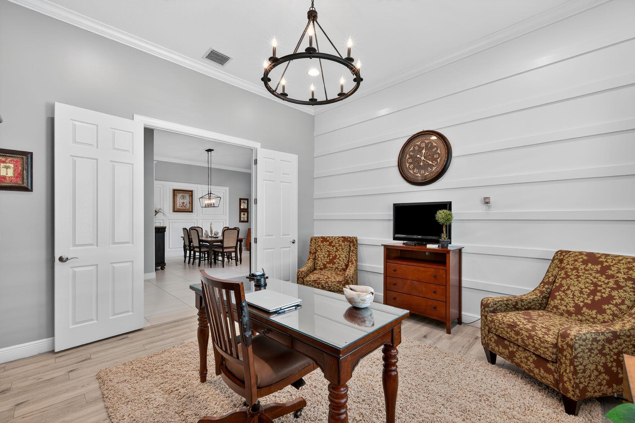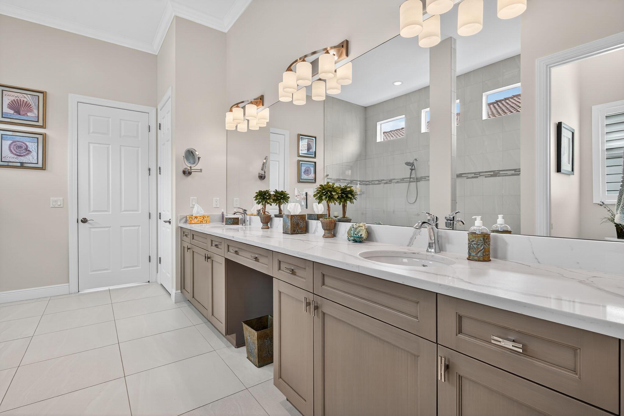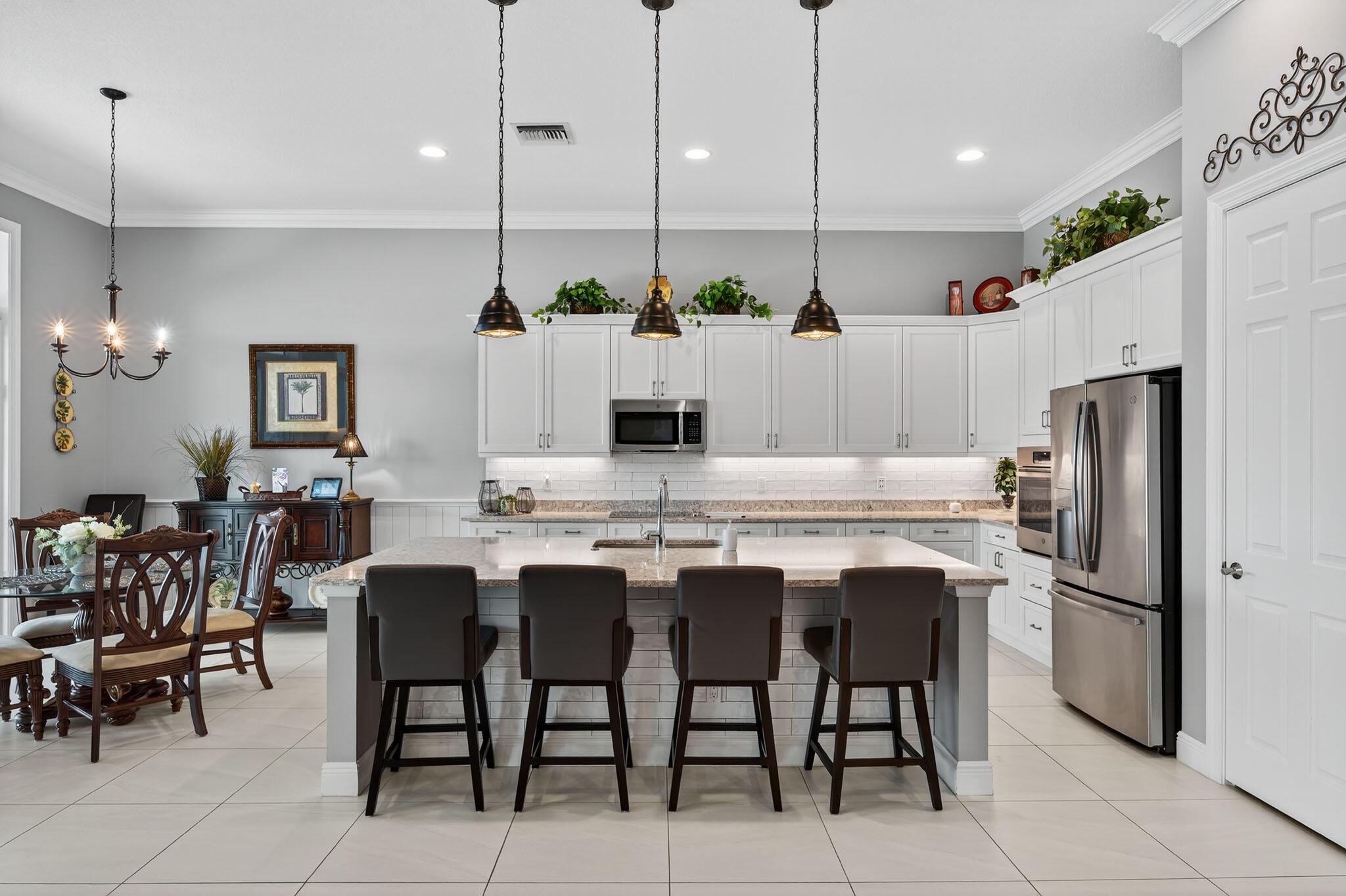 Enjoy luxury living in this beautifully upgraded 3,000sft home, located in prestigious PGA Verano golf community. Step inside to discover a bright open floor plan fully tiled throughout, enhanced by crown molding and custom wall moldings in the dining room and den. Plantation shutters, upgraded fans, and designer light fixtures add a refined touch throughout the home. The spacious open-concept kitchen features a massive quartz island, sleek white cabinetry, wall oven, and stainless steel appliances--a chef's dream and an entertainer's delight. Enjoy outdoor living year-round with the screened-in pool with solar-heat and electric heat backup! The expansive lanai affords privacy complete with electric-powered storm screens for added weather protection. This property backs up to a wide canal