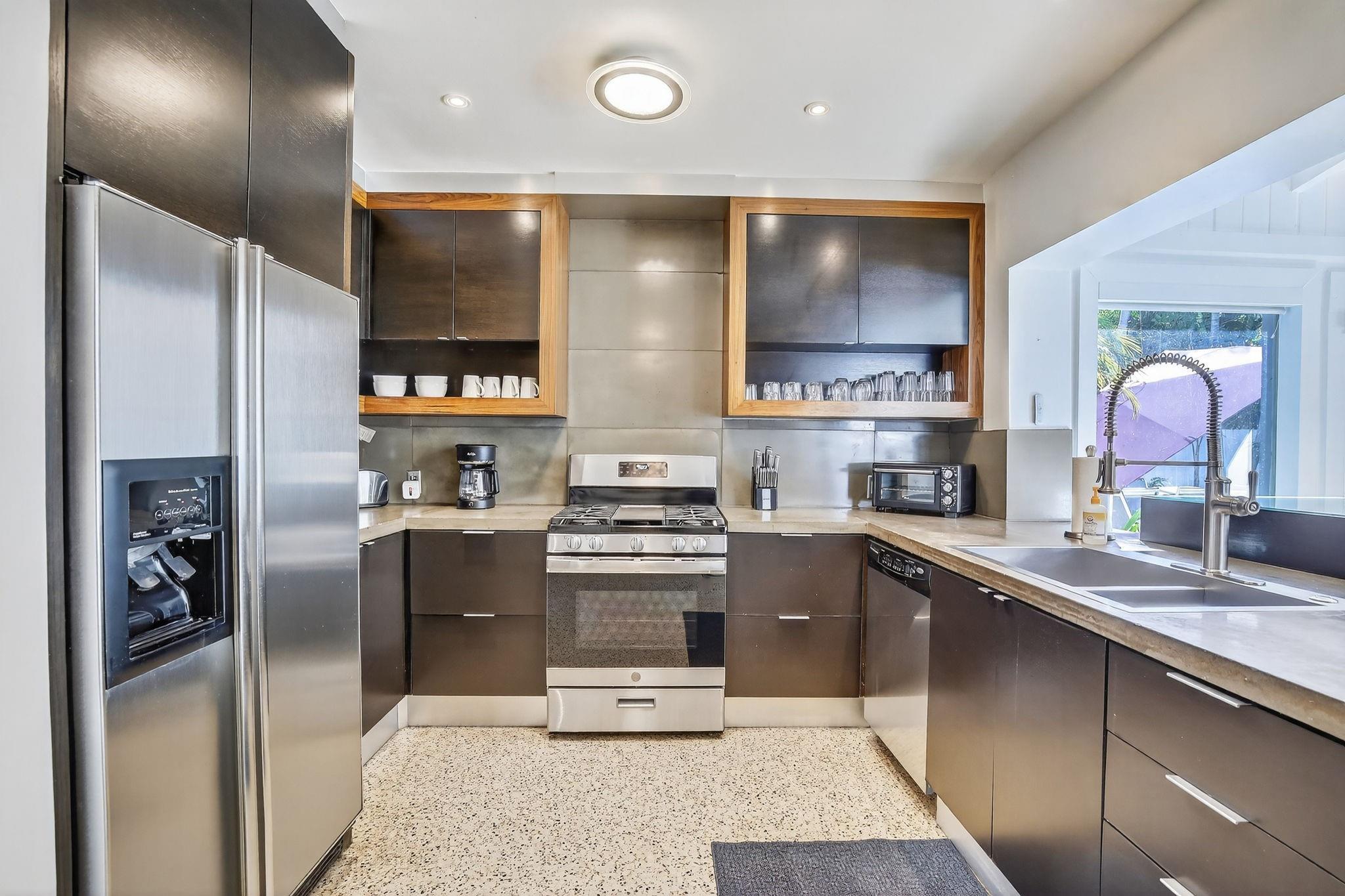 This stylish 3BR/2BA home blends comfort, charm, and modern convenience. Recent upgrades include a metal roof (2022), fully paid-off solar panels (2022), updated electrical (2022), and a resurfaced pool (2022). Bright open layout with vaulted ceilings and French doors creates seamless indoor-outdoor flow to a lush backyard oasis. Features impact windows & doors, two A/C units (one 2022), gas cooking, new attic insulation (2025), and hard-wired detectors. Offered turn-key, furniture negotiable!