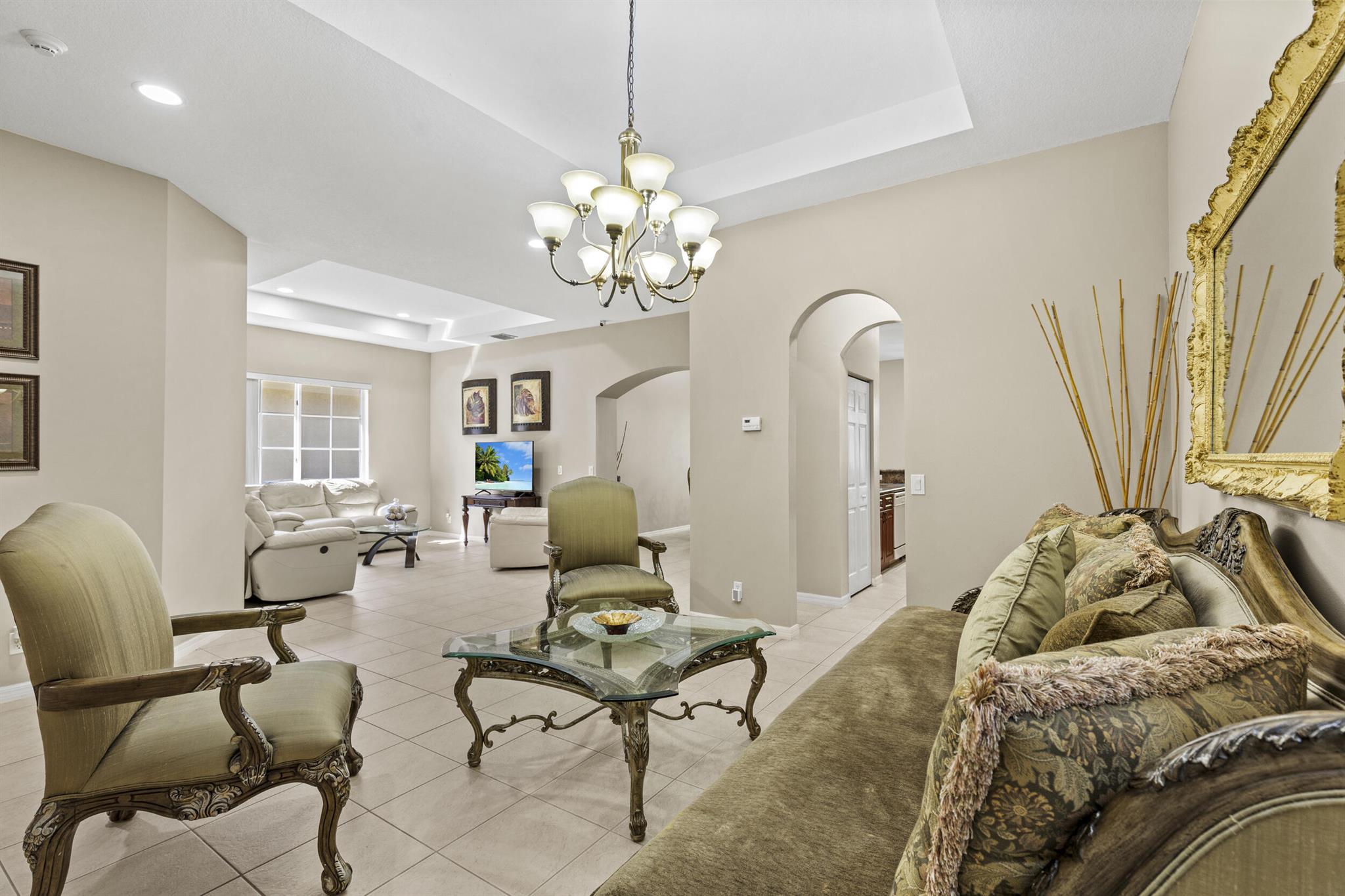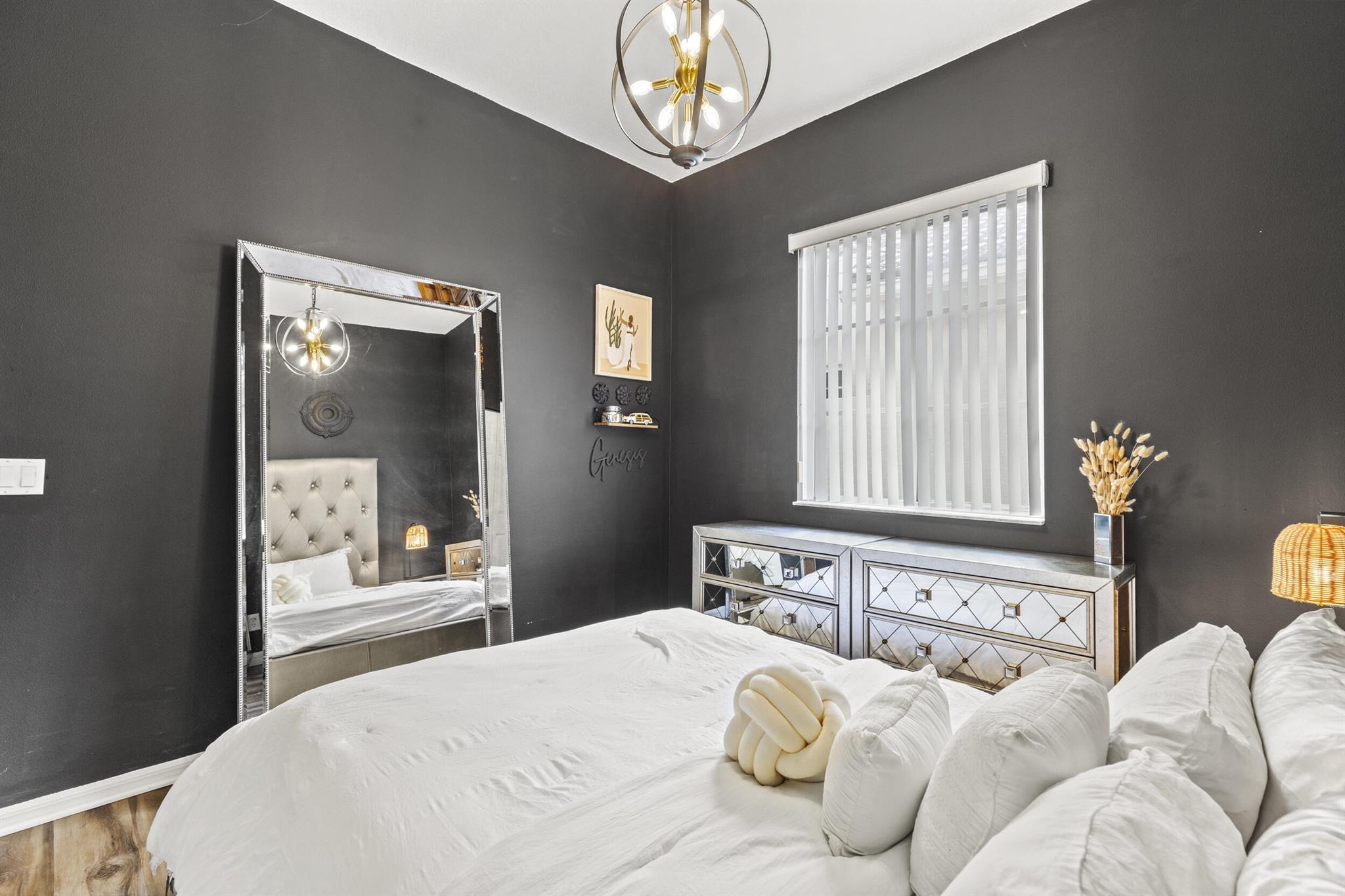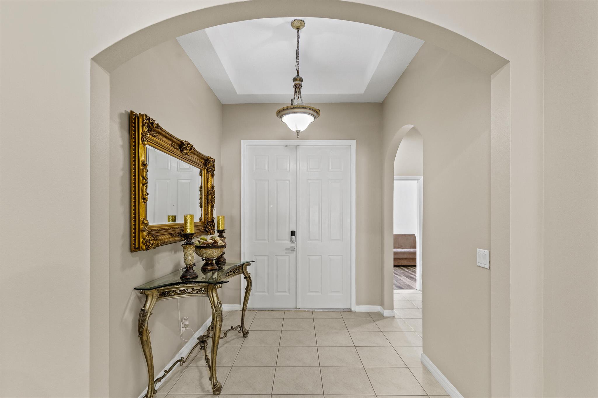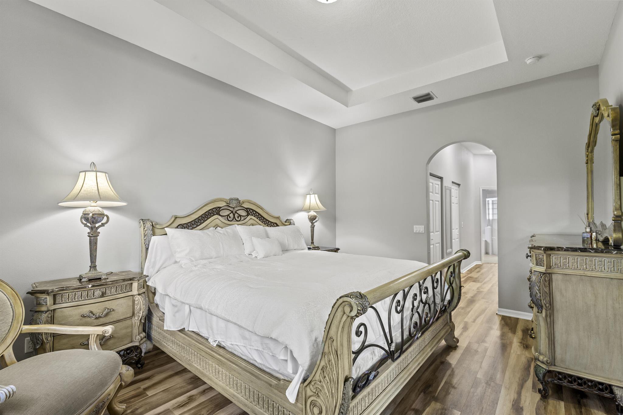 Immaculate move in condition 4 bedroom 3 bath one story home. Large open and flexible living areas plus an open eat in kitchen with a breakfast bar. 3 way split bedroom plan. High ceilings throughout. Primary bedroom has 2 walk in closets, a tray ceiling, plus access to the covered patio. Primary bathroom has a large soaking tub, separate shower, double sinks and a linen closet. Inside utility room with full size washer and dryer. Double door front entry into a spacious foyer. Paver driveway and a 2 car garage with high ceilings for lots of storage. Sidewalks throughout this guard gated neighborhood.Lots of activities at the community clubhouse for all ages. Tennis, pickleball, pool, fitness, playground, ping pong, billiards, cards, banquet hall with a kitchen and management on site.