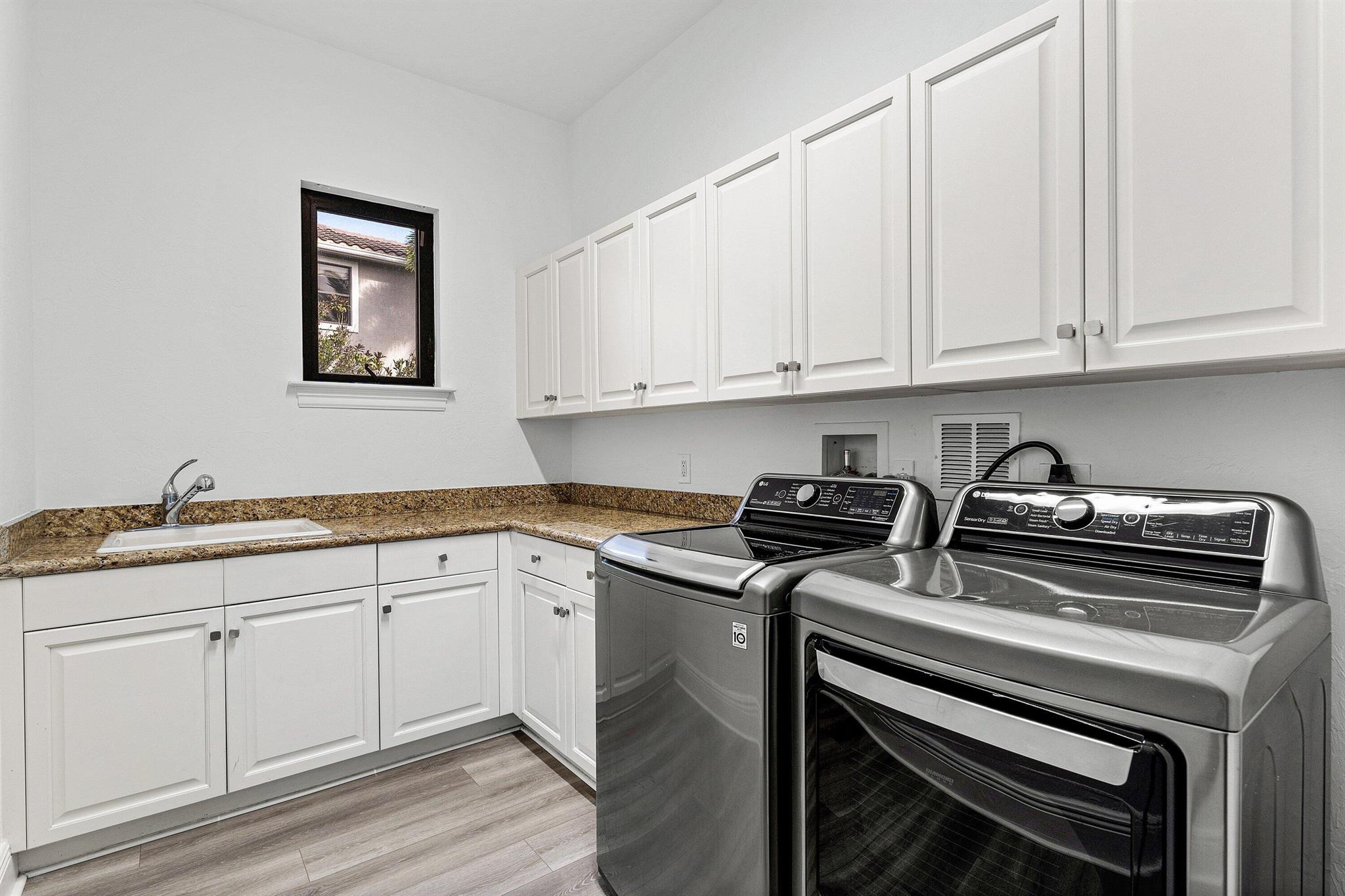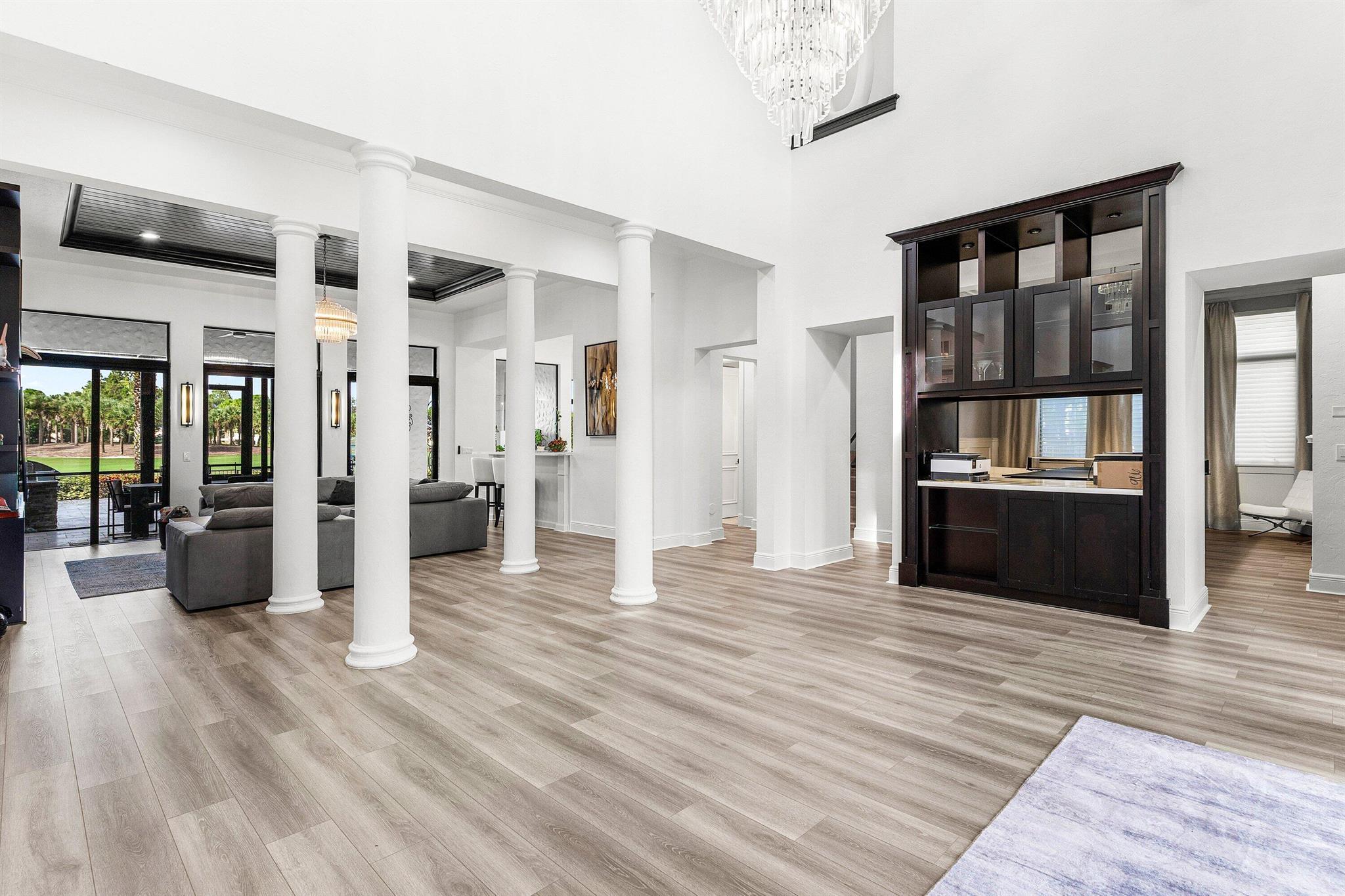 ONE-OF-A-KIND ESTATE IN PARKLAND GOLF & CC W/ STUNNING FAIRWAY & LAKE VIEWS. Expanded Minorca model featuring 6BD, 4/2BA on oversized lot. Primary on main floor w/oversize closet. Remodeled & upgraded. new quartz kitchen counters, double oven, white cabinetry, SS appliances, custom wood wall unit, marble in family room, built-in bar, new flooring in main living areas, contemporary fixtures & window treatments, coffered wood ceilings, wood stairs w/ wrought iron rails, & 2 balconies.Resort-style outdoor living w/ remodeled pool & patio, marble pavers, fire pit, summer kitchen. 6th bedroom doubles as game room or 2nd Primary. Generator &NEW ROOF. Parkland Golf & CC offers world-class amenities: 10 tennis courts, 3 restaurants, full-service fitness, child care, pickle, basketball,& 3 pools