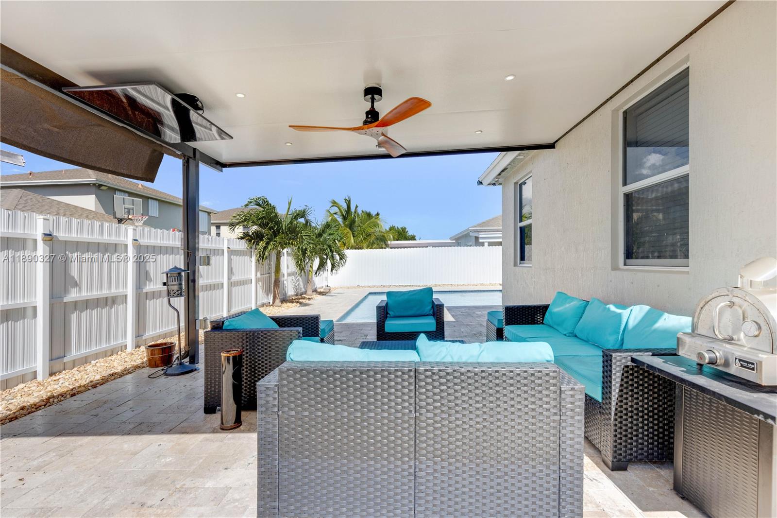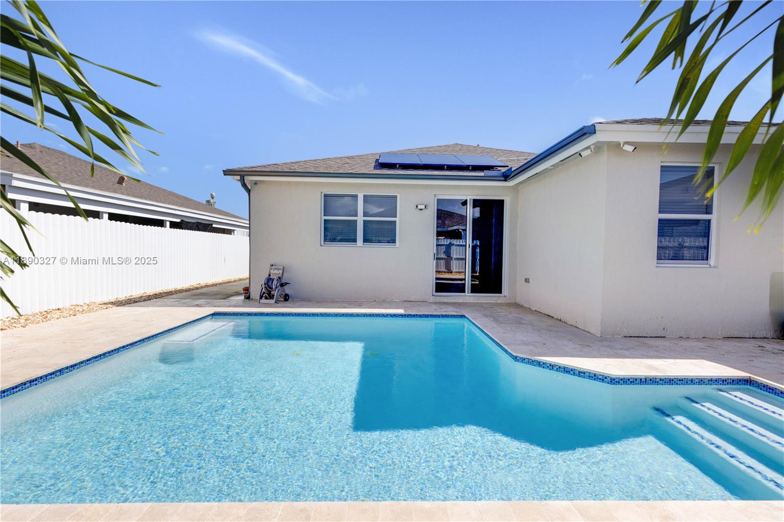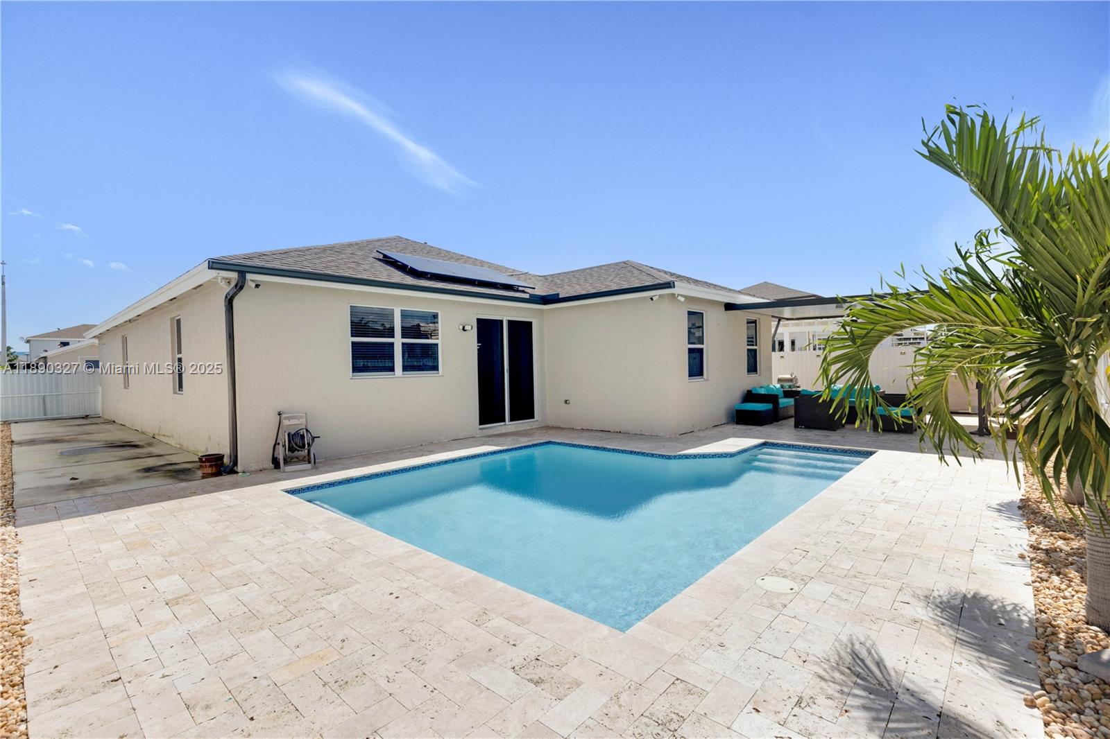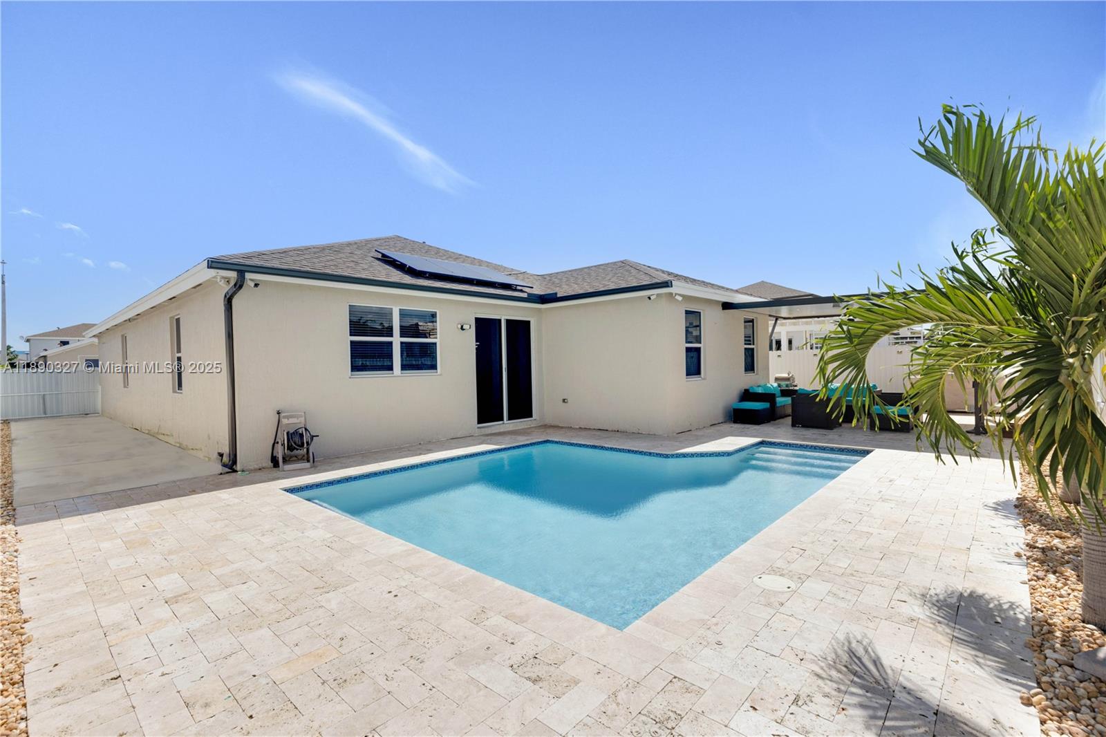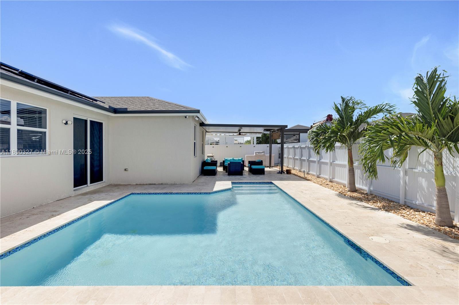 Modern 4-Bed, 2-Bath Smart Home with Pool, Solar Panels & No HOA! This beautifully upgraded residence features ceramic floors, light gray luxury vinyl in bedrooms, brand-new modern lighting, and a stylish kitchen with functional extractor. TVs are pre-wired for seamless entertainment. Outdoors, enjoy a 3-year-old pool, travertine patio, pergola, and ambient lighting, perfect for social gatherings. Security cameras and new solar panels provide peace of mind and energy savings. Ideally located near top schools, shopping, dining, and major highways, this move-in-ready home blends comfort, technology, and modern style, ready to be enjoyed from day one! Easy to show!
