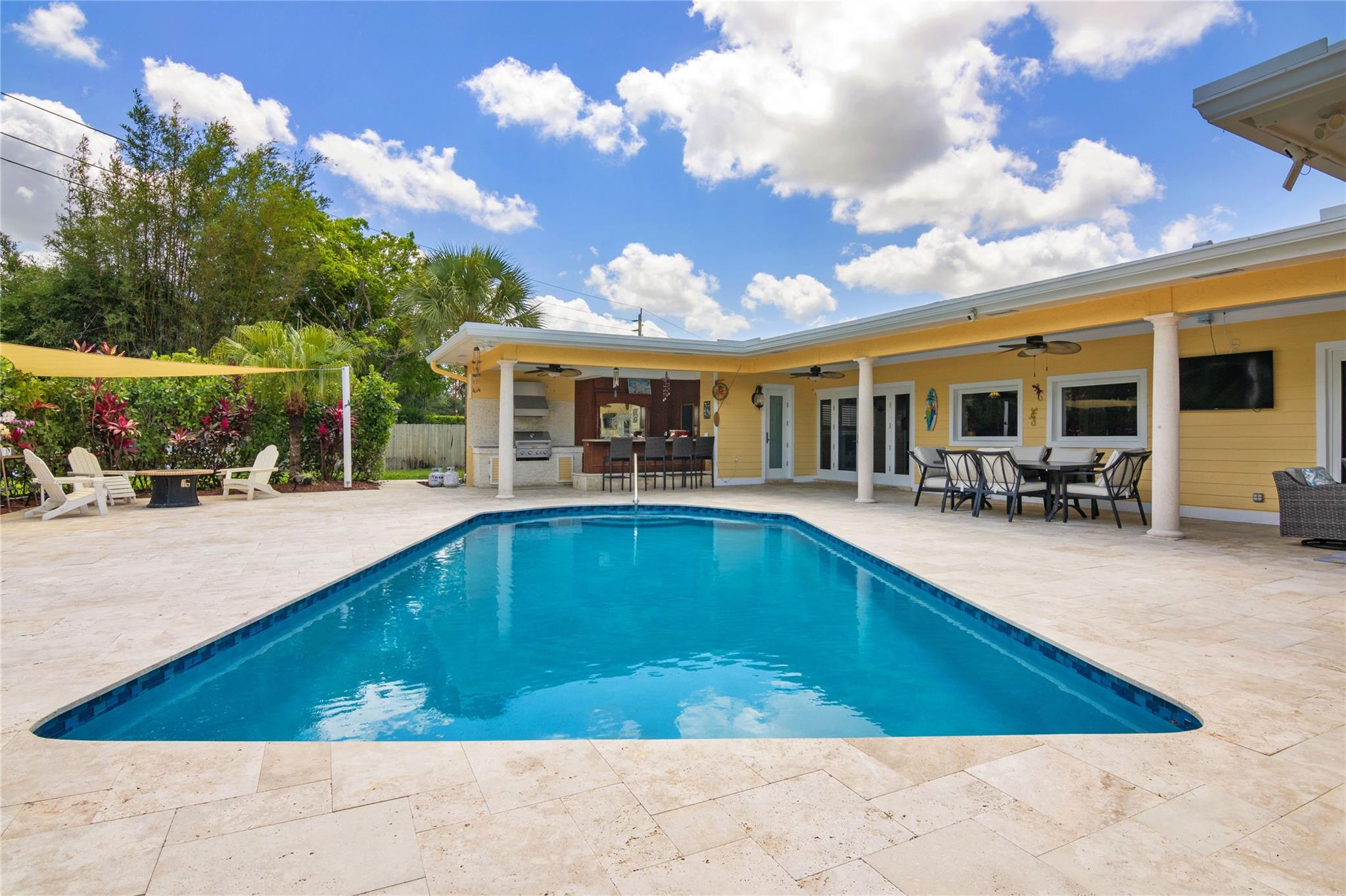 Key West-style smart home on ½-acre in the heart of Weston! Fully updated 4BD/3BA + office with impact glass and impact doors, marble & wood floors. Home has been completely remodeled. Chef’s dream kitchen features oversized island, farmhouse sink, granite counters, SS appliances & custom wood cabinetry. Double dishwashers for entertaining. Big picture windows overlook your private backyard oasis. Master bedroom has spa bath w/ jacuzzi tub, body-spray shower & rain head. Enjoy true indoor-outdoor living: many extended covered patios, summer kitchen, completely remodeled pool, batting cage, workshop, & rec space. Front porch faces peaceful cul-de-sac. Zoned for A+ schools! HOA only $470/yr—includes pool, tennis, pickleball, gym, skating, bowling, parks & more. Garage door is impact rated.
