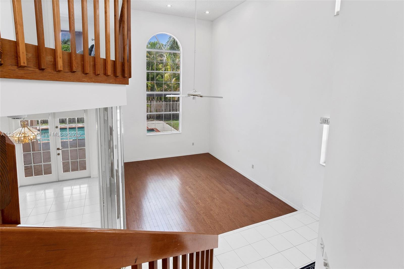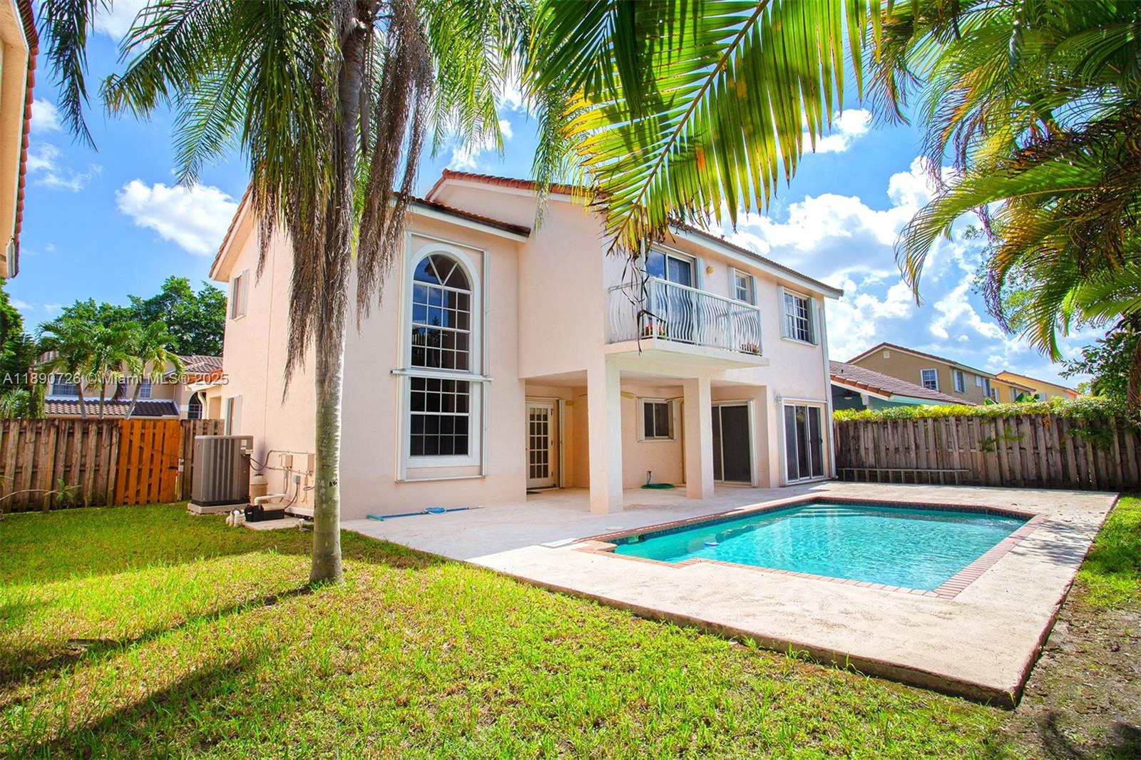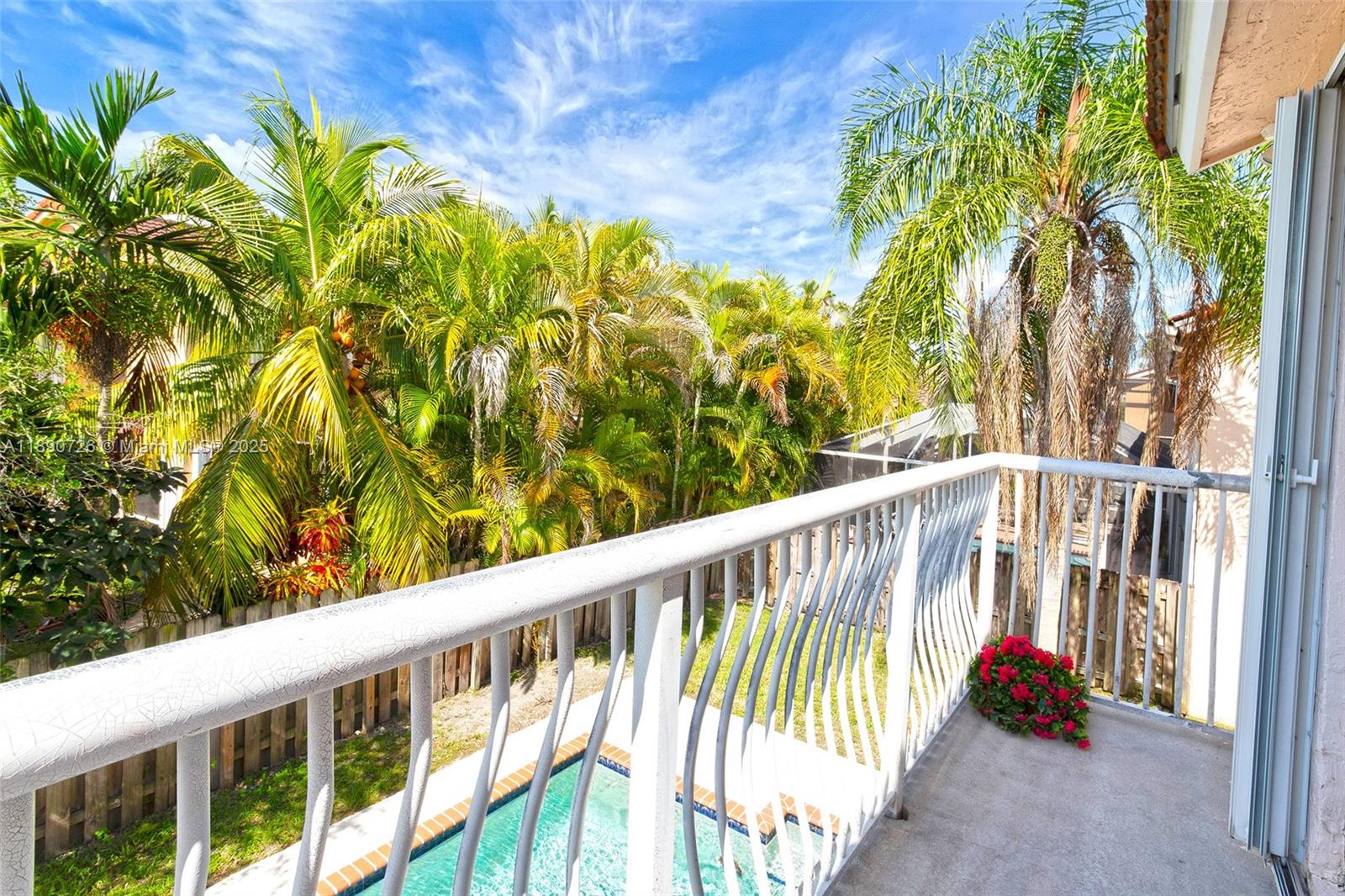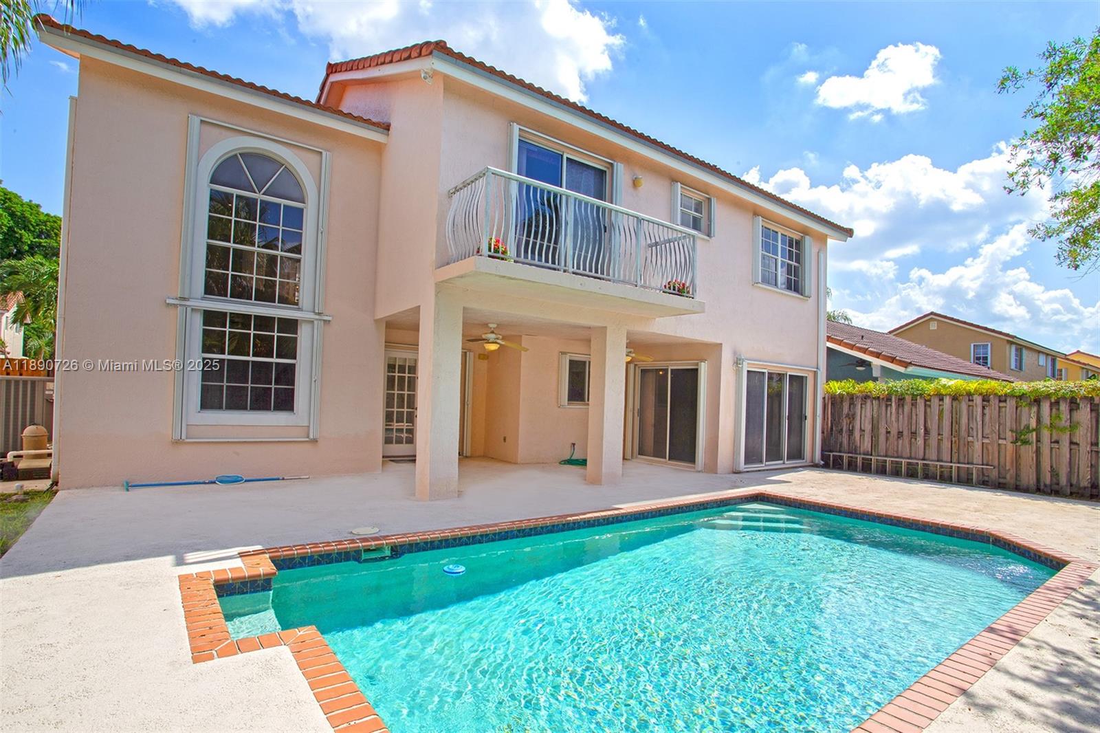 Step through the front door into a soaring, voluminous ceiling and grand arched window that invites natural light to pour in, creating an instant sense of spaciousness. French doors and sliders open to a private pool and patio - ideal for entertaining. Storage abounds: 2 walk-in closets in two bedrooms and 1 wall-to-wall closet in the third. The primary suite has a private balcony. Additional features include a laundry room with a sink, a 2-car garage, a Roman tub, wood floors in the upstairs & living room, and hurricane shutters for all windows & doors, including the garage. All on a quiet street with friendly neighbors in a family-friendly community. Great schools, restaurants & shopping nearby.