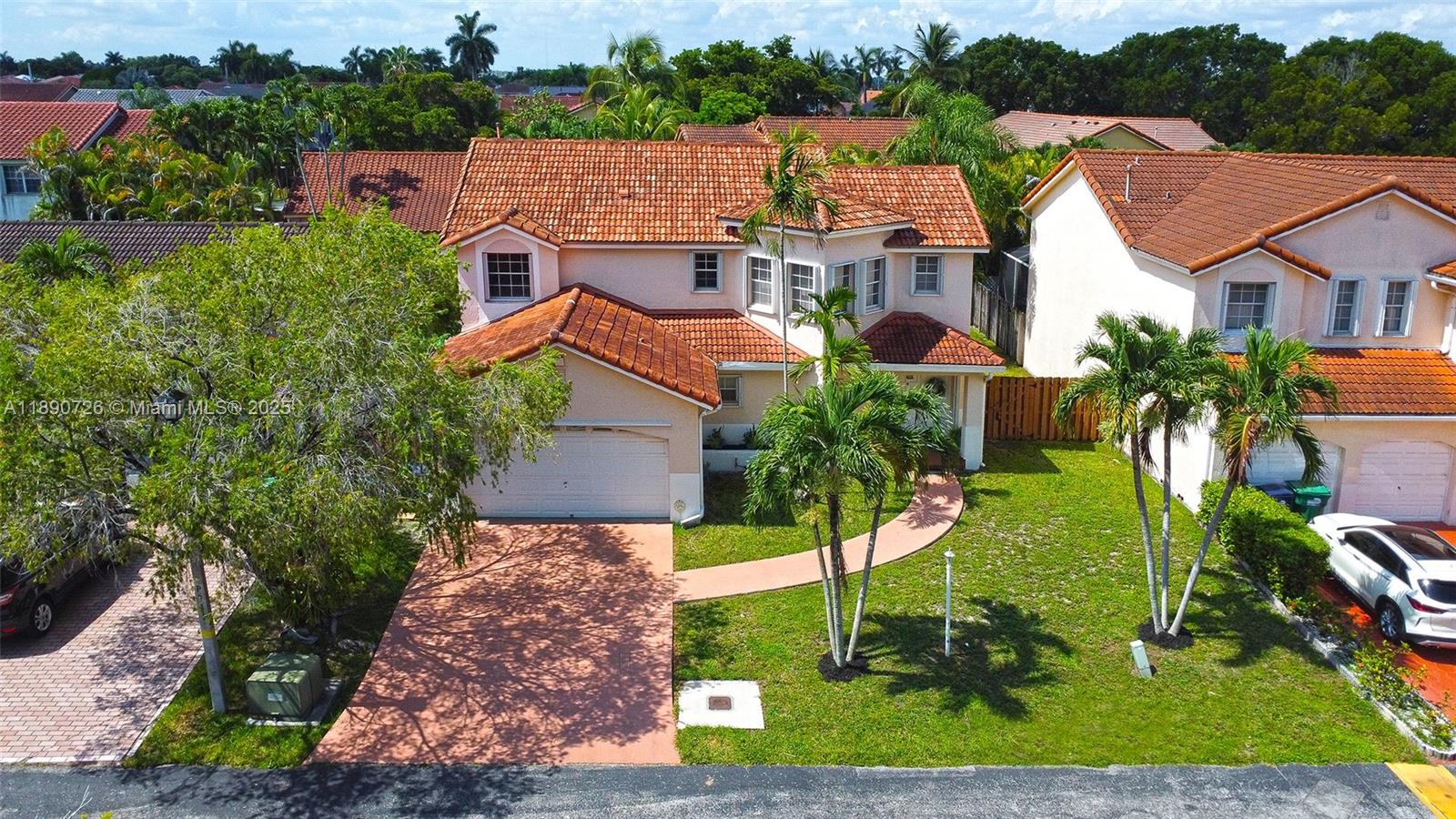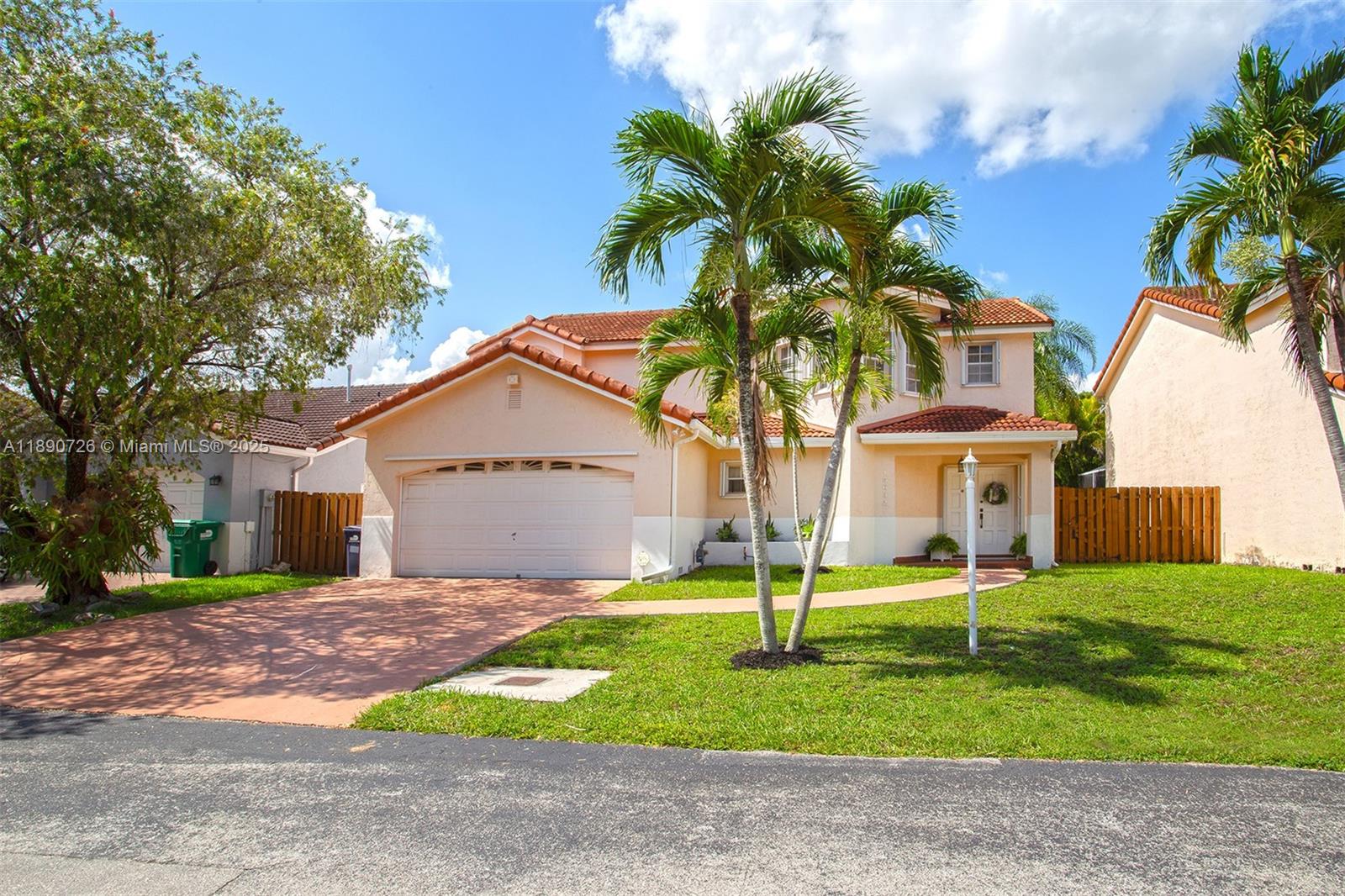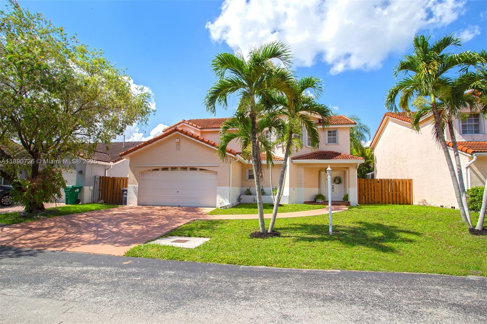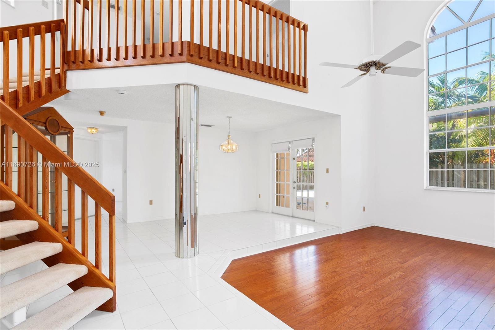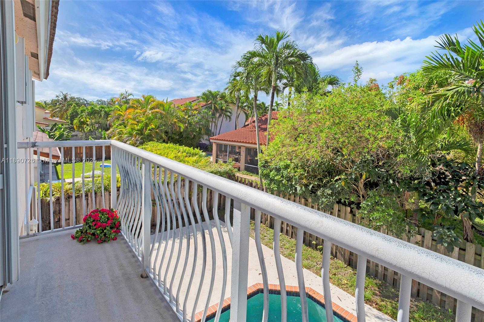 Step through the front door into a soaring, voluminous ceiling and grand arched window that invites natural light to pour in, creating an instant sense of spaciousness. French doors and sliders open to a private pool and patio - ideal for entertaining. Storage abounds: 2 walk-in closets in two bedrooms and 1 wall-to-wall closet in the third. The primary suite has a private balcony. Additional features include a laundry room with a sink, a 2-car garage, a Roman tub, wood floors in the upstairs & living room, and hurricane shutters for all windows & doors, including the garage. All on a quiet street with friendly neighbors in a family-friendly community. Great schools, restaurants & shopping nearby.