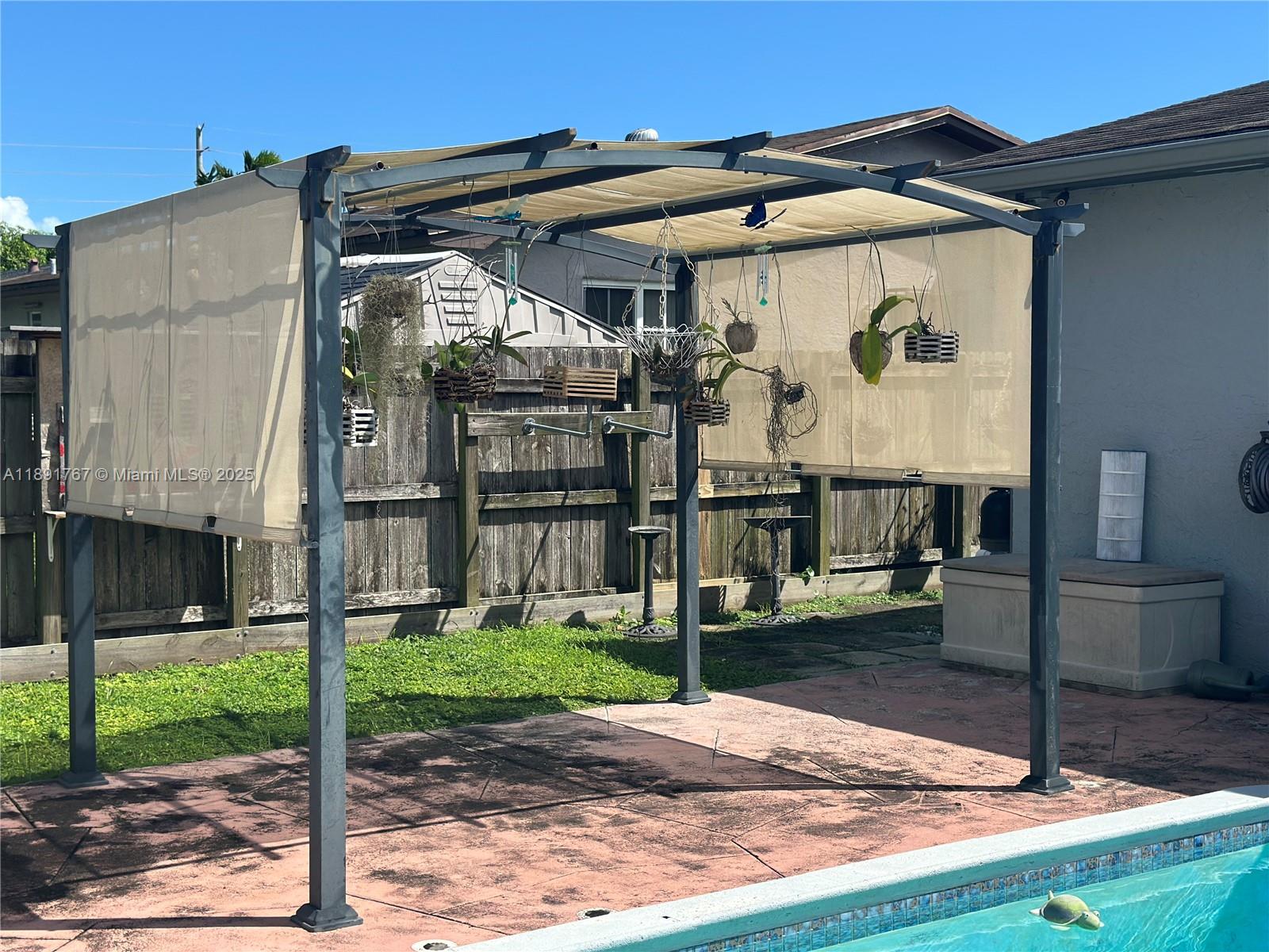 EXCELLENT Opportunity - PRICED TO SELL FAST. NO HOA. This home comes Equipped with Home Theatre system completely wired for speakers and Monitor, CCTV 16 cameras plus monitor with 3 months of rewritable storage. Large Olympic size pool home with 3 bedrooms 2 baths Family room and large Living room on a huge lot 75X100. The spacious fully fenced includes Gazebo and outdoor furniture. New roof Shingle, plus new attic insulation for comfort and efficient utility. Accordion shutters on main Entrance and large Patio opening. All openings have hurricane rated wood panels. Includes an explosion proof Diebold Co. Safe.