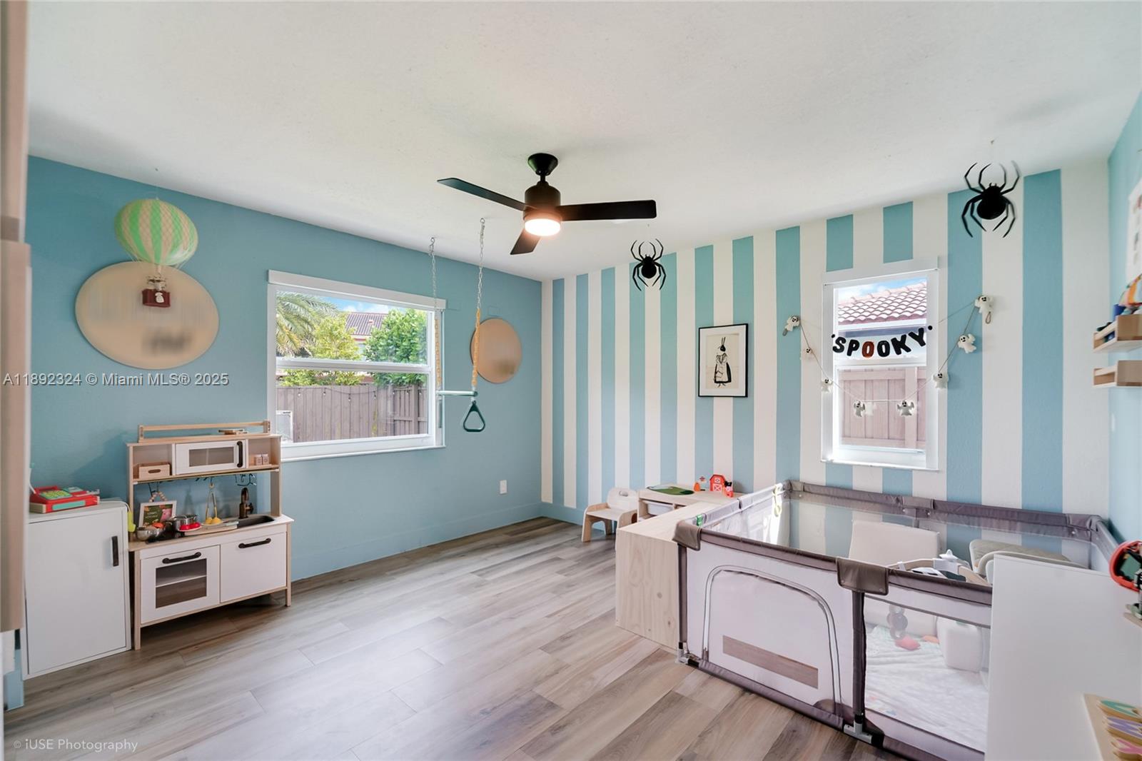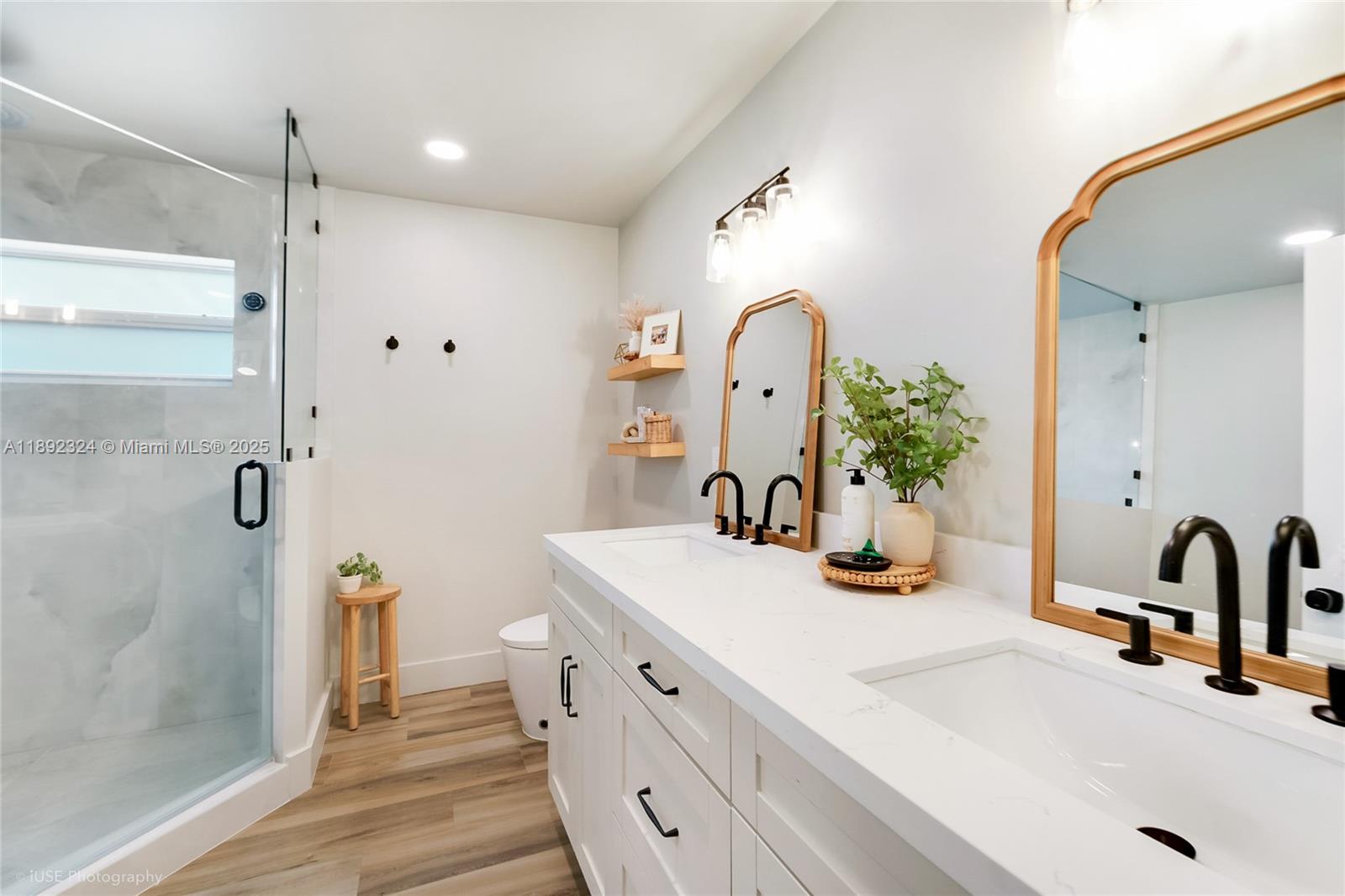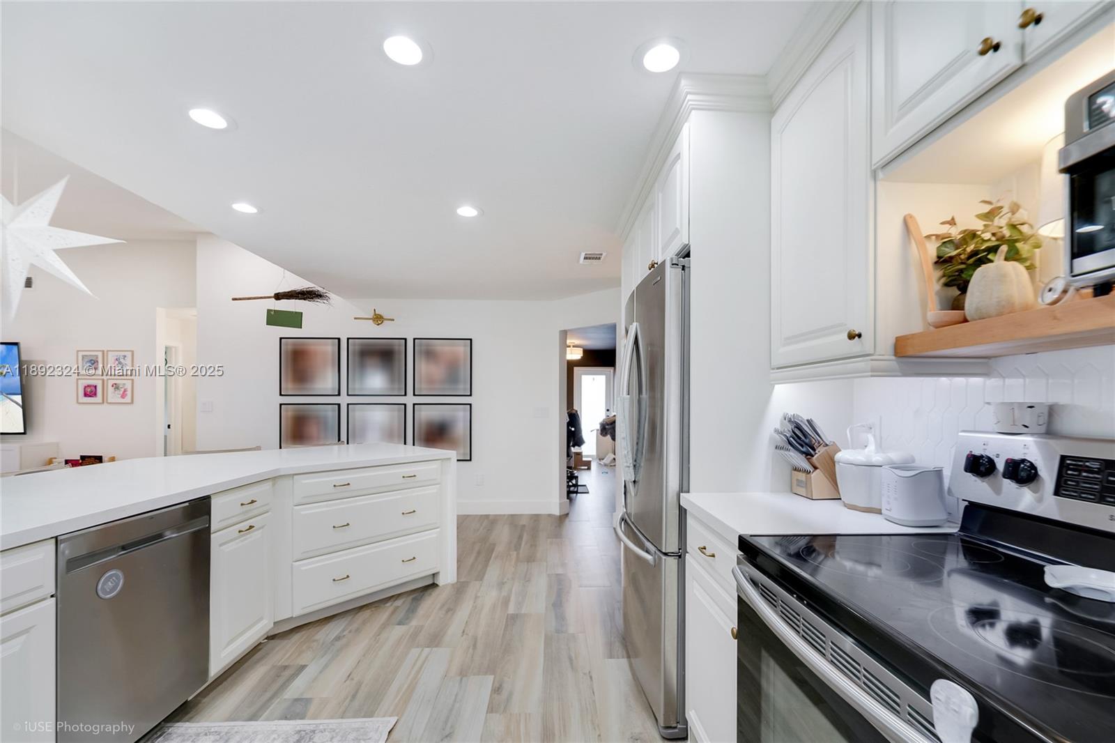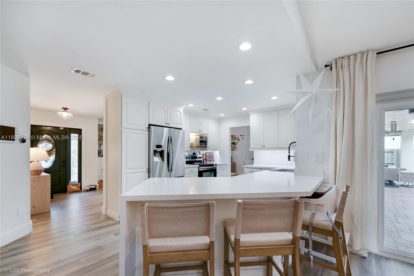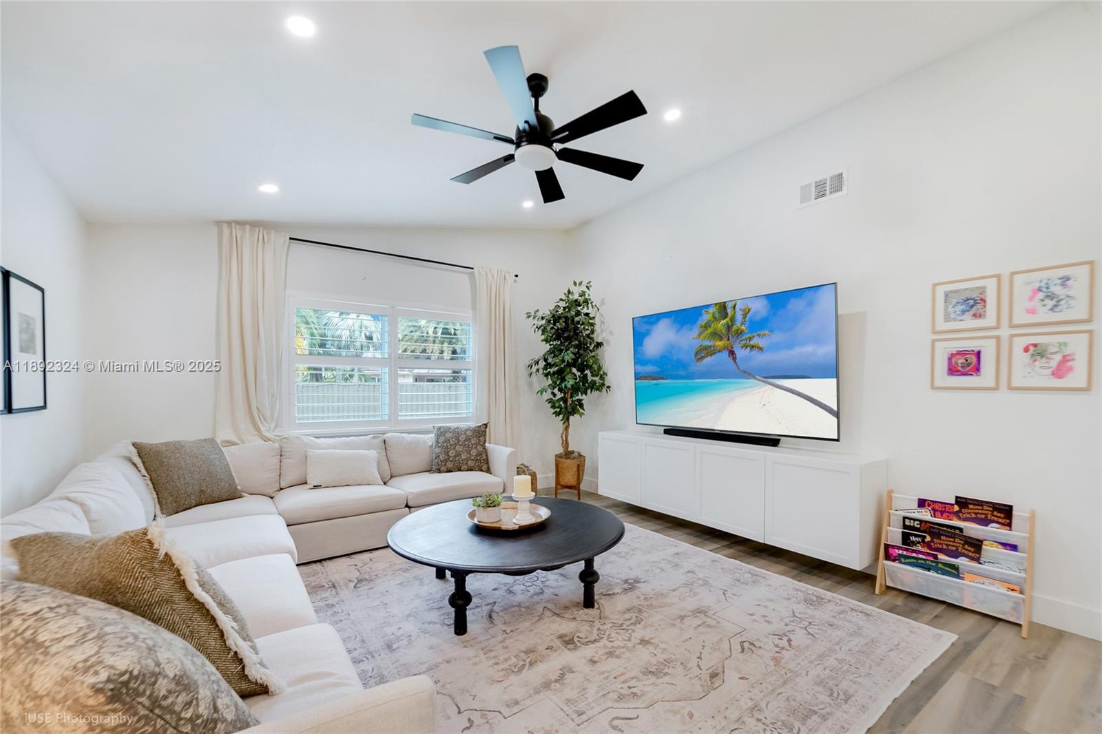 This exceptional home offers style, comfort, and efficiency throughout. Features include tile flooring, quartz countertops in kitchen and bathrooms, and recently refinished kitchen cabinets. The master bathroom has been beautifully renovated, and the reverse osmosis water filtration system adds everyday convenience. Enjoy hurricane impact windows, electric shutters in the 2nd and 3rd bedrooms, foam roof insulation, and Ring security system with cameras and doorbell. Energy-efficient upgrades include a 2024 AC and 2024 water heater. Smart home highlights include a Lutron integrated system for app-controlled lights and fans and a Rain Bird sprinkler system. Outdoor living features a saltwater pool with heater, partial artificial turf, and freshly painted exterior (2024) and interior (2022).