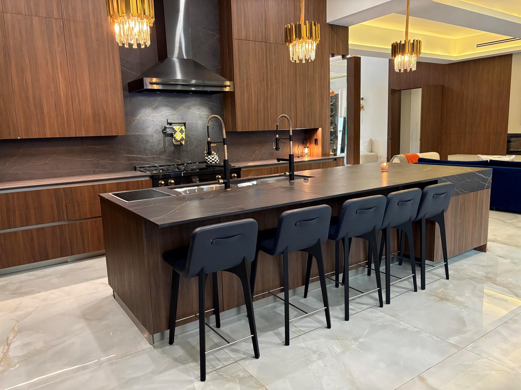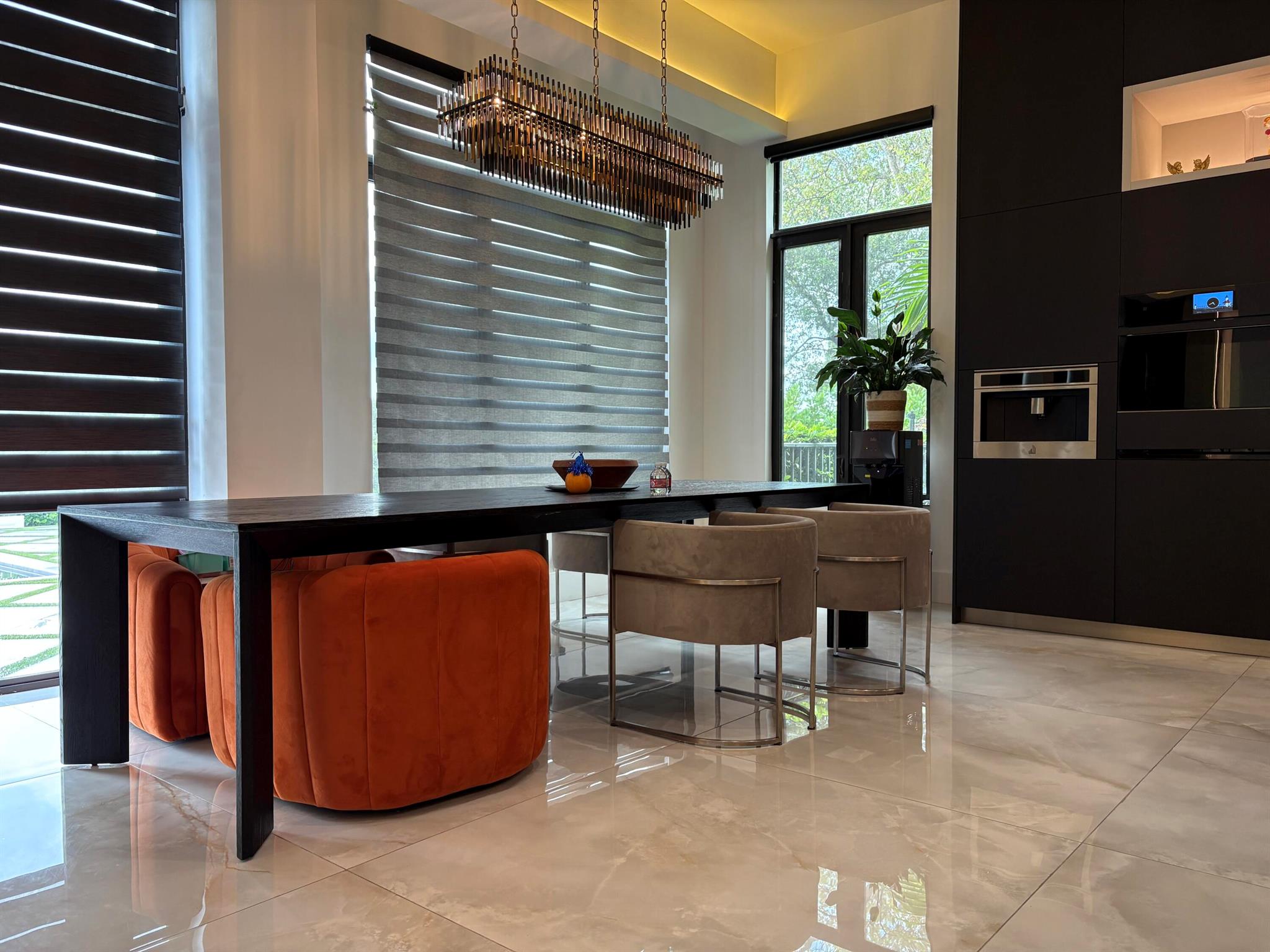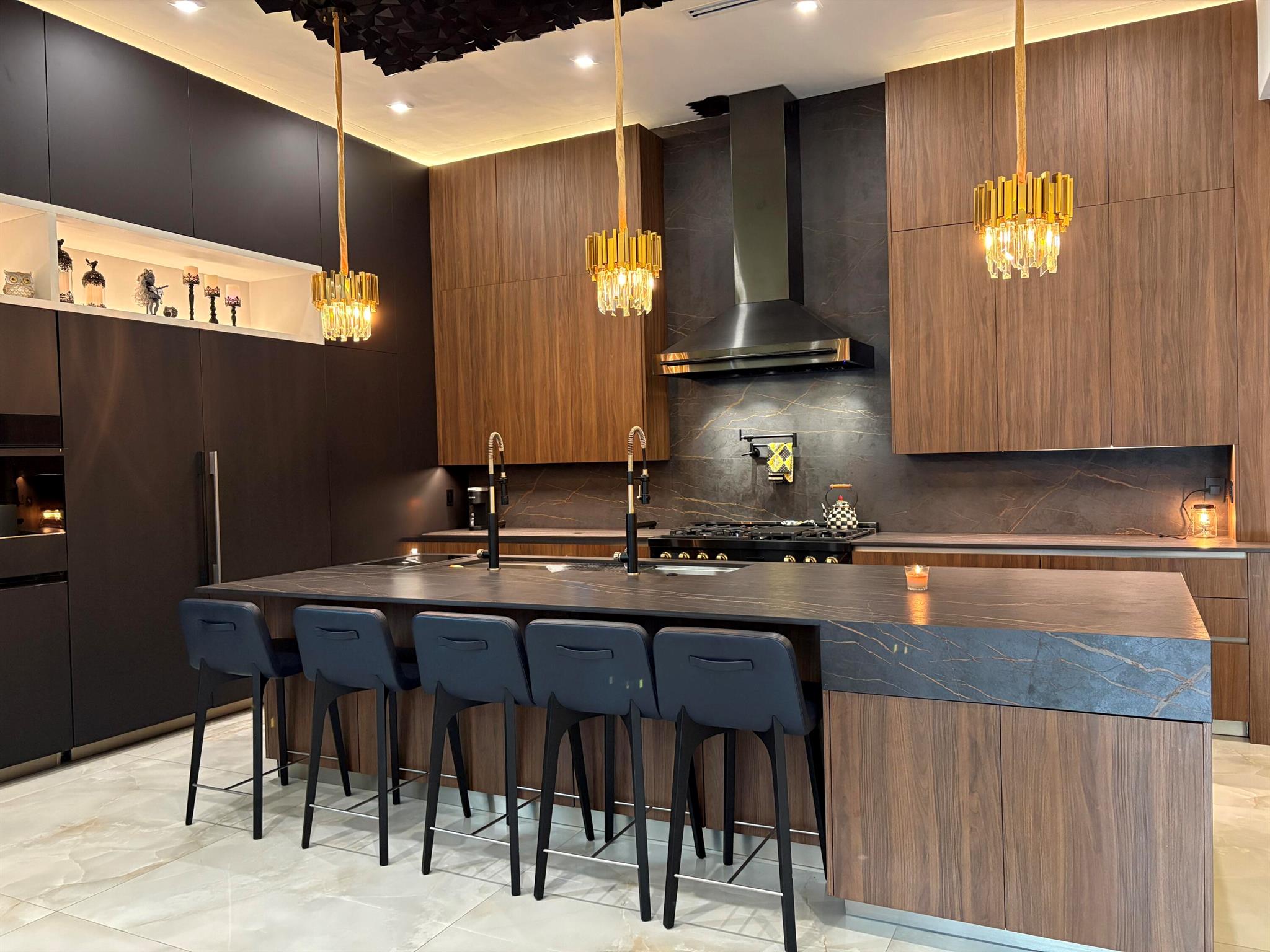 Welcome to a masterpiece of modern elegance set on a coveted double lakefront lot in Parkland's premier community. A dramatic 34-foot entryway with soaring ceilings, sculpted pillars, soffit detailing, and Restoration Hardware chandeliers creates a breathtaking first impression. The interiors are defined by 48x48 Crystala marble flooring, ambient designer lighting, Azori cabinetry, walnut leather wall panels, and striking Dekton countertops, blending warmth and contemporary sophistication.The gourmet kitchen flows effortlessly into expansive living spaces designed for both grand entertaining and intimate gatherings. A versatile front office with a private bath can serve as a guest suite.