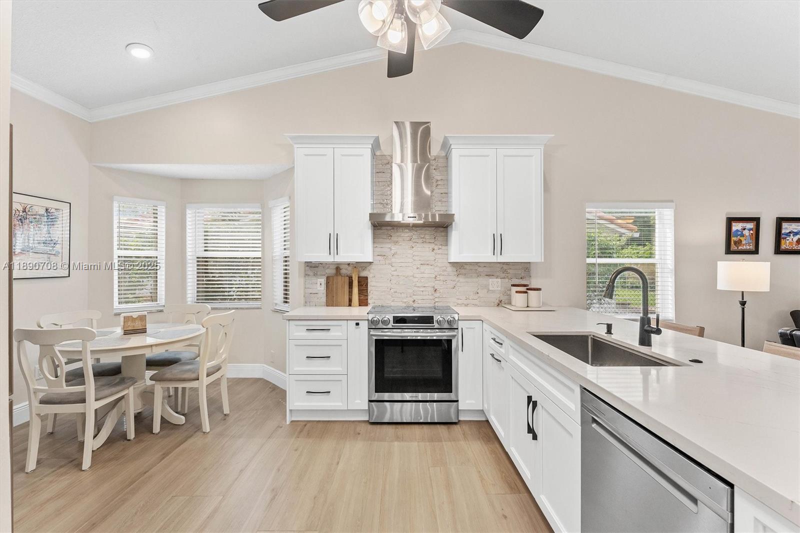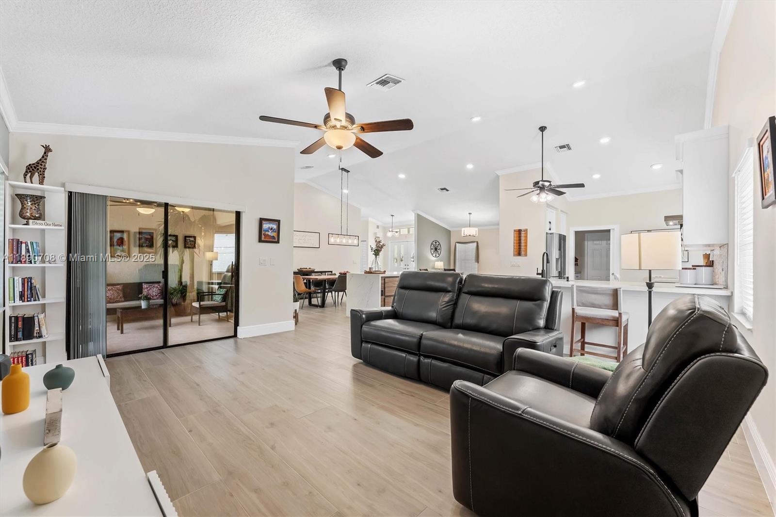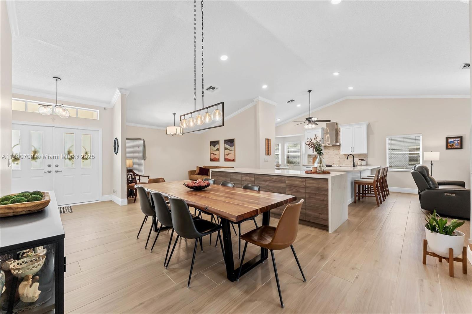 Step inside & be WOWED by this stunning chef’s kitchen—an entertainer’s paradise featuring a statement island w/ wine cooler, quartz countertops, stainless steel appliances, extractor hood, & a convenient butler pantry/laundry room. This 4-bedroom, 2-bath home boasts high vaulted ceilings, wood tile floors, warm modern finishes, & a beautifully remodeled guest bathroom. Enjoy peace of mind w/ a BRAND-NEW ROOF (2024) & A/C (2020). The primary suite offers an oversized walk-in closet plus a second closet. Outside, enjoy a cozy enclosed space & a separate outdoor patio—perfect for gatherings. Complete with a 2-car garage & large driveway on a spacious 10,021sqft corner lot. Ideally located near parks & The Walk with great shopping & dining options. Low monthly HOA!