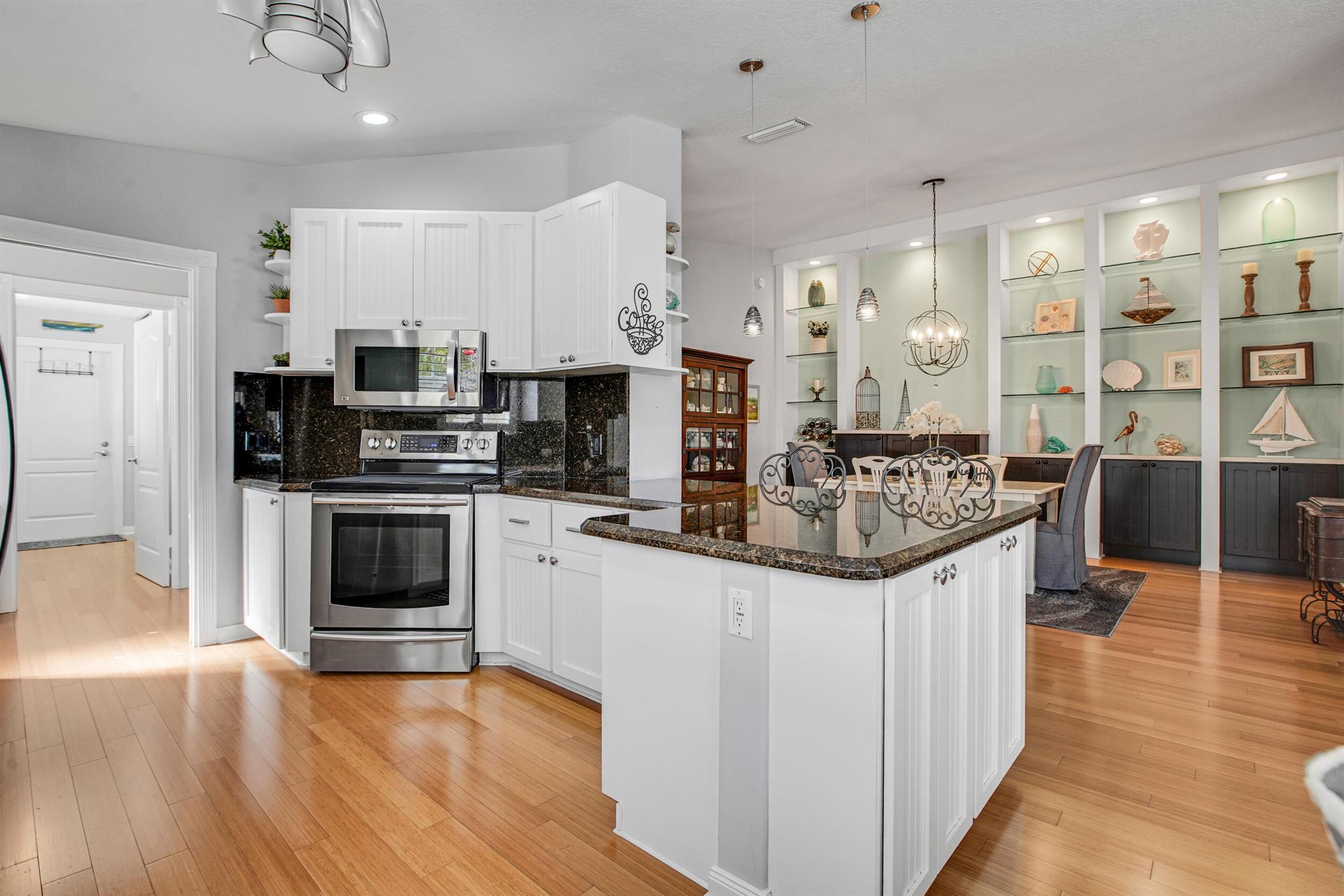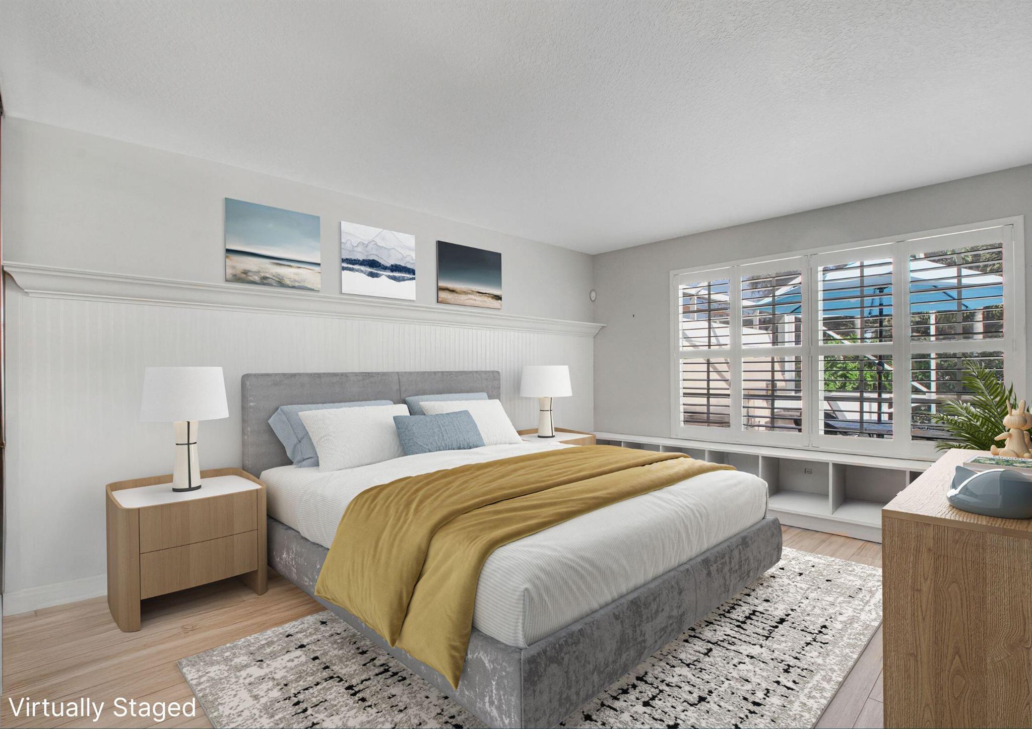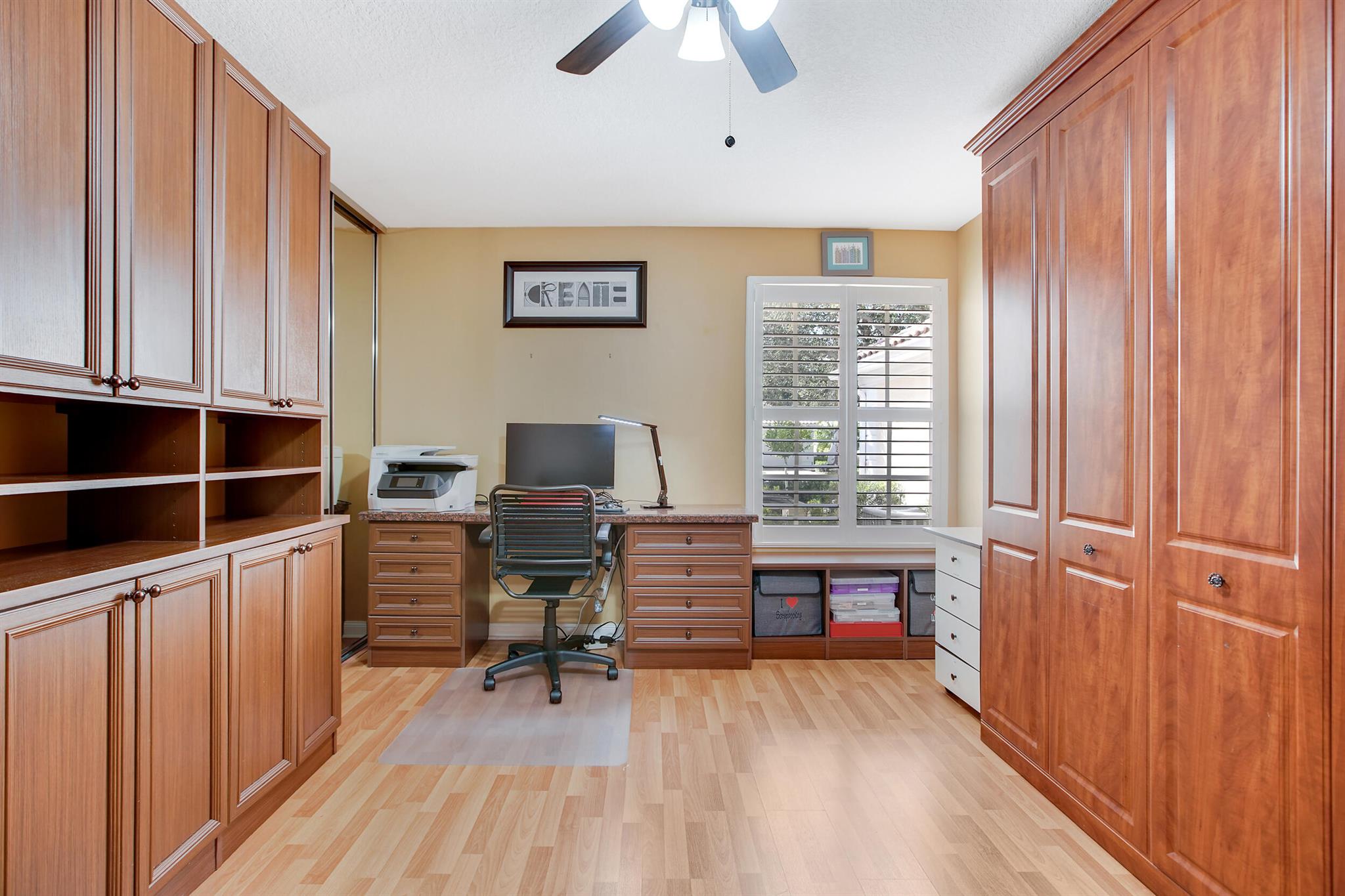 Beautifully maintained 2BR/2BA POOL home with 2-car garage in a sought-after lakefront community. This Capri model stands out with its private screened pool, dining/lounging patio, and covered lanai overlooking the water. The open-concept living and dining areas flow to a granite kitchen with newer appliances, while the split floorplan offers two bedroom suites with walk-in closets and renovated baths. Additional features include hardwood, porcelain tile, and laminate flooring, a formal dining room with built-ins, plantation shutters throughout, separate laundry, and abundant linen storage. The guest suite is enhanced with a Murphy bed plus custom desks and cabinetry. For peace of mind: the home just passed a 4-point inspection (available for transfer), owner has a current wind mit and