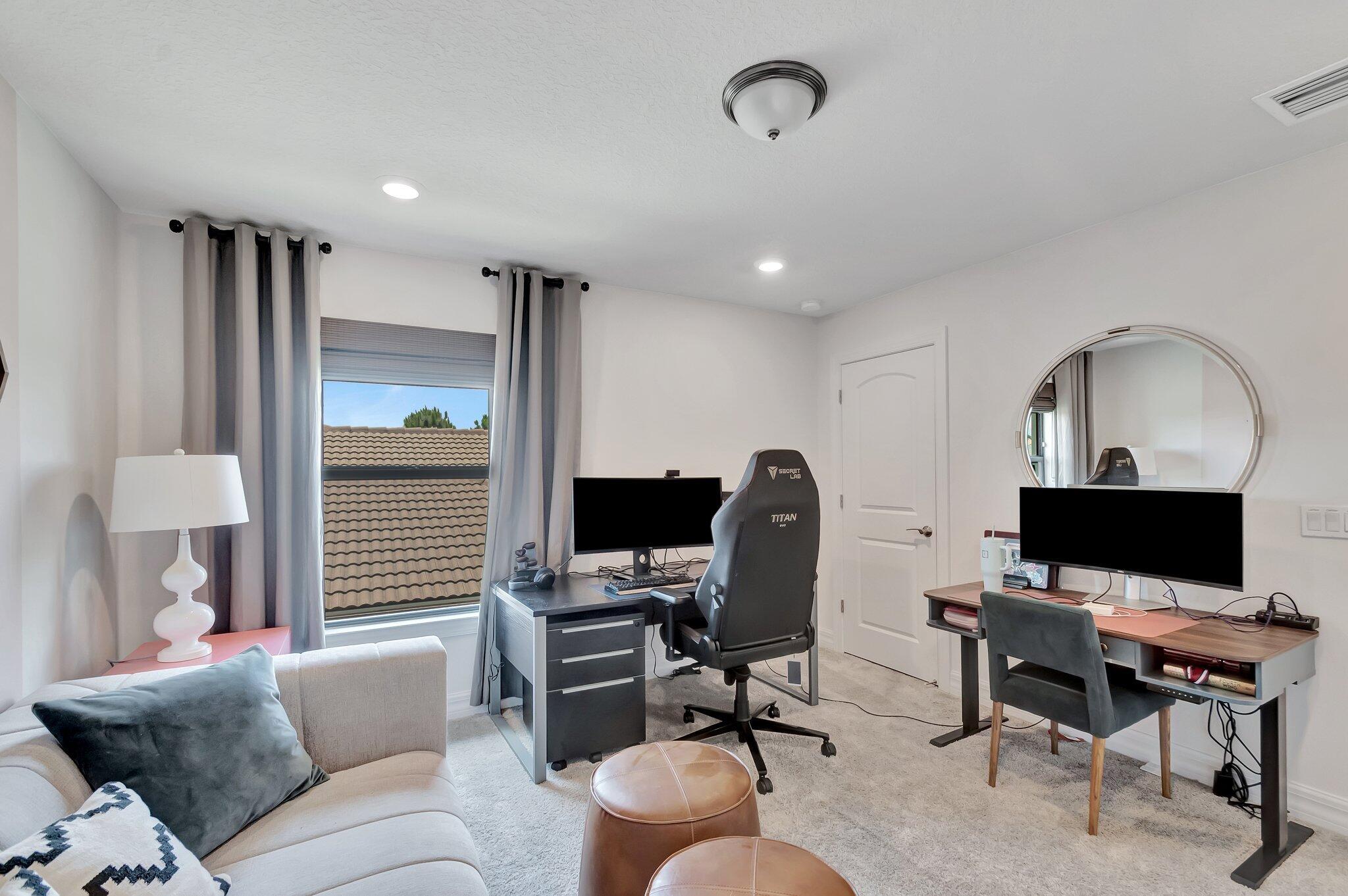 Former Citrus Grove Model Home! Bought directly from the developer, this upgraded 2019 model offers 5 oversized bedrooms, 3 bathrooms, a spacious upstairs den, and countless high-end features. Enjoy low insurance and low HOA! Designer upgrades include custom feature walls, built-ins, wine fridge, shiplap ceilings, upgraded stair railings, and premium lighting throughout. Sliding glass doors that pocket. The oversized kitchen features quartz countertops, backsplash, and a massive island. The main floor offers a guest suite & primary, a full laundry room, and a two-car garage. Upstairs includes three large bedrooms with walk-ins and a massive den, ideal for an office or playroom. Relax on the screened-in patio with lake views and a fenced yard.