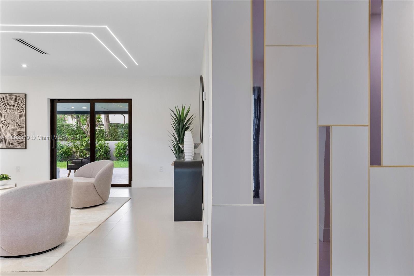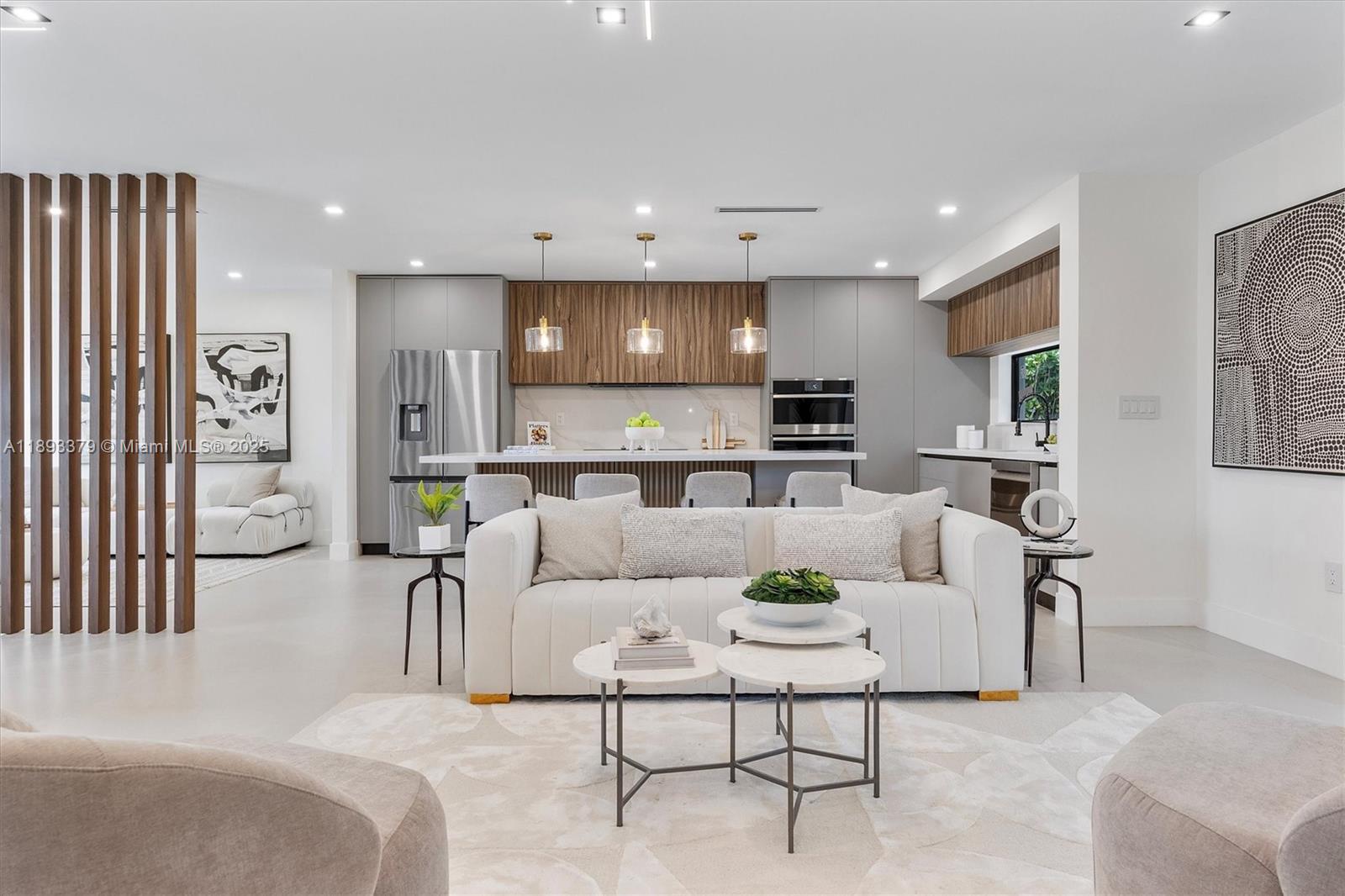 A vision of modern sophistication and effortless Miami living. This 2025 rebuilt turn-key designer home welcomes you with a bright, open-concept layout filled with natural light. New Features include porcelain floors, Calacatta quartz countertops, Italian-style kitchen cabinets with premium appliances and wine fridge, new pavement driveway, new impact doors and windows, and designer lighting. The primary suite offers double sinks and custom floor-to-ceiling closets. Paneled door for the half bath, den or family/TV room, and a spacious green yard with pergola with room for a pool complete the layout. The property sits on a dead-end street. Nearby linear Park/trail in projects. Excellent location, minutes from Coral Gables and major highways. A true modern sanctuary.