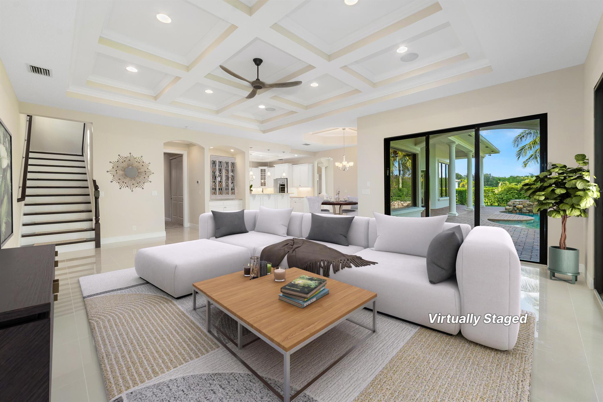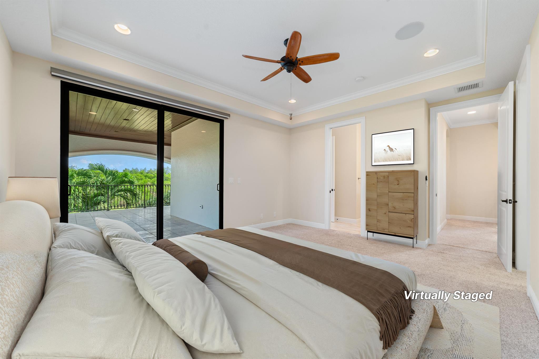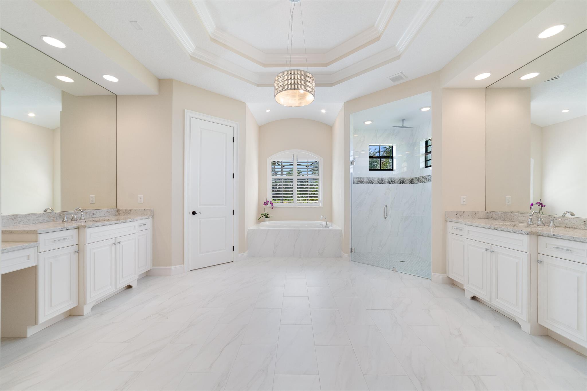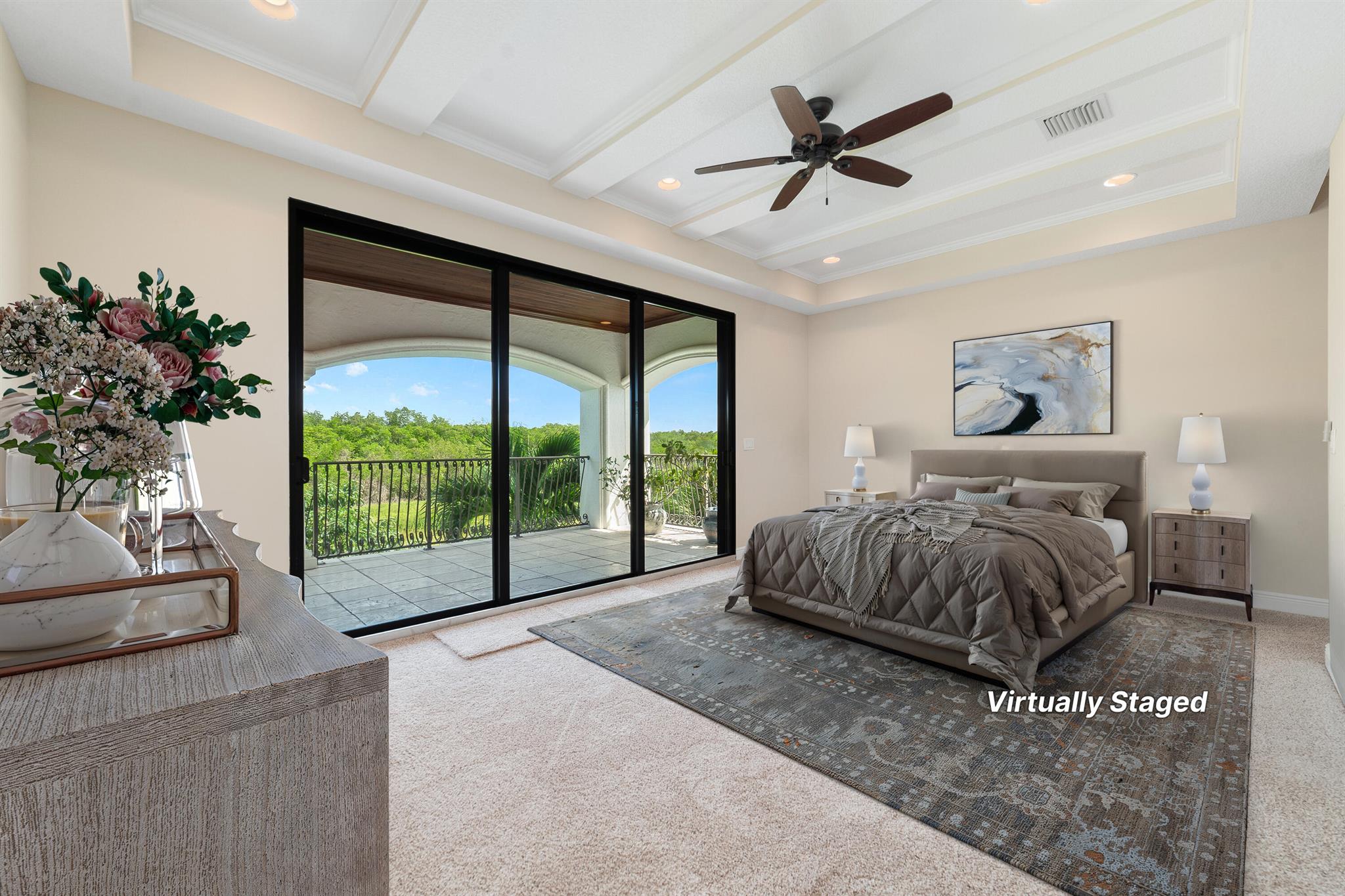 Welcome home to this exquisite 5-bedroom, 5-bath luxury estate located in the prestigious gated waterfront community of Ravello. Designed with timeless elegance and exceptional craftsmanship, this home offers both grandeur and comfort across every detail. From the large 24'' x 24'' porcelain tile throughout the main living areas, to the vaulted tray and coffered ceilings - every detail of this home is built to impress. The expansive main-level owner's suite provides an oversized private bath with dual spacious California custom walk-in closets. All four of the additional bedrooms feature private access to an en-suite bath for ultimate convenience.