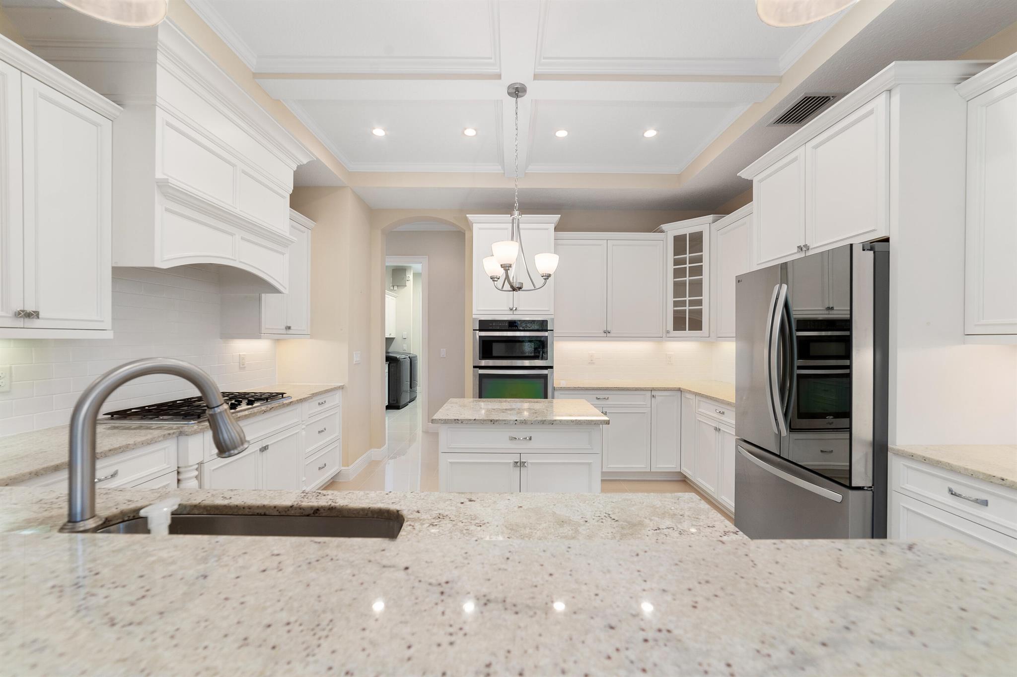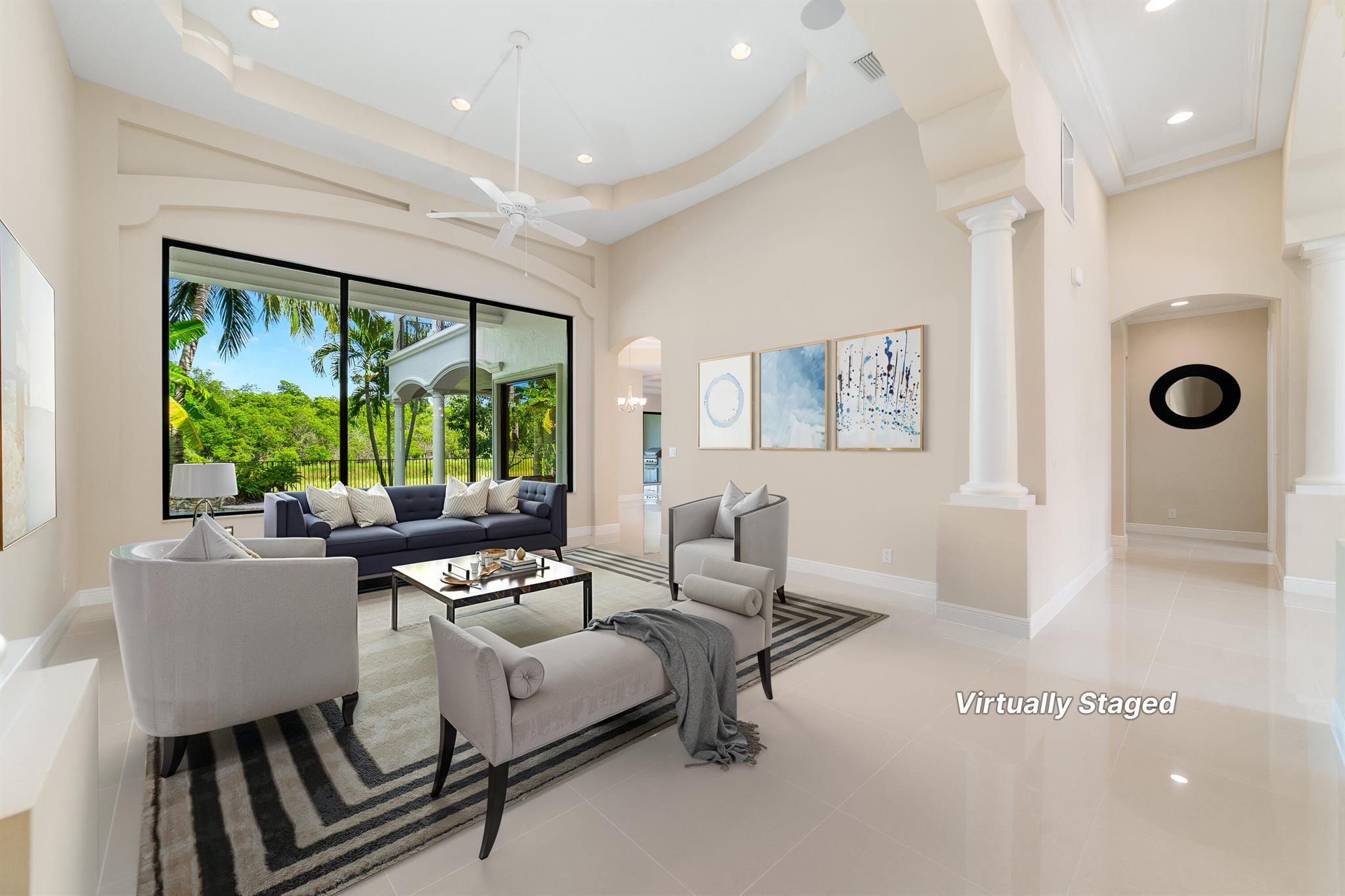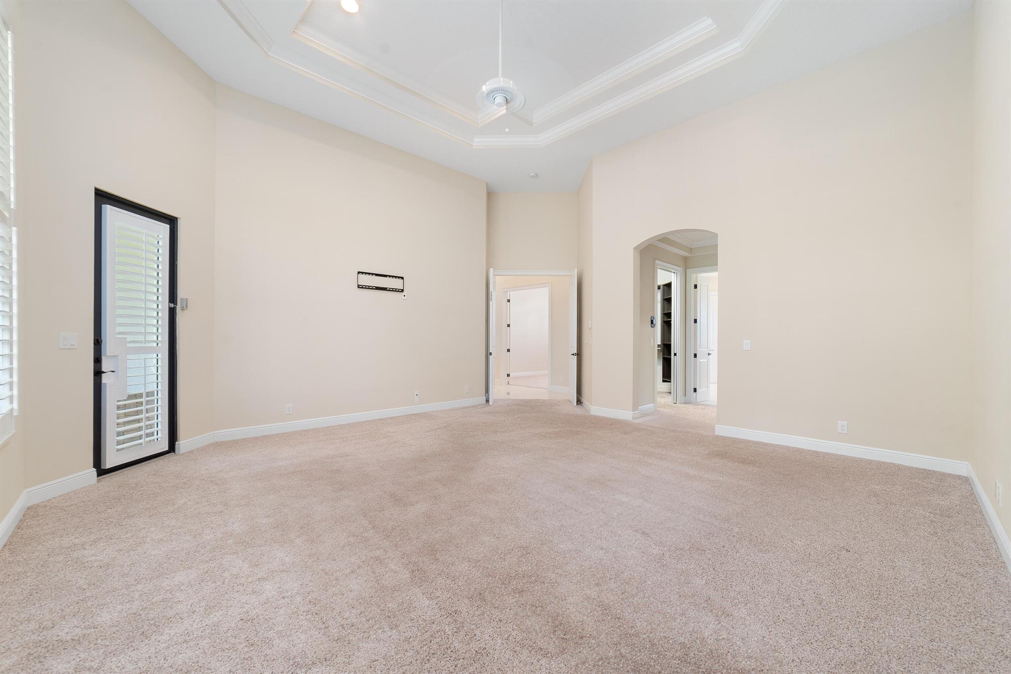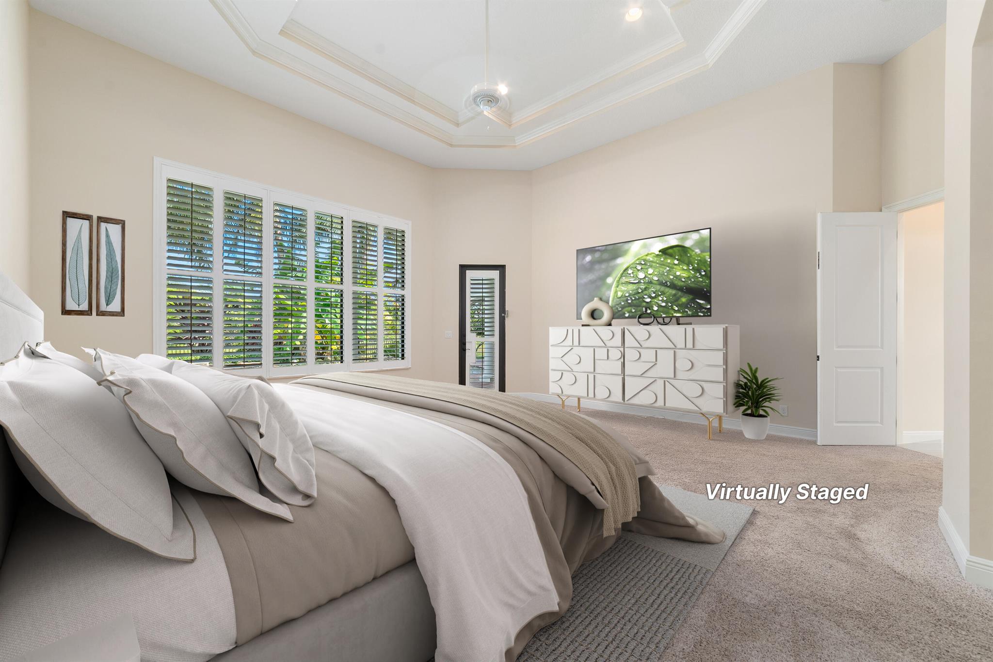 Welcome home to this exquisite 5-bedroom, 5-bath luxury estate located in the prestigious gated waterfront community of Ravello. Designed with timeless elegance and exceptional craftsmanship, this home offers both grandeur and comfort across every detail. From the large 24'' x 24'' porcelain tile throughout the main living areas, to the vaulted tray and coffered ceilings - every detail of this home is built to impress. The expansive main-level owner's suite provides an oversized private bath with dual spacious California custom walk-in closets. All four of the additional bedrooms feature private access to an en-suite bath for ultimate convenience.