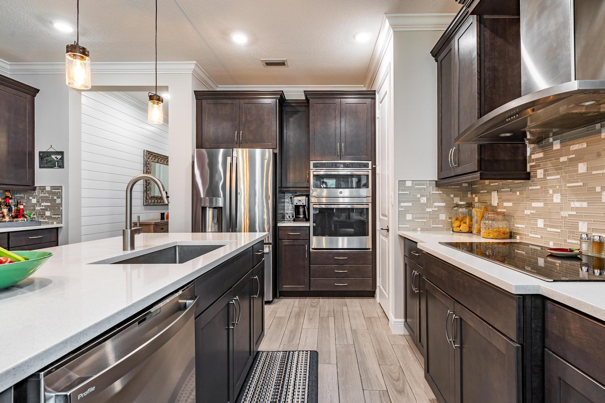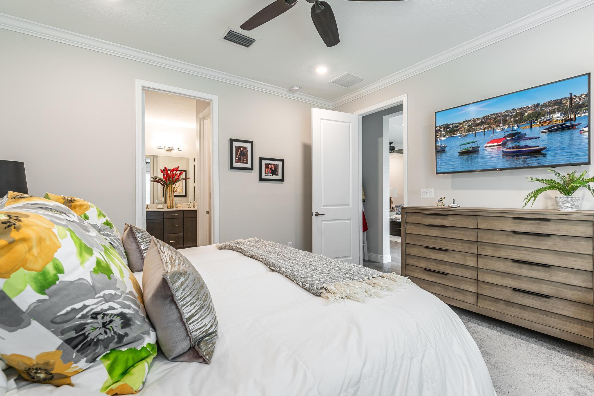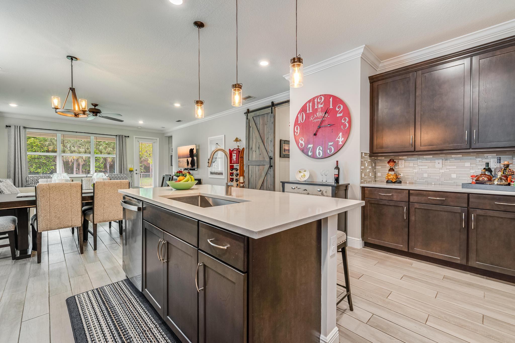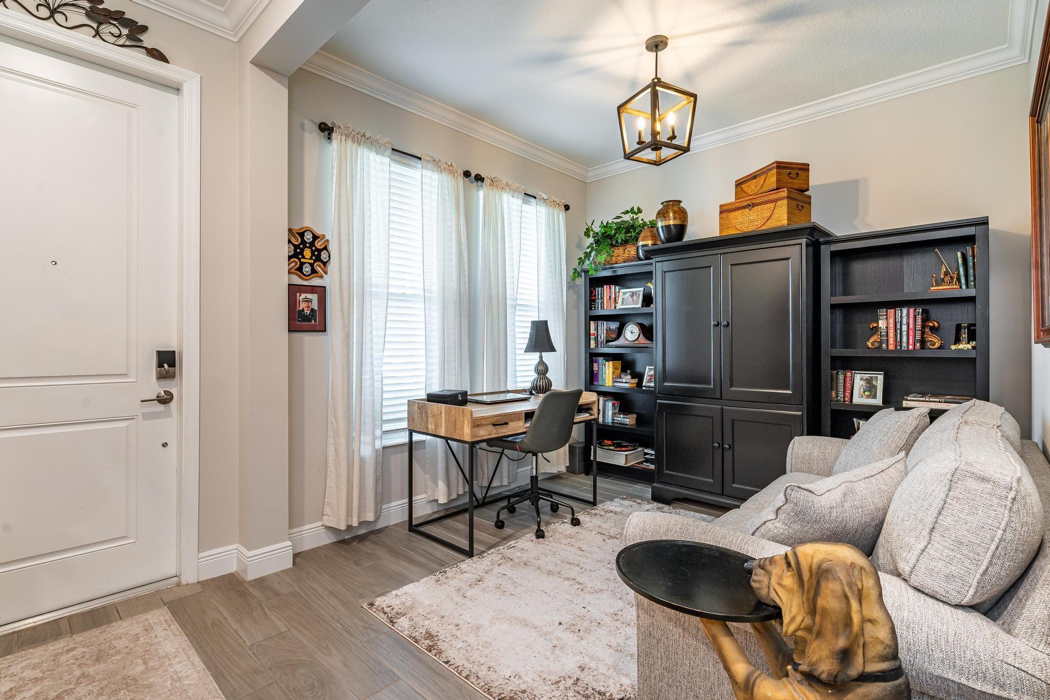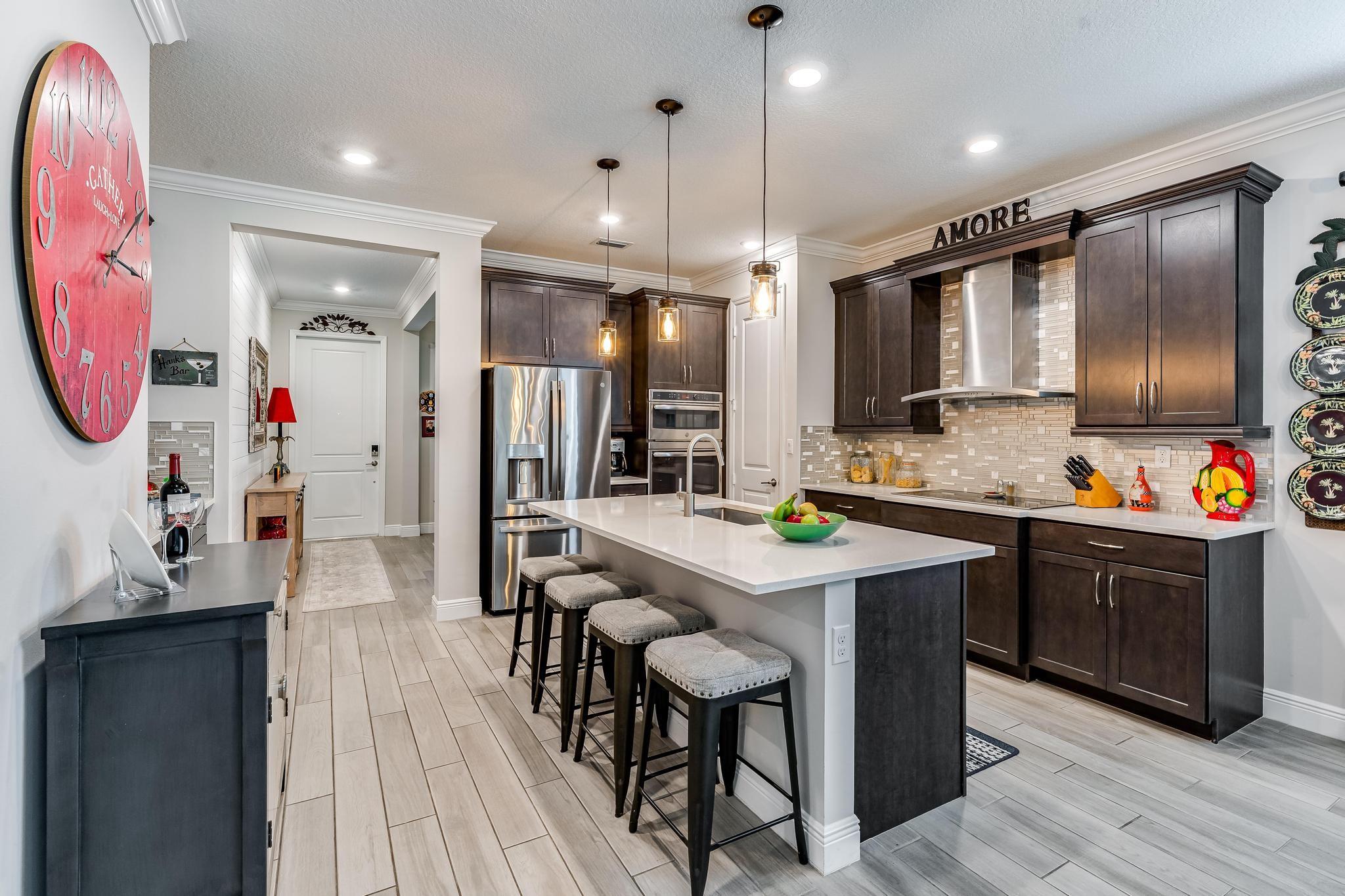 Rare WATERFRONT Pitoresco Model w/Craftsman Elevation in Sought-After Gated VELEIROS! 2/2+Bonus Rm (Convertible to 3rd Bdrm) & 2-Car Garage. Lushly Landscaped Front Porch (Perfect for Stargazing on a Balmy Evening) Opens to Foyer & Den. Ahead, Spacious Living Area w/Plank Tile, Hi-Hat Lights, Open Kitchen, GE Stainless Suite w/Wall Oven & Hood, Quartz Counters & Island, Pantry, Wood Cabinets. Sun-Soaked Great Room Overlooks Fenced Waterfront Yard w/Covered Paver Patio & Room for Pool. Owner Suite is a Hushed Sanctuary w/Ensuite Bath, Walk-in Closet. Barn Doors Open to Guest Quarters & Laundry Rm. Hurricane Impact Windows & Doors. Pets Welcome. Gym, Clubhouse, Pool, Playground, Onsite Mgmt. No worry of storm outages, same electrical grid as firehouse! Close to Beach, Supermarkets, Casino.