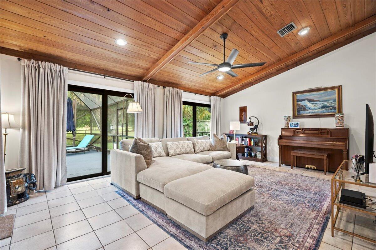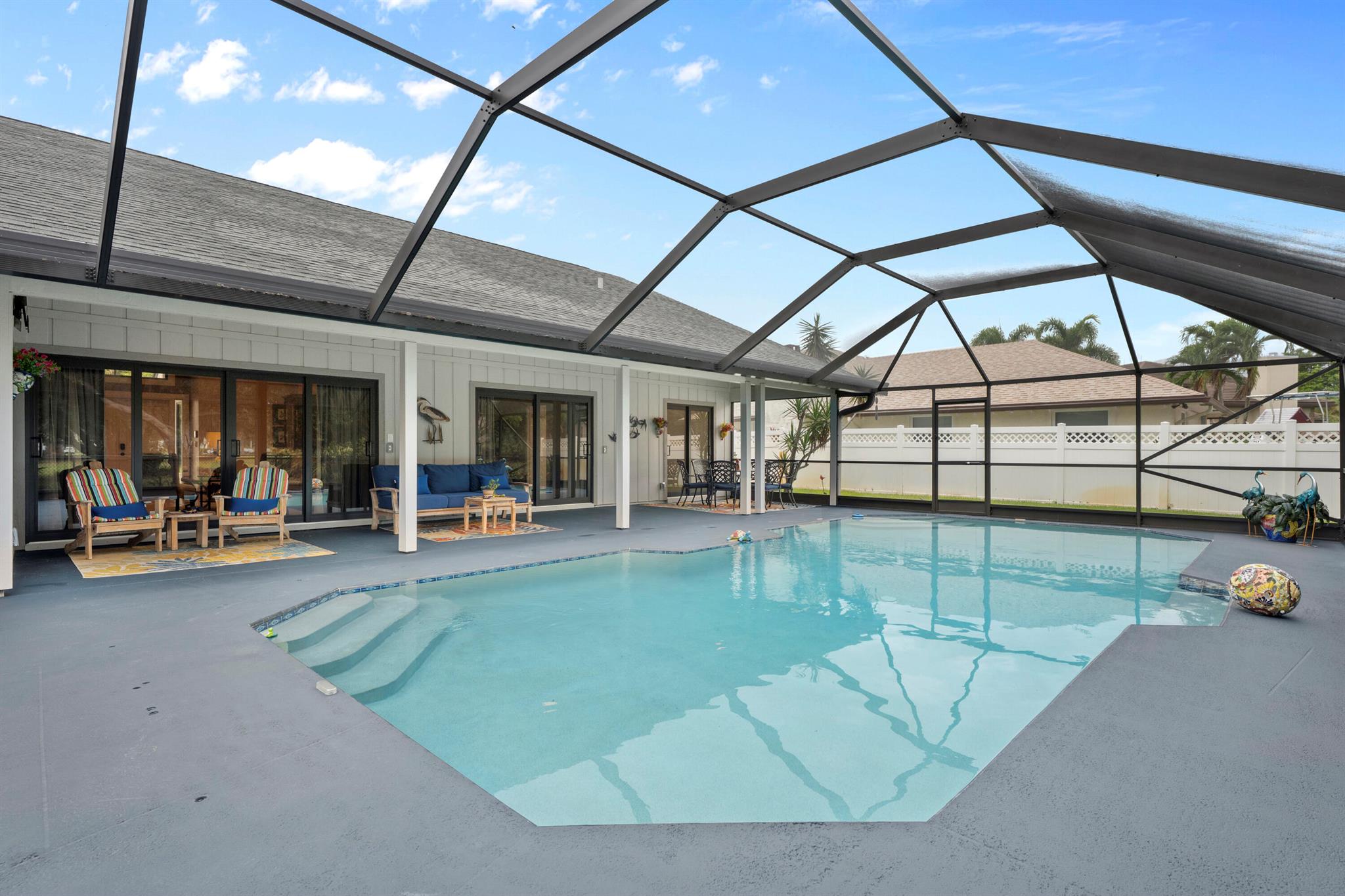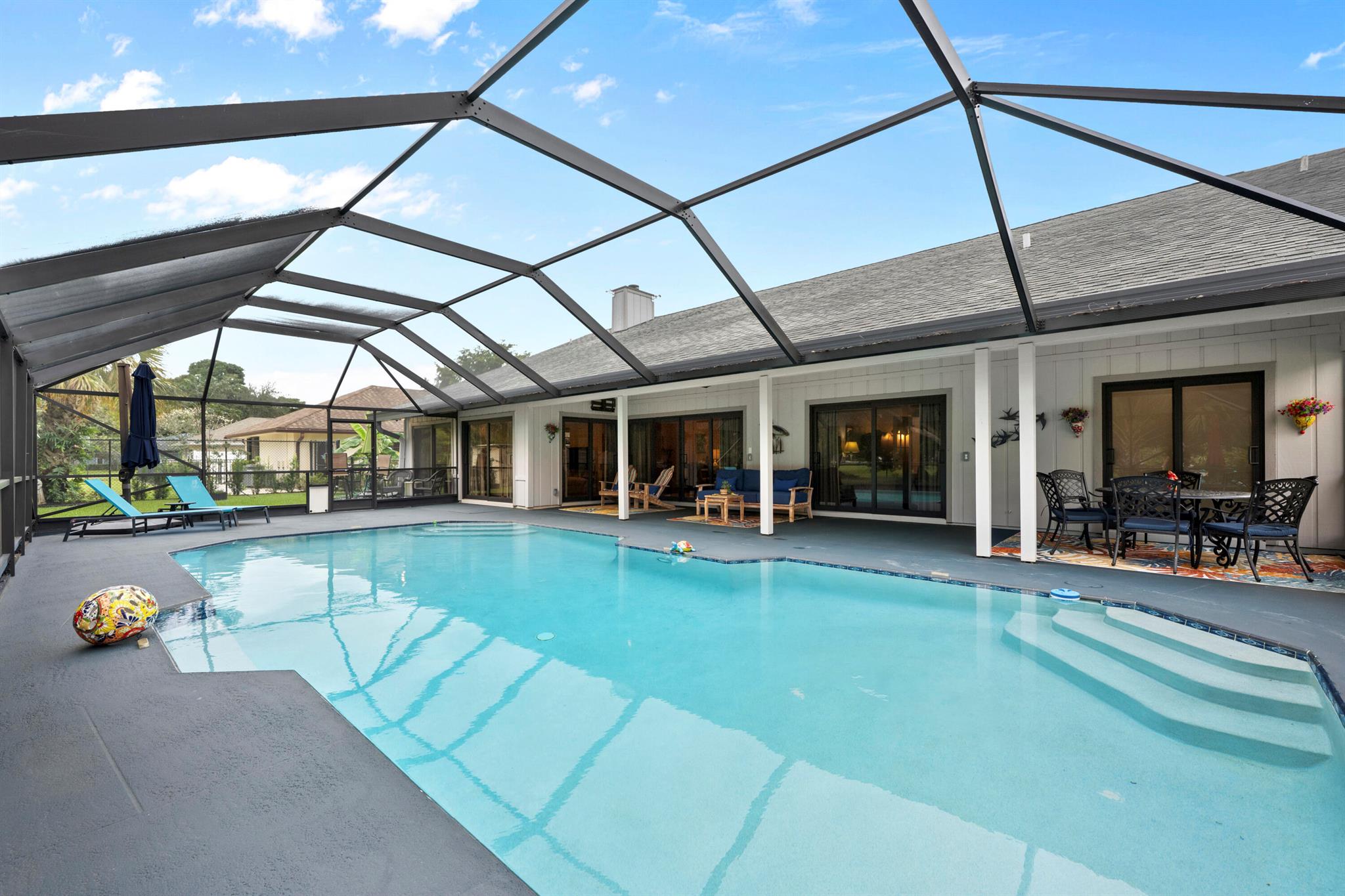 Step into a one-of-a-kind California contemporary masterpiece tucked away in the coveted Gardens Glen community of Palm Beach Gardens. This striking home blends timeless 1980s character with fresh, modern upgrades. Vaulted wood ceilings, dramatic exposed beams & walls of sliding glass that flood the space w/ light & open seamlessly to a private screened pool & covered porch. No rear neighbors, no HOA! Enjoy peace of mind with impact glass throughout, refreshed siding, new interior & exterior paint, 2 brand new A/C units, tankless water heater, new kitchen appliances, new washer/dryer, new pool equipment & attic insulation. Termite bond in place. The oversized garage features epoxy flooring & fresh paint perfect for storage, hobbies, or a sleek home gym.