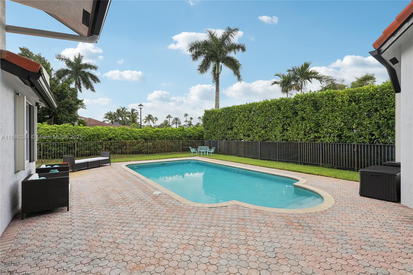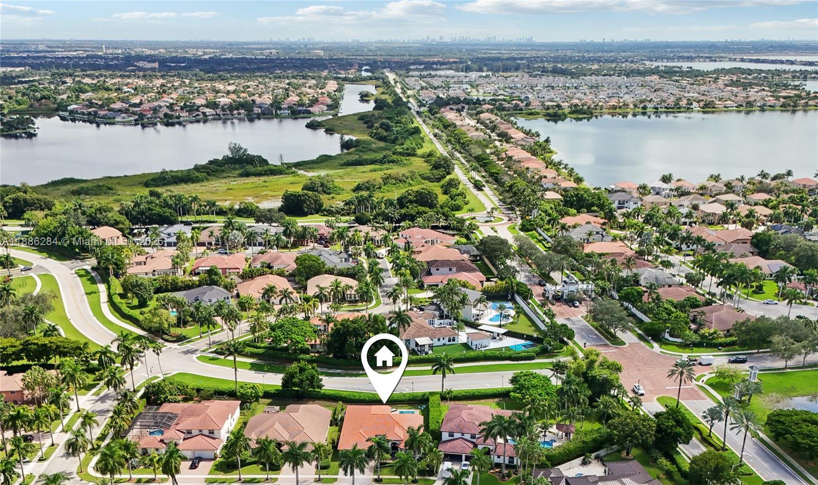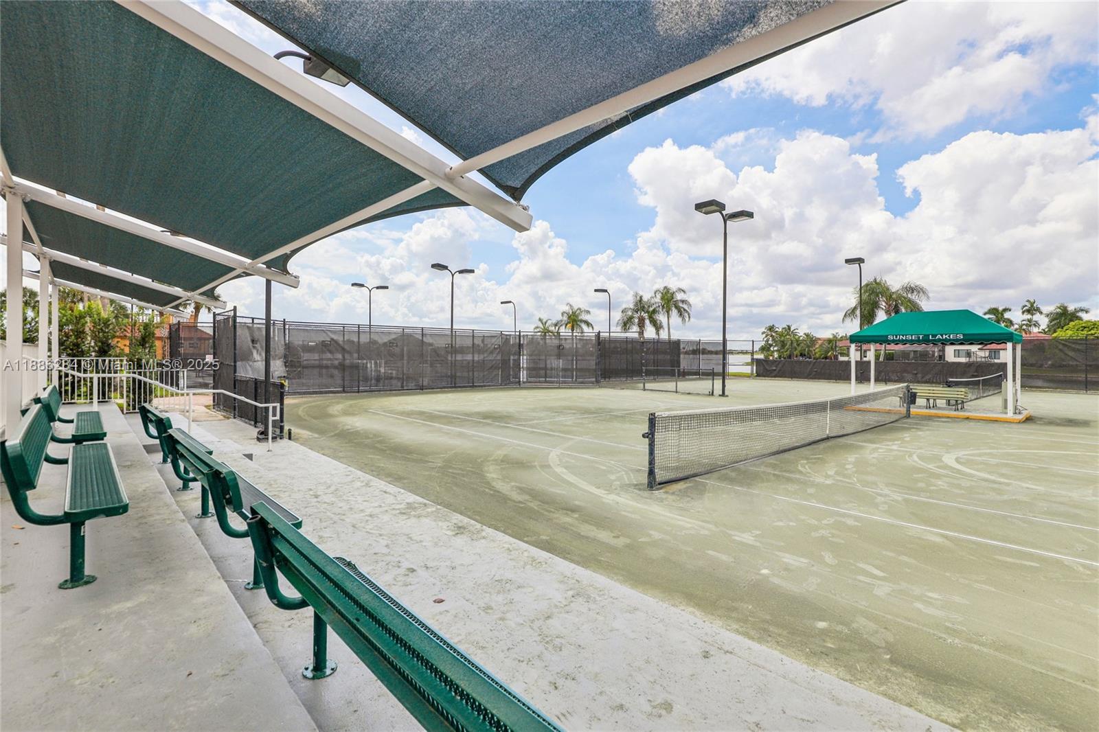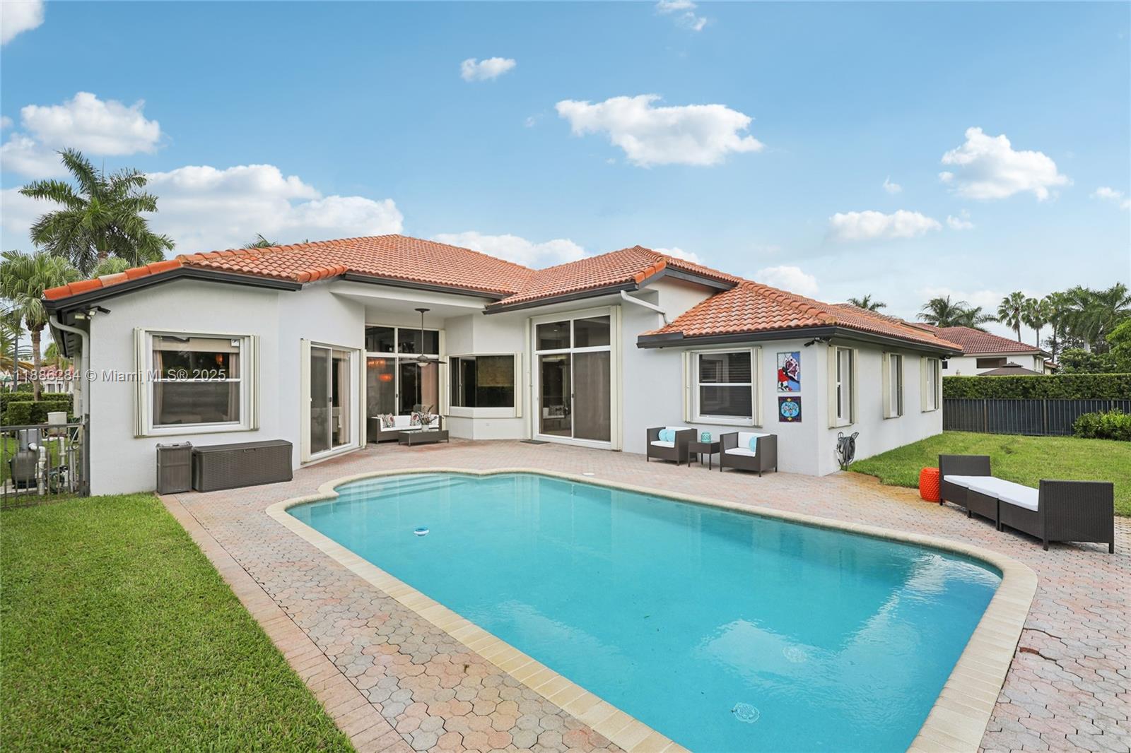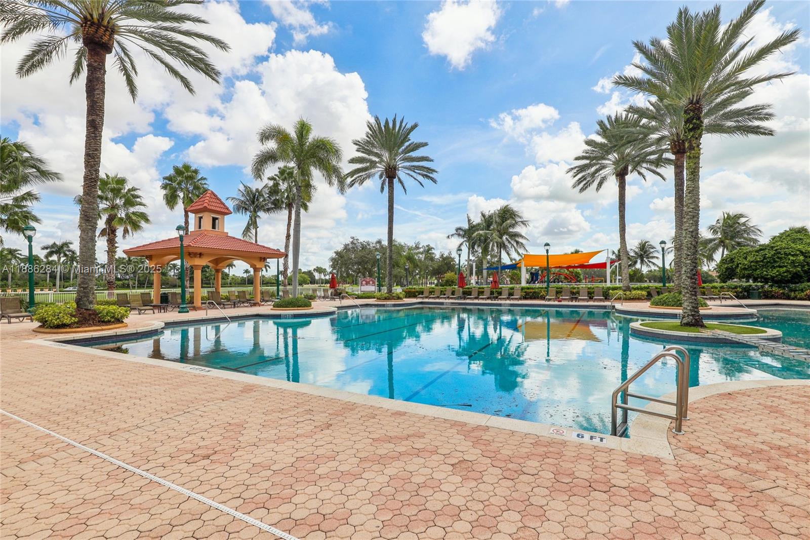 Beautiful 6-bed, 3.5-bath home with an office and a 3-car garage in the exclusive Sunset Lake community. Features dramatic volume ceilings, elegant porcelain tile floors, and a seamless indoor-outdoor flow. The spacious patio and beautiful pool create the perfect backyard retreat. Inside, the open-concept design welcomes abundant natural light. The open kitchen offers granite countertops, wood cabinetry, and a sun-drenched breakfast nook adjoining the expansive family room. The huge primary suite includes a sitting area, walk-in closets, and a spacious bath. Accordion shutters throughout provide peace of mind. Conveniently located near A-rated schools, shops, and dining. The resort-style clubhouse offers a pool, tennis courts, playgrounds, and a gym. Low HOA fee includes Internet and cable