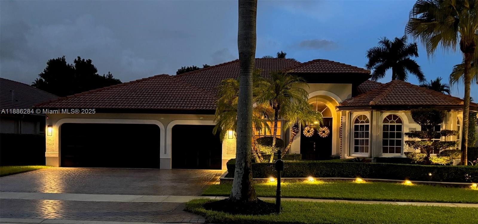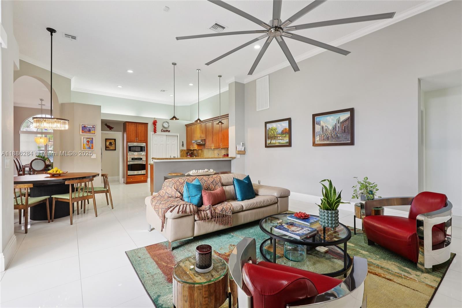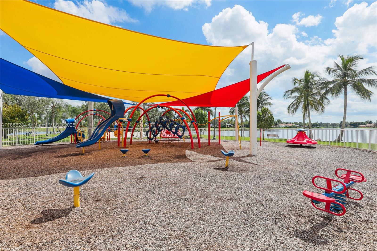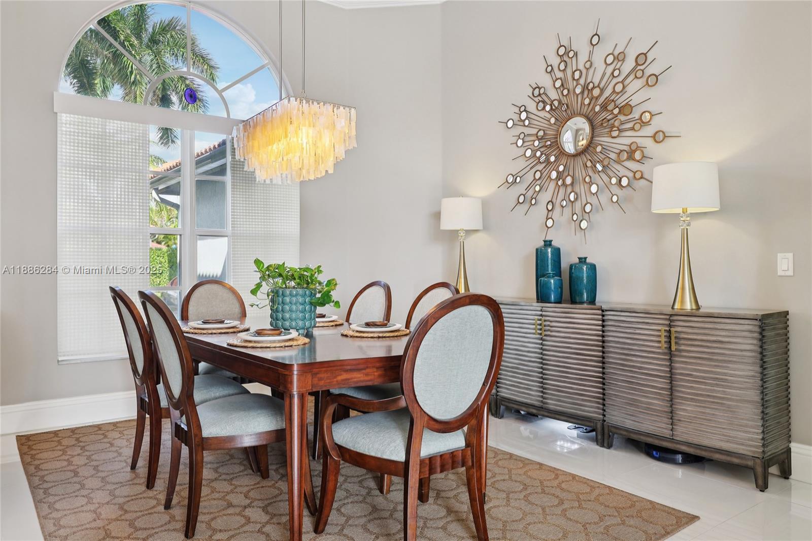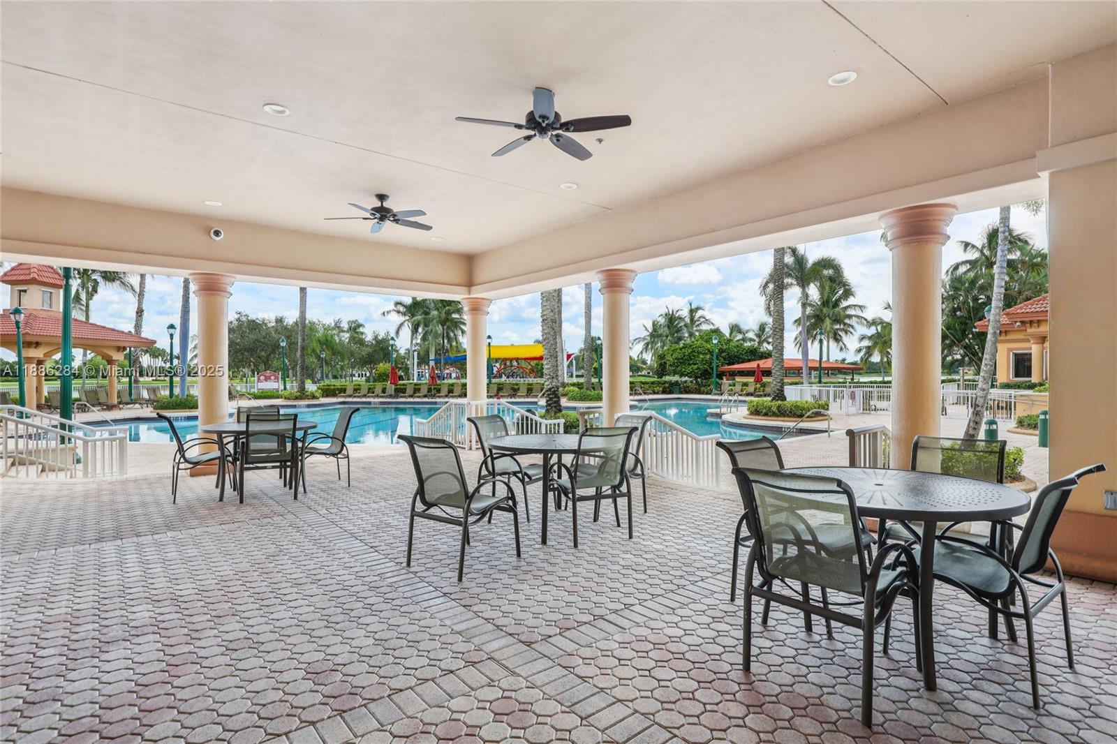 Beautiful 6-bed, 3.5-bath home with an office and a 3-car garage in the exclusive Sunset Lake community. Features dramatic volume ceilings, elegant porcelain tile floors, and a seamless indoor-outdoor flow. The spacious patio and beautiful pool create the perfect backyard retreat. Inside, the open-concept design welcomes abundant natural light. The open kitchen offers granite countertops, wood cabinetry, and a sun-drenched breakfast nook adjoining the expansive family room. The huge primary suite includes a sitting area, walk-in closets, and a spacious bath. Accordion shutters throughout provide peace of mind. Conveniently located near A-rated schools, shops, and dining. The resort-style clubhouse offers a pool, tennis courts, playgrounds, and a gym. Low HOA fee includes Internet and cable