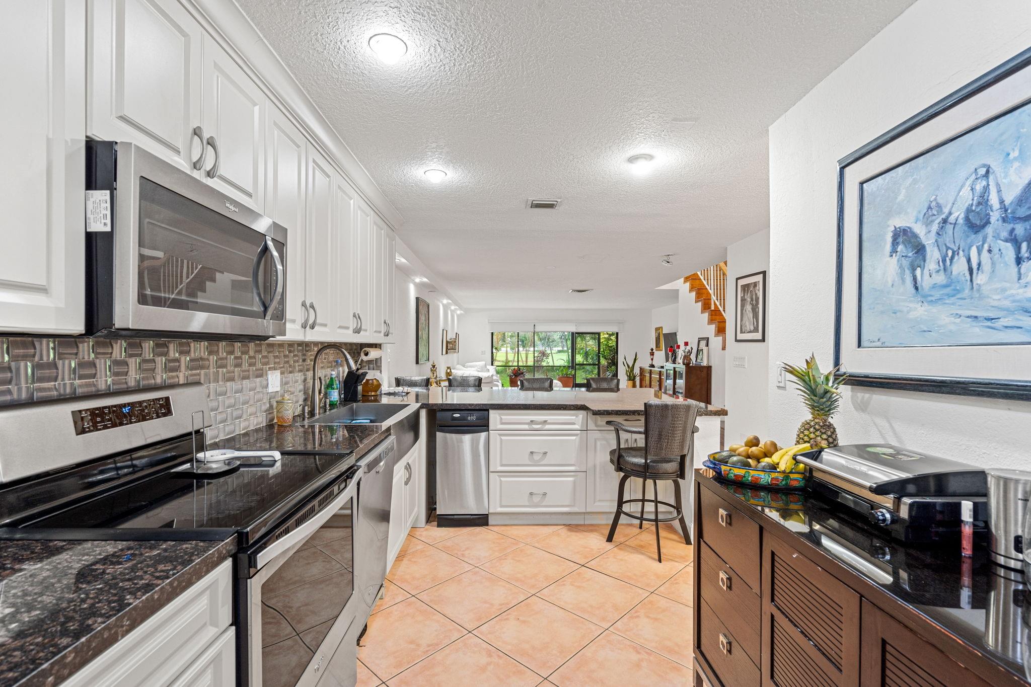 Stunning lake & golf views with expansive green backyard! Modern updates throughout—tiled floors, granite kitchen with updated cabinets, recessed lighting, knockdown walls & ceilings, and renovated bathrooms. Upstairs atrium and master suite offer breathtaking sunrise & sunset views. Ample parking for 2 cars plus guests. Costa del Sol amenities include clubhouse, 18-hole golf course, lakeside restaurant, tennis, basketball, pool, and jogging path—ideal for an active lifestyle. On-site management, 24-hr security & guardhouse for peace of mind. Maintenance covers water, HD cable, internet, exterior & roof insurance, driveway, paint, trash, landscaping & common areas.