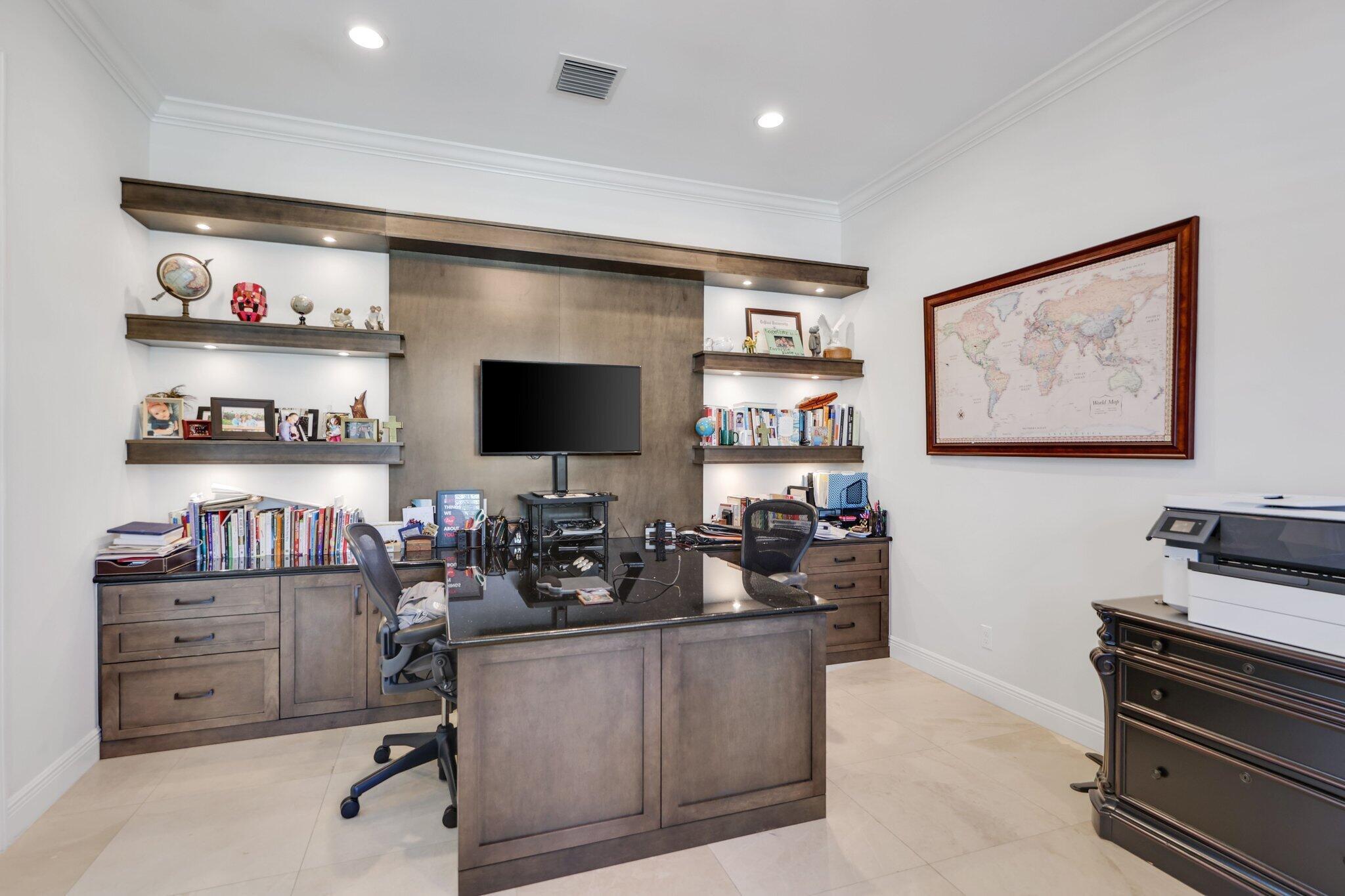 Experience luxury living in Royal Palm Polo, Boca Raton's premier gated community. This elegant 5-bedroom, 5.1-bathroom Lakefront Callahan model with a 3-car garage showcases modern design and refined finishes throughout. The gourmet kitchen features a Wolf/Sub-Zero appliance suite, gas range, and double ovens.The first floor offers a spacious primary suite with a spa-inspired bath and cabana bath, plus a guest ensuite, private office, and an open living area that flows seamlessly to the covered lanai. Upstairs, you'll find three ensuite bedrooms, a loft, and a balcony overlooking the property. The southern-facing backyard features a sparkling pool and tranquil lake views, creating the perfect setting for outdoor living.