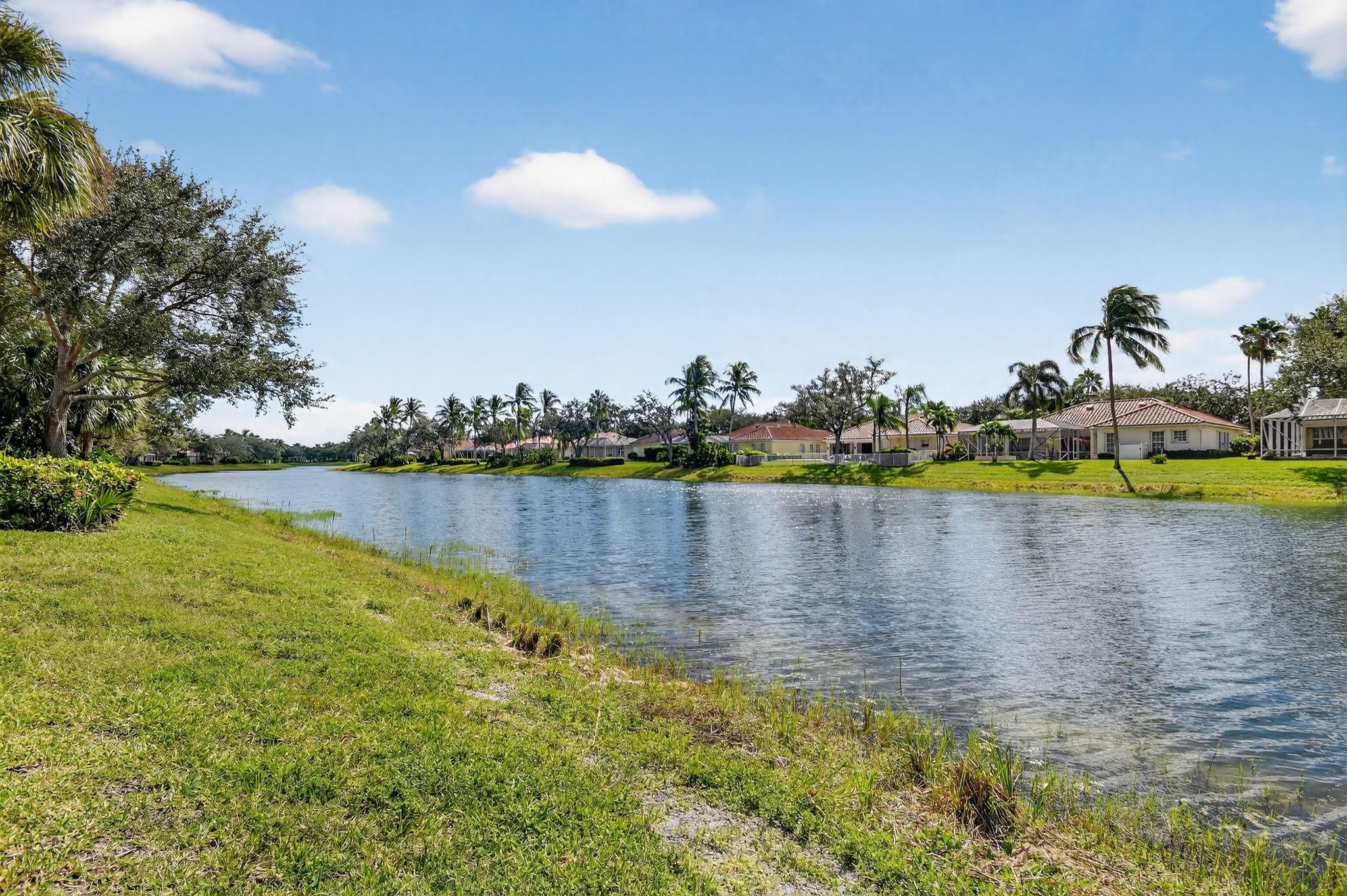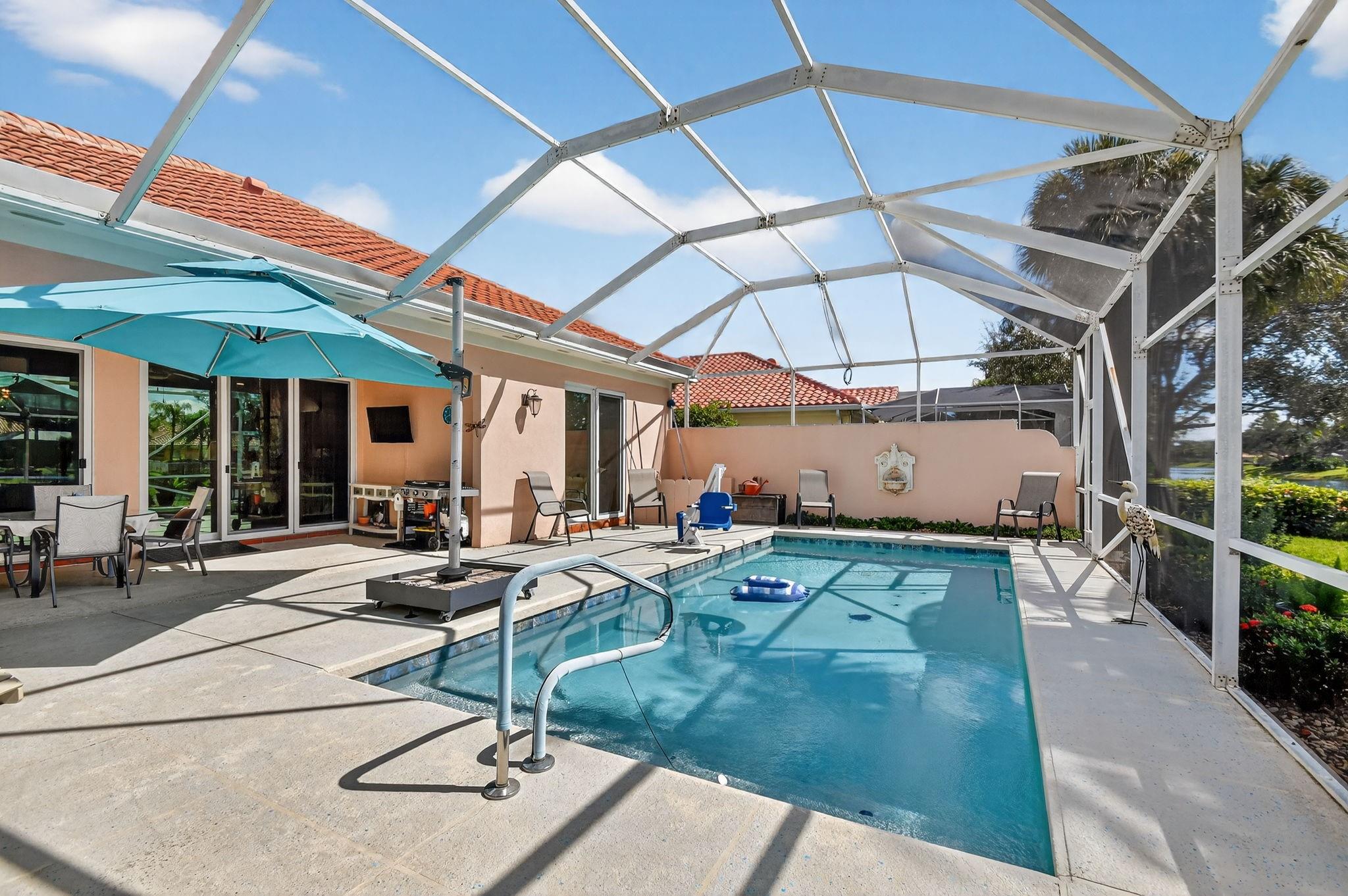 Welcome to Riverwalk! This Oakmont checks every box; New Roof, Impact Doors, Private Heated Saltwater Pool, Waterfront home, huge screened in patio & professional landscaping. Your new home has 3 bedrooms & an office/den which could be a fourth bedroom should you desire. From the entry, walk in to 12 ft. ceilings, adorned w/crown moulding & recessed lighting throughout. See 18 ft of impact glass doors for a clear lake & pool view. The two sets of triple pocket sliding doors create a true indoor/outdoor living space right in your home. Riverwalk offers a luxury lifestyle without the membership price. Offers Fitness Center, Tennis, Pickle Ball, Yoga, plethora of clubs, and a restaurant. Located in the heart of Palm Beach West, a short drive to beach, downtown, airport, fine dining, shops.