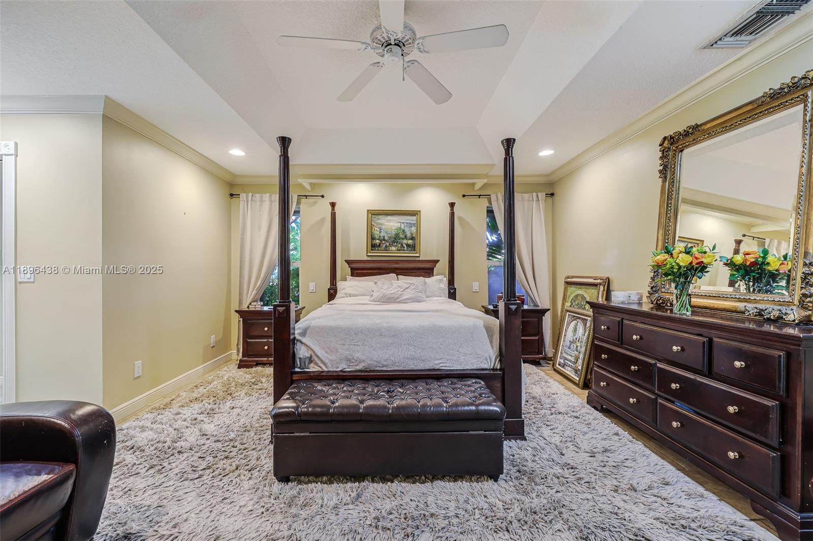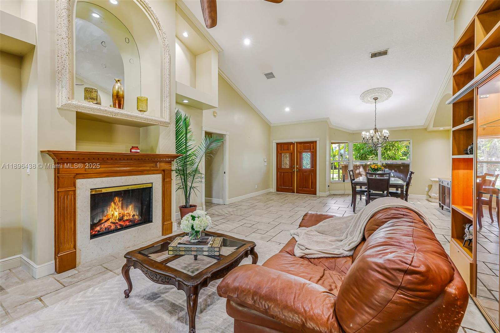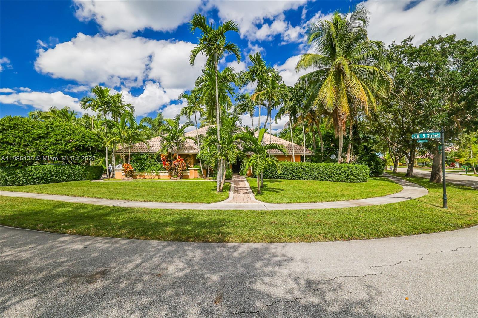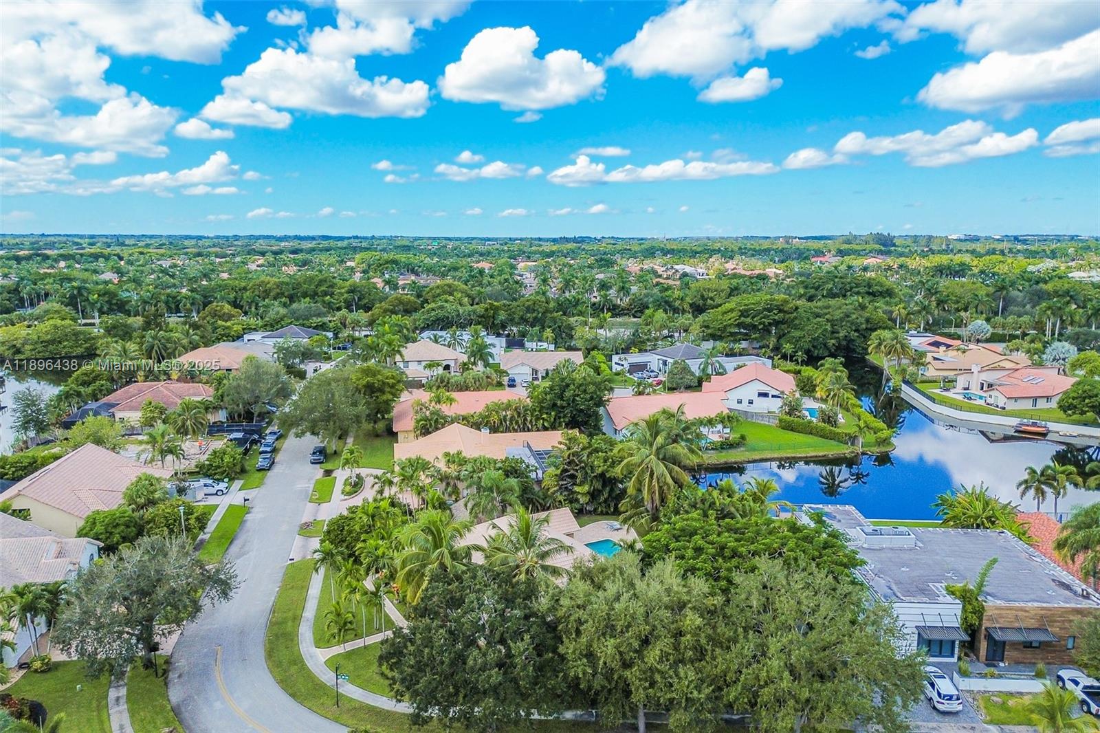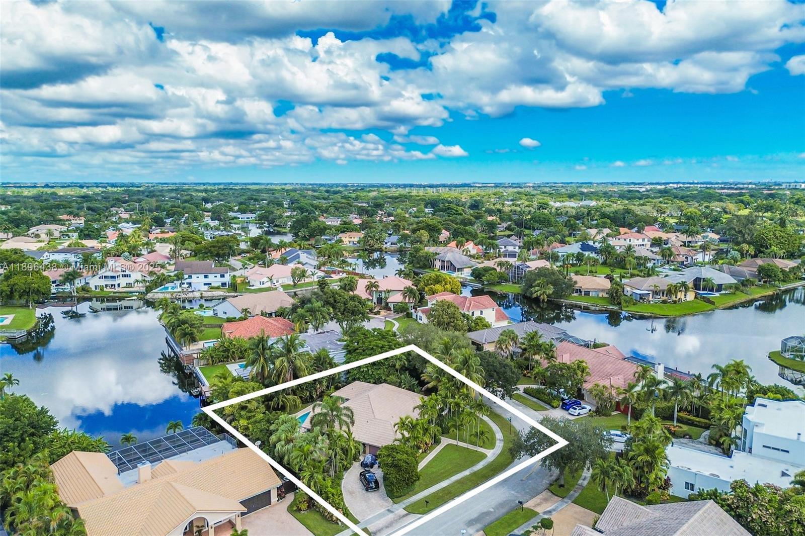 Beautifully updated 4 bedroom 2.5 bath home located in the highly desired Jacaranda community of Plantation on an oversized corner cul-de-sac lot w/ peaceful lake views. This elegant residence features travertine floors throughout the main living areas and engineered hardwood floors in 3 bedrooms + high ceilings open layout w/ spacious living and dining areas. The gourmet kitchen offers 48" refrigerator double ovens large center island wine cooler, abundant cabinetry ideal for cooking & entertaining. The split floor plan provides privacy with a relaxing primary suite. Step outside to your private tropical retreat with covered patio tiki hut sparkling pool fenced yard half court basketball & lush landscaping creating the perfect outdoor lifestyle for family fun & entertaining on the water.