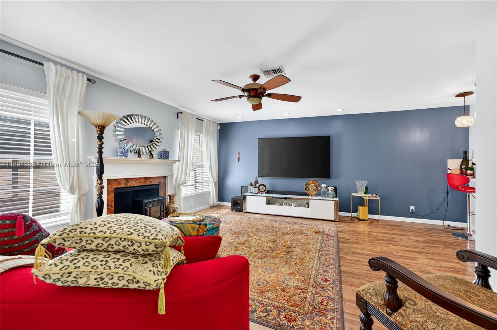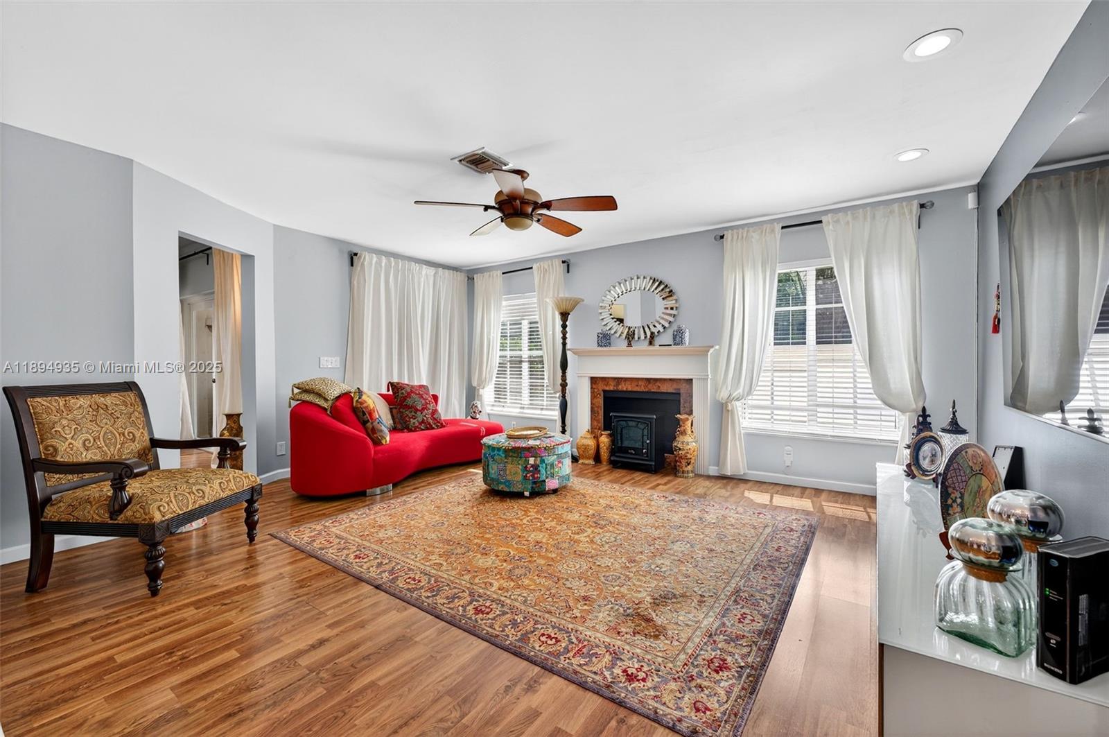 It's like having your own 2 story home w/1600 sq ft living area and 2 car garage w/no neighbors behind. Spacious floor plan w/3 bedrooms, 2.5 bathrooms PLUS a versatile loft area that many have converted to a 4th bedroom. New Impact windows & Doors, New Quartz kitchen counters w/updated stainless steel appliances, beautiful solid wood cabinets, Open Kitchen to Family Room. Southern view w/ lots of natural light. 1st floor also has living & dining rooms, perfect for entertaining! Step outside to the screened outdoor large pavered living area. Stress free living with your exterior taken care of by the HOA.