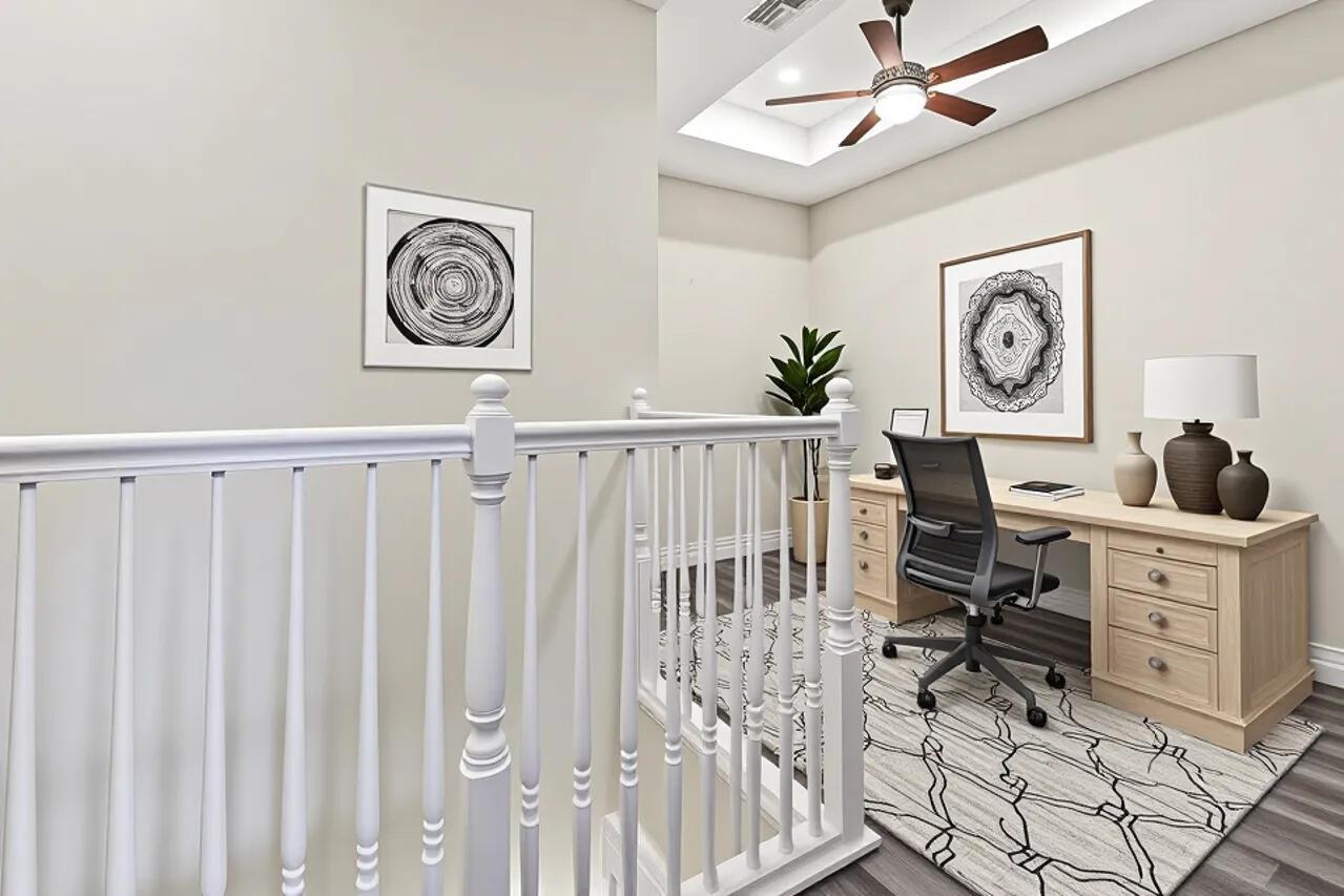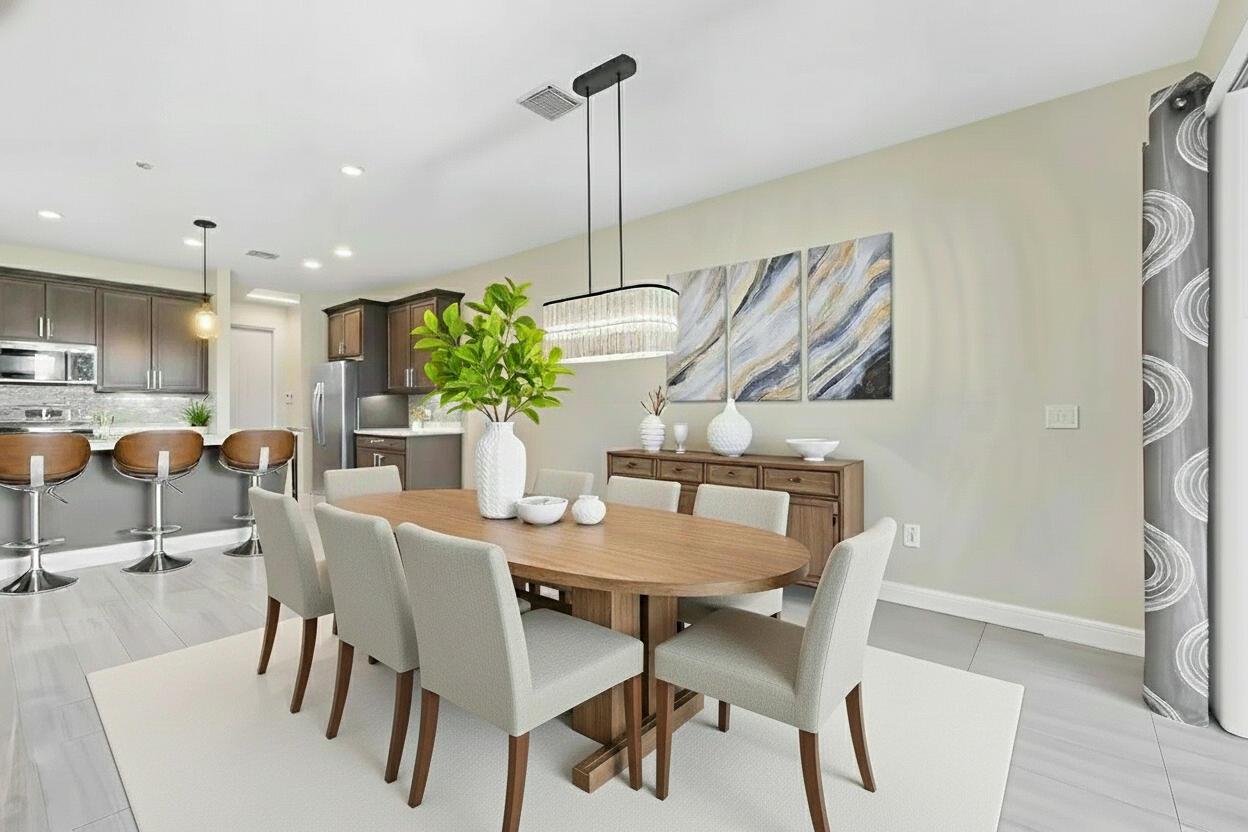 Spectacular! This stunningly updated 3-bedroom + loft/den/office, 2.5-bath, 2-car garage home truly has it all. Built in 2018 and beautifully maintained, it offers the perfect blend of modern design, comfort, and convenience. You'll fall in love with the large open floor plan and chef's dream kitchen, featuring a massive quartz island, state-of-the-art stainless steel appliances, morning bar, and custom-built pantry. The home is filled with natural light and designed for entertaining, with an inviting screened-in patio and a fully fenced backyard ideal for relaxing or dining outdoors. No carpet anywhere!! -- porcelain tile spans the entire main level, and luxury vinyl flooring continues throughout the second floor for a clean, modern look. Every bedroom features soaring ceilings