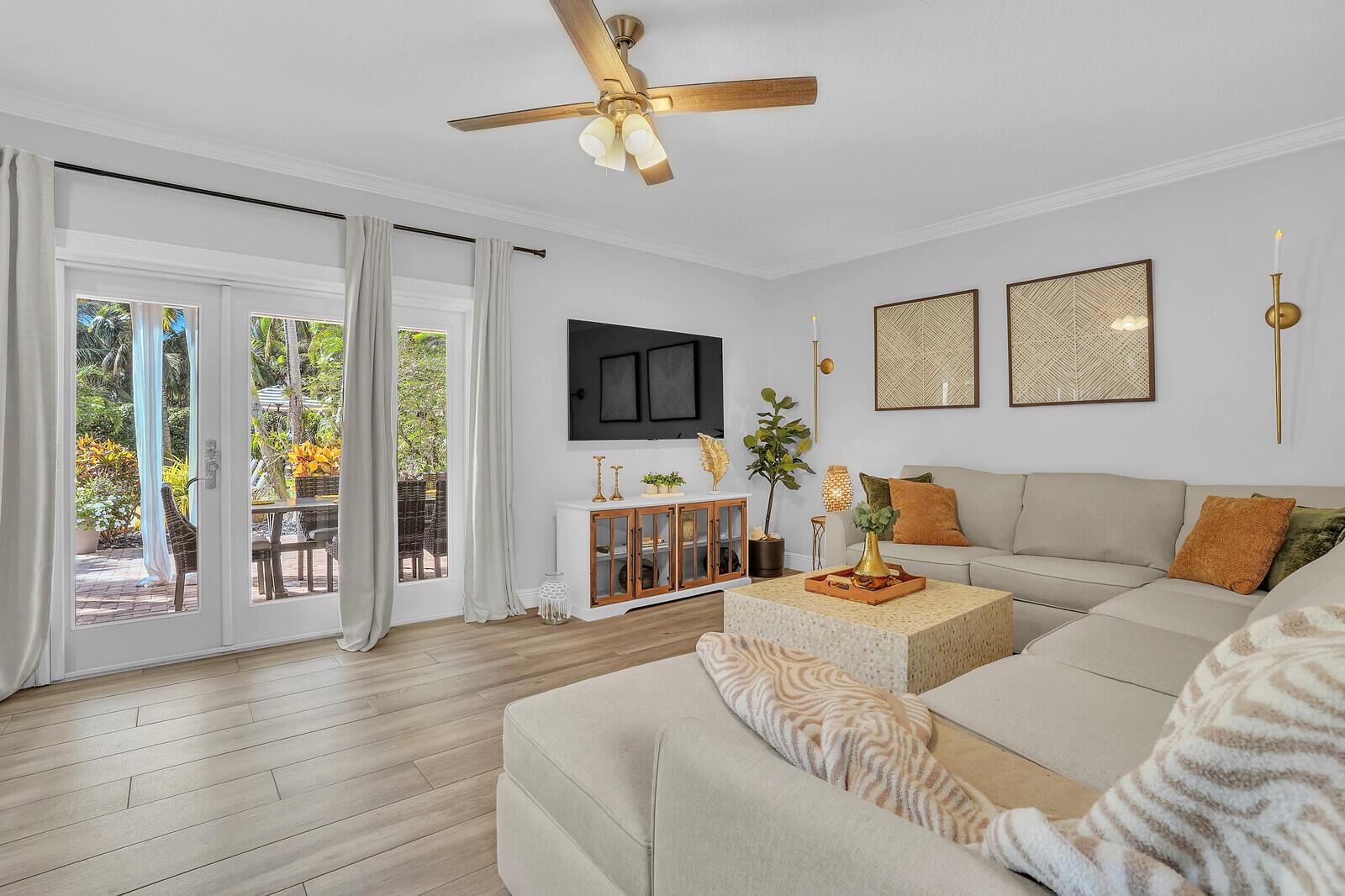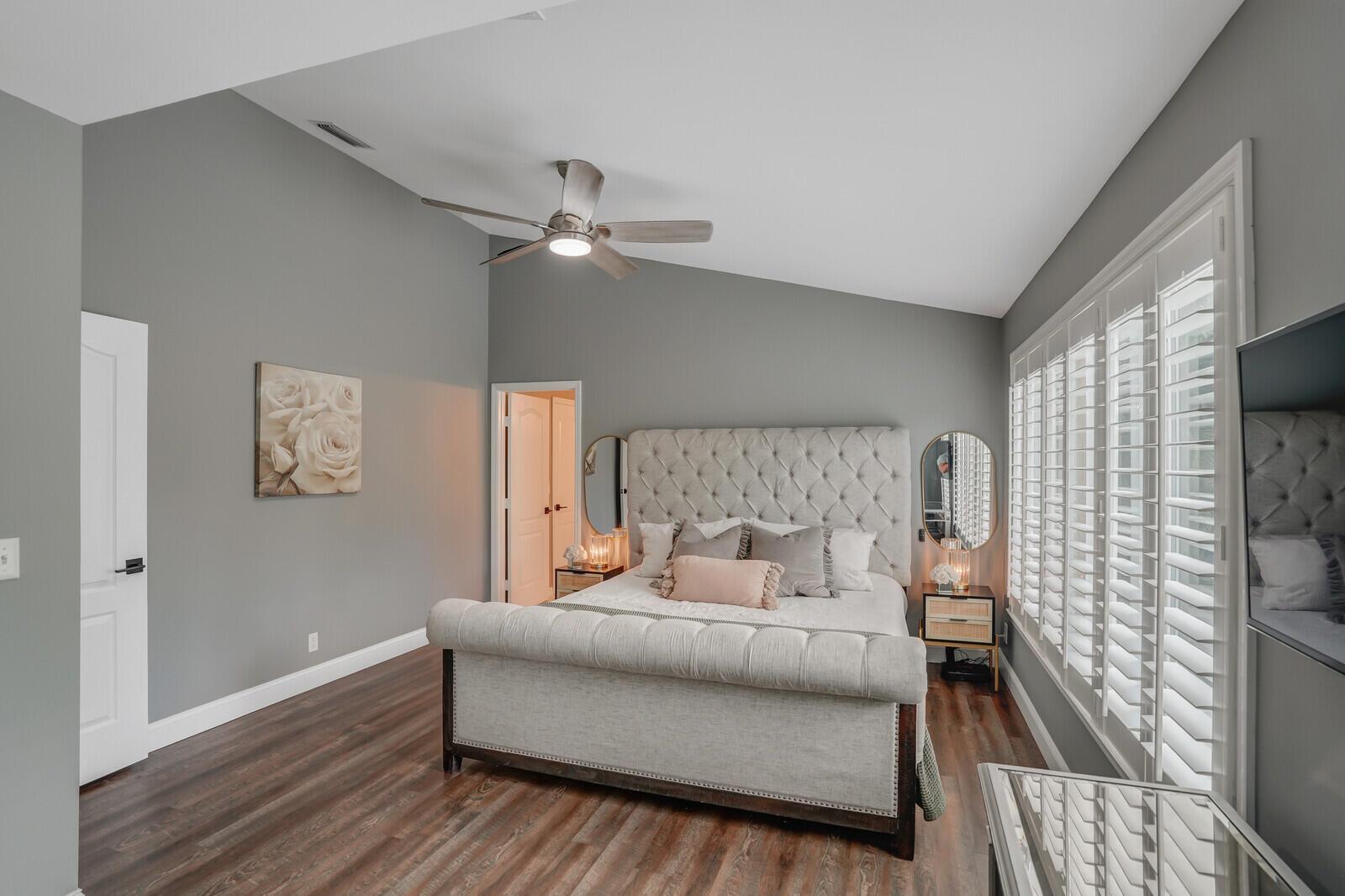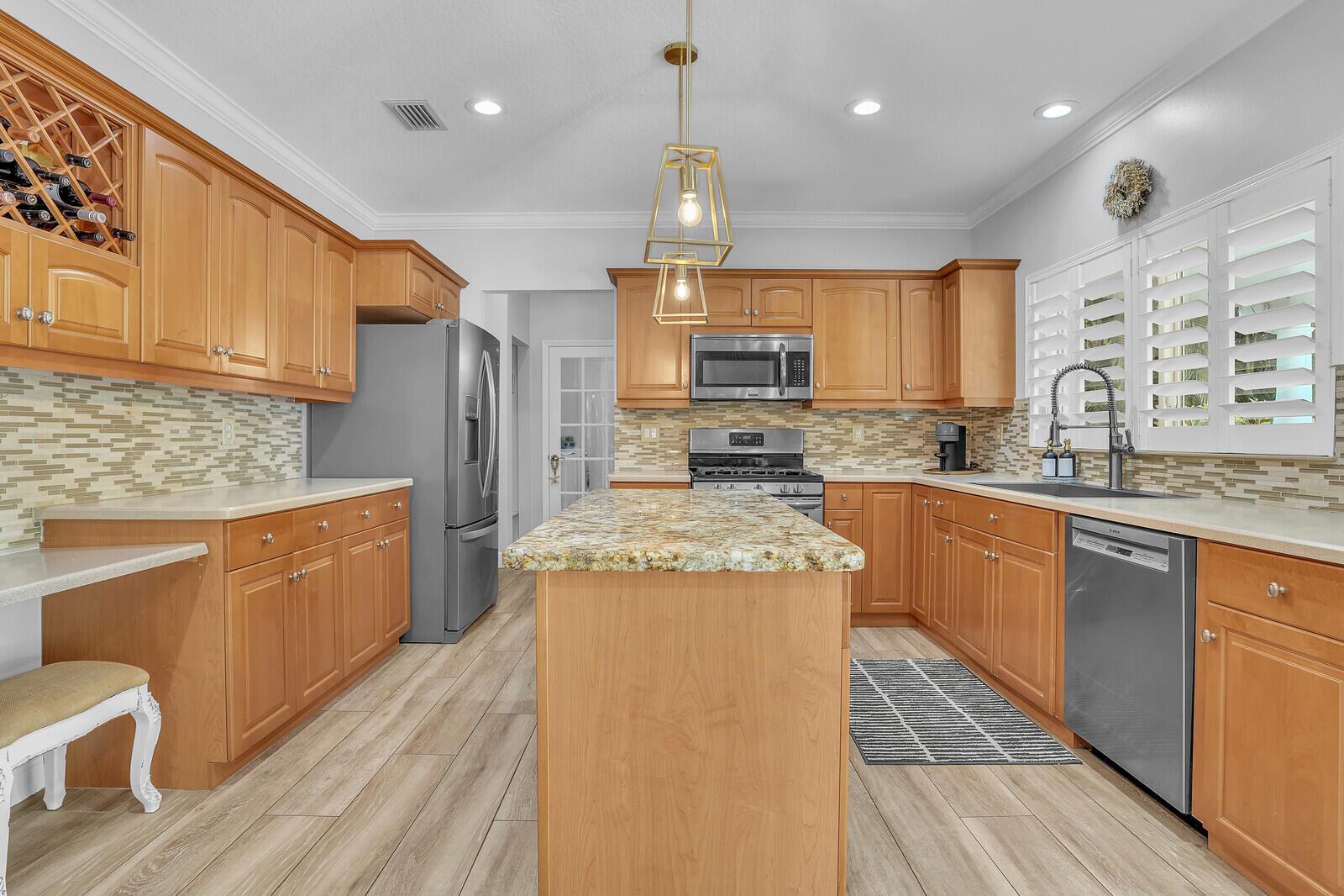 One of Palm Beach Gardens' best-kept secrets, The Hunt Club is a beautiful gated community tucked in the heart of town. This stunning home sits on a premium ⅓-acre lot, one of the most desirable in the neighborhood, surrounded by lush landscaping and total privacy. Enjoy your own tropical oasis with a resort-style pool featuring a waterfall accent, professional lighting, and a covered lanai--perfect for relaxing or entertaining.Inside, imported wood-look tile floors, impact glass, double crown molding, plantation shutters, high ceilings, and custom built-ins. The gourmet kitchen offers a gas stove, oversized granite island, custom wood cabinetry with crown molding, and a built-in wine rack that flows effortlessly into the open living and dining areas.