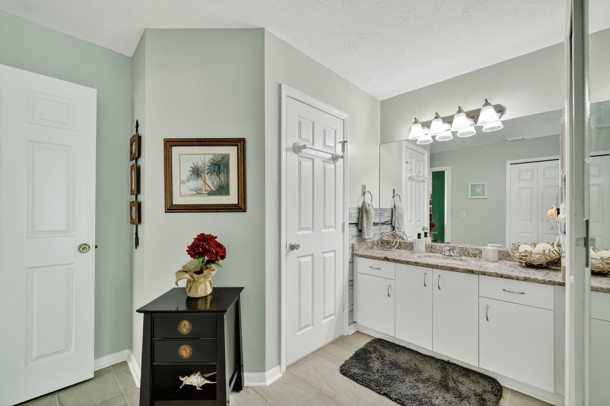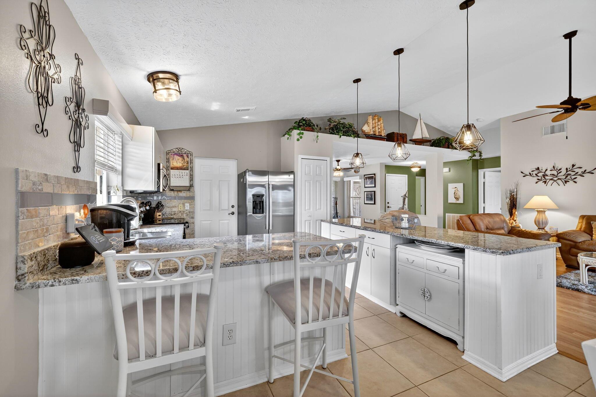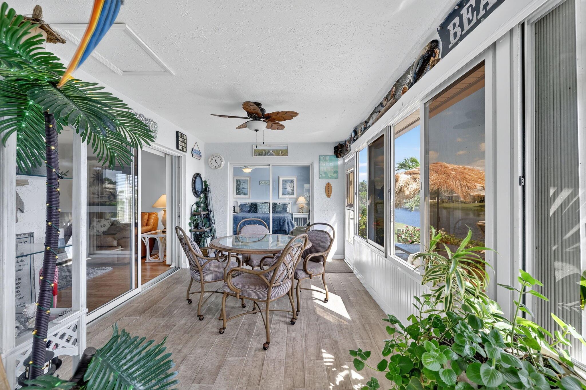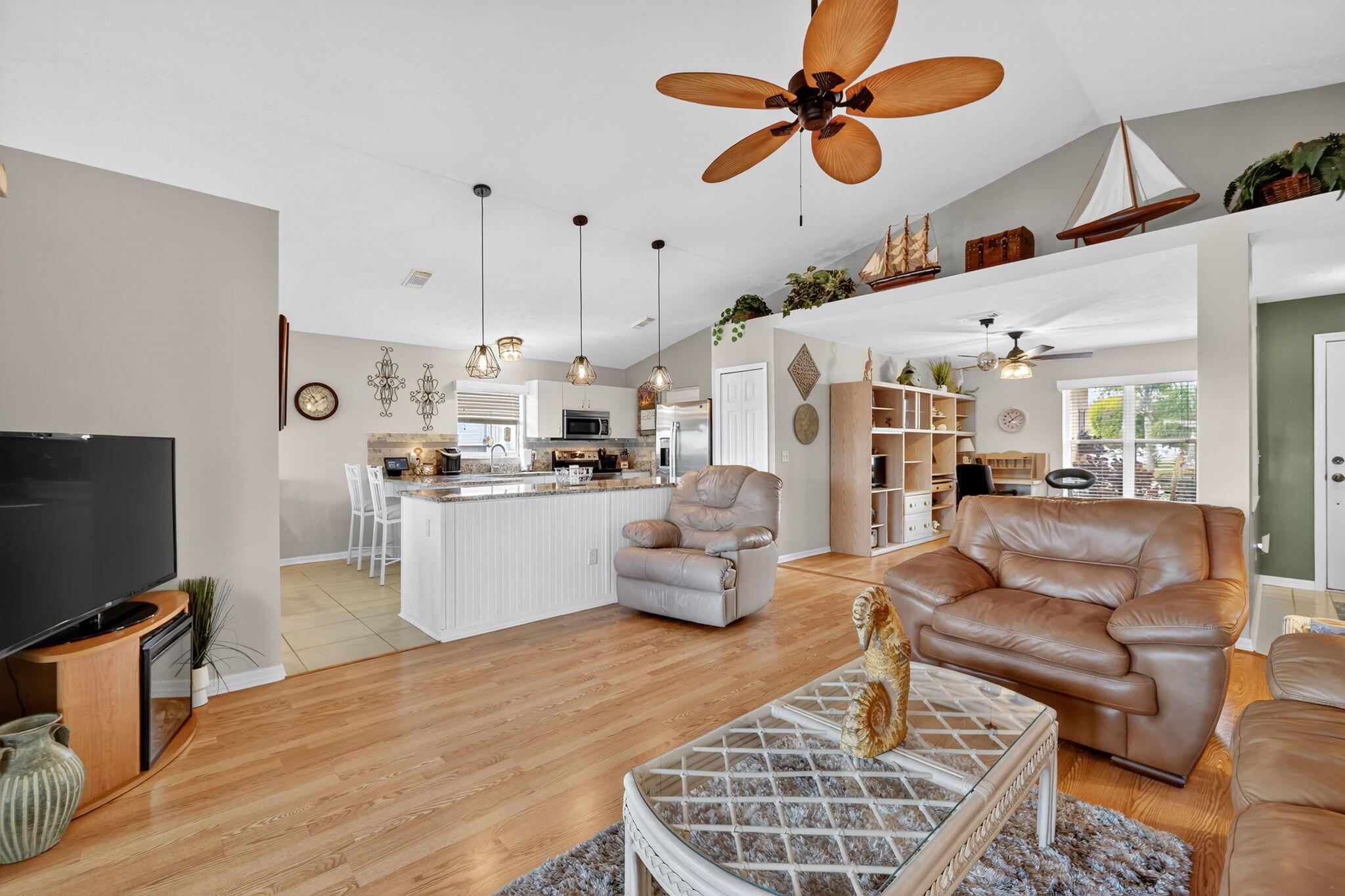Beautiful lake view 2-bedroom 2-bath home. This home is located in the 55-plus Spanish Lake Fairways community. This community is a LAND LEASE community. The home features an open kitchen with granite countertops and white cabinets, accompanied by newer appliances. The kitchen overlooks a spacious living room and dining area. The primary suite has two closets. One is a walk-in closet. The home has laminate and custom tile throughout, no carpet. A lake view is visible from the living room, kitchen, and primary suite. The house is beautifully landscaped and situated on a private cul-de-sac. The home features accordion shutters for added protection against storms. The land lease includes trash removal, lawn care & amenities: private golf course, pickleball, tennis, and shuffleboard. Must
