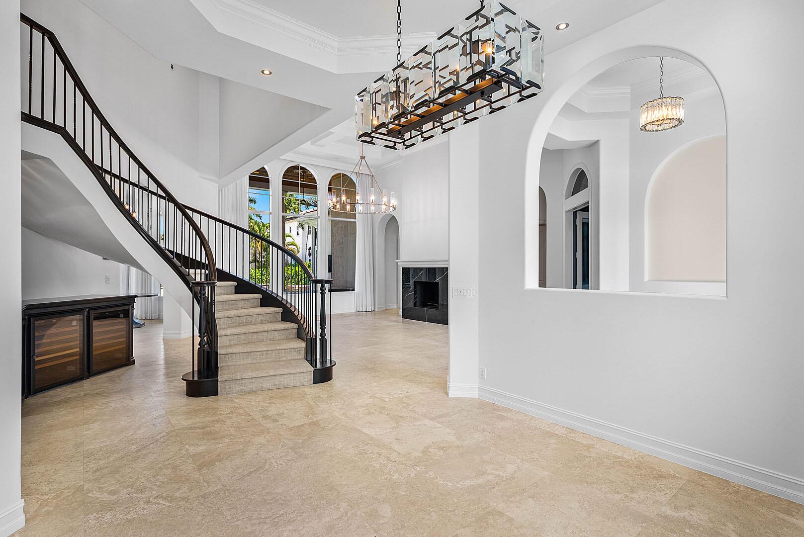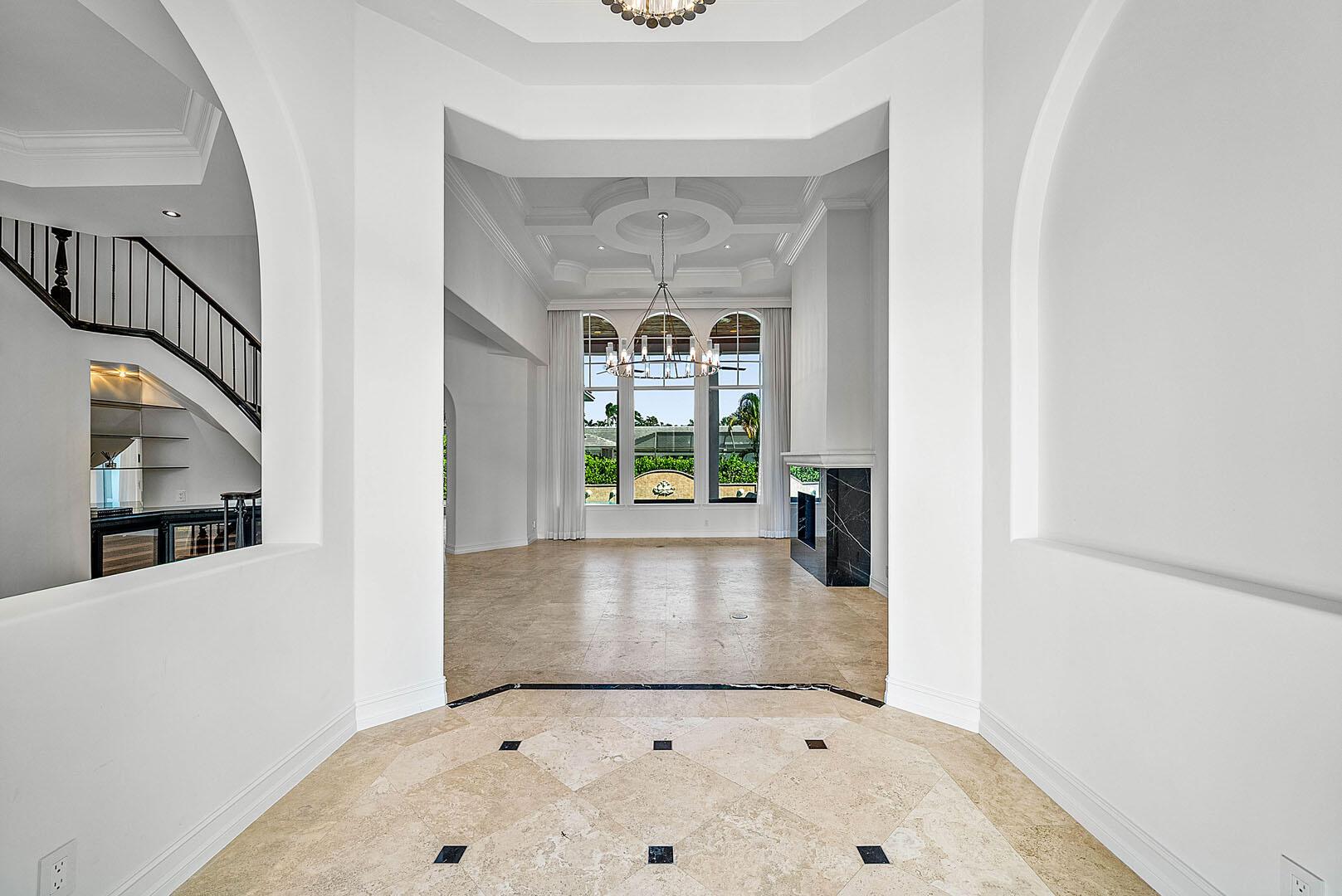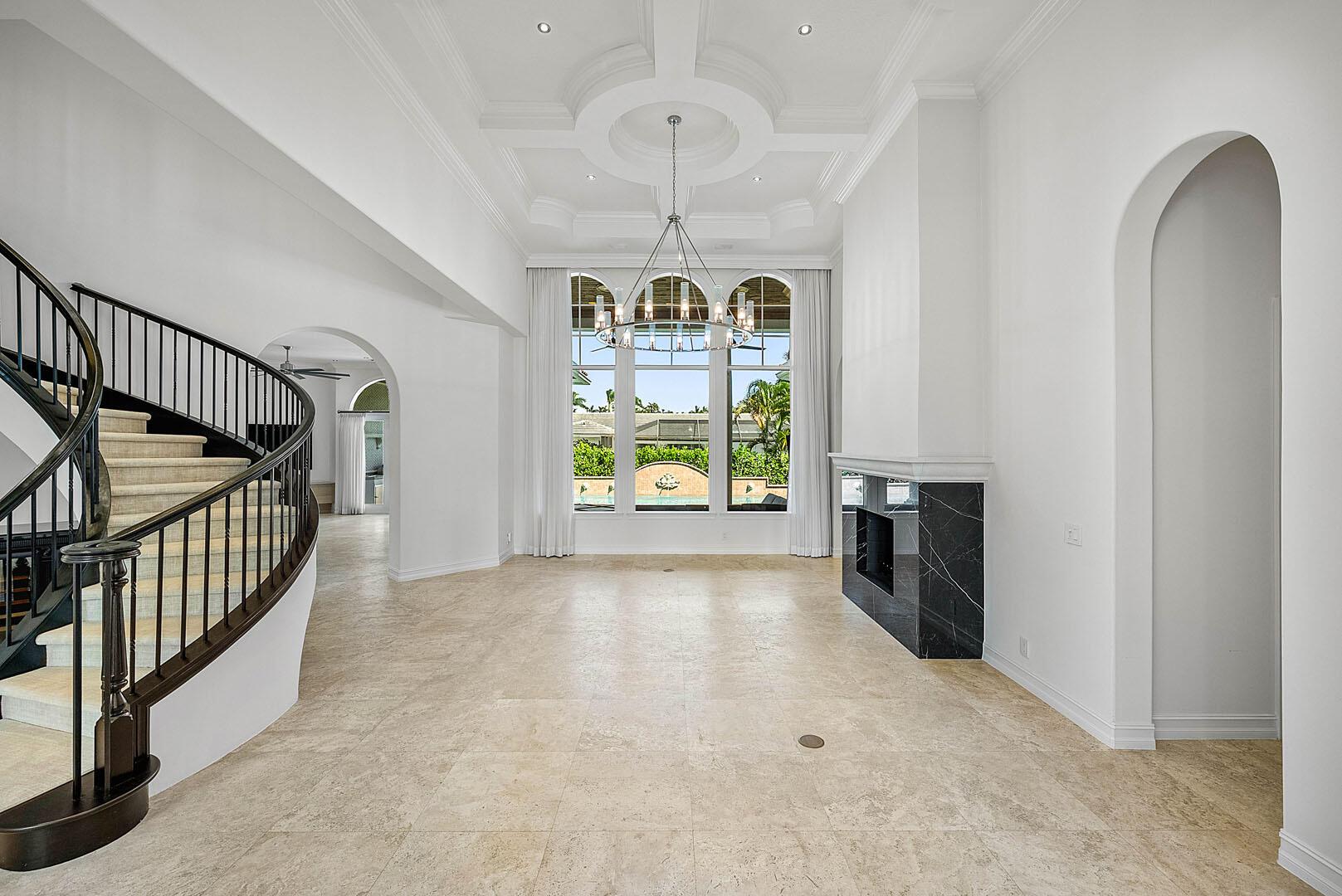 Welcome to 2124 West Maya Palm Drive, a beautifully renovated transitional estate in Boca Raton's Royal Palm Yacht & Country Club. Designed with elegance and comfort, this home offers a light-filled layout and refined finishes. The formal living room features a marble fireplace and serene backyard views. The first-floor primary suite is a luxurious retreat with new hardwood floors, dual custom closets, a spa-like bath with marble vanities, separate water closets, a soaking tub, and motorized shades. The main level also has a private office with built-ins, an elegant powder room, and a guest suite with new flooring and an updated bath. The gourmet kitchen has been reimagined with ample storage, sleek countertops, and dual dishwashers, opening a spacious family room perfect for