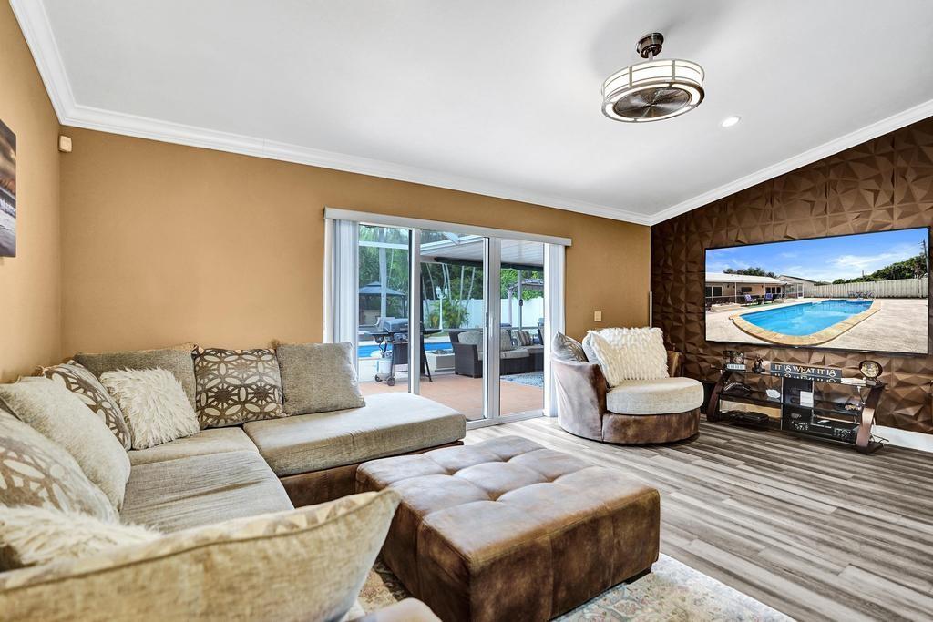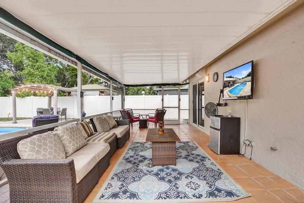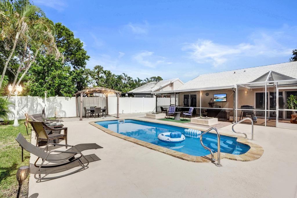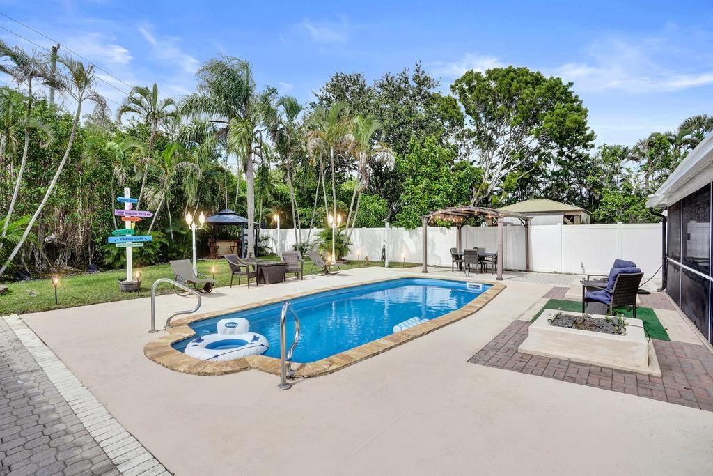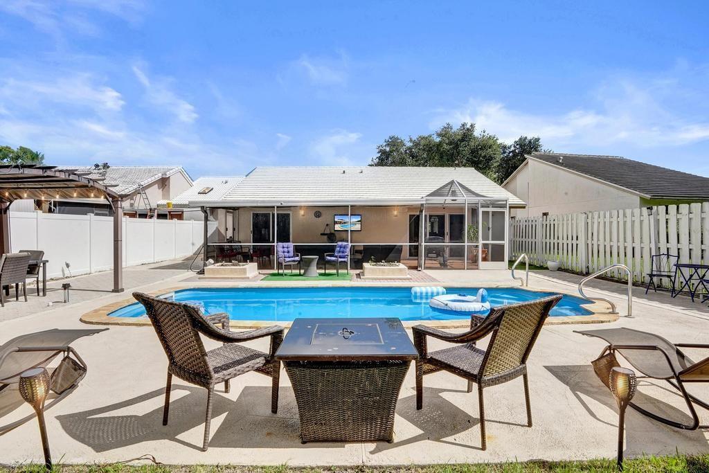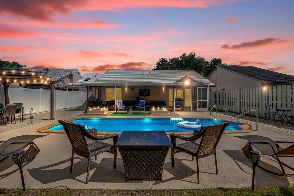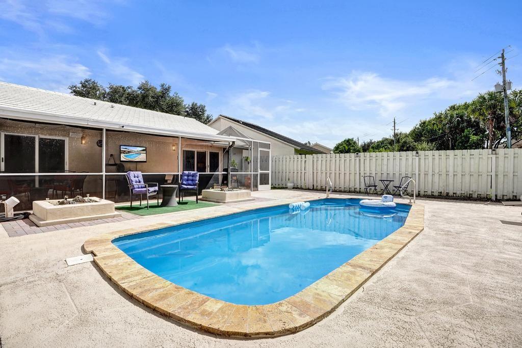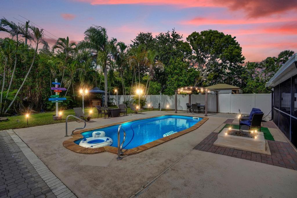 Welcome to your private paradise in Strawberry Lakes! This 3-bed, 2-bath, 2 car garage pool home is designed for entertaining. The backyard is the star, 1 of only 7 in the community with a sparkling pool, tiki hut, & plenty of space to host unforgettable gatherings. Enjoy a covered, screened patio, lush landscaping, & one of the largest lots in the neighborhood. Inside, you’ll find vaulted ceilings with crown molding, recessed lighting, luxury vinyl plank flooring, a modern kitchen & white granite counters, a skylight, & stainless appliances. All windows, doors & sliders are hurricane impact. The primary suite features a double door entrance, an upgraded bathroom with white and blue subway tile, a rain shower, & dual vanities. This home is move-in-ready, ready to host your first party!