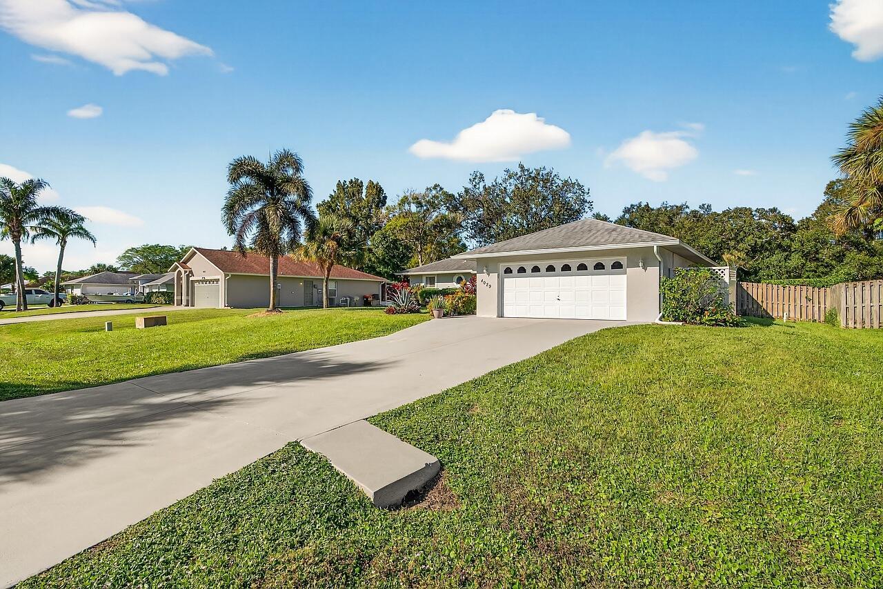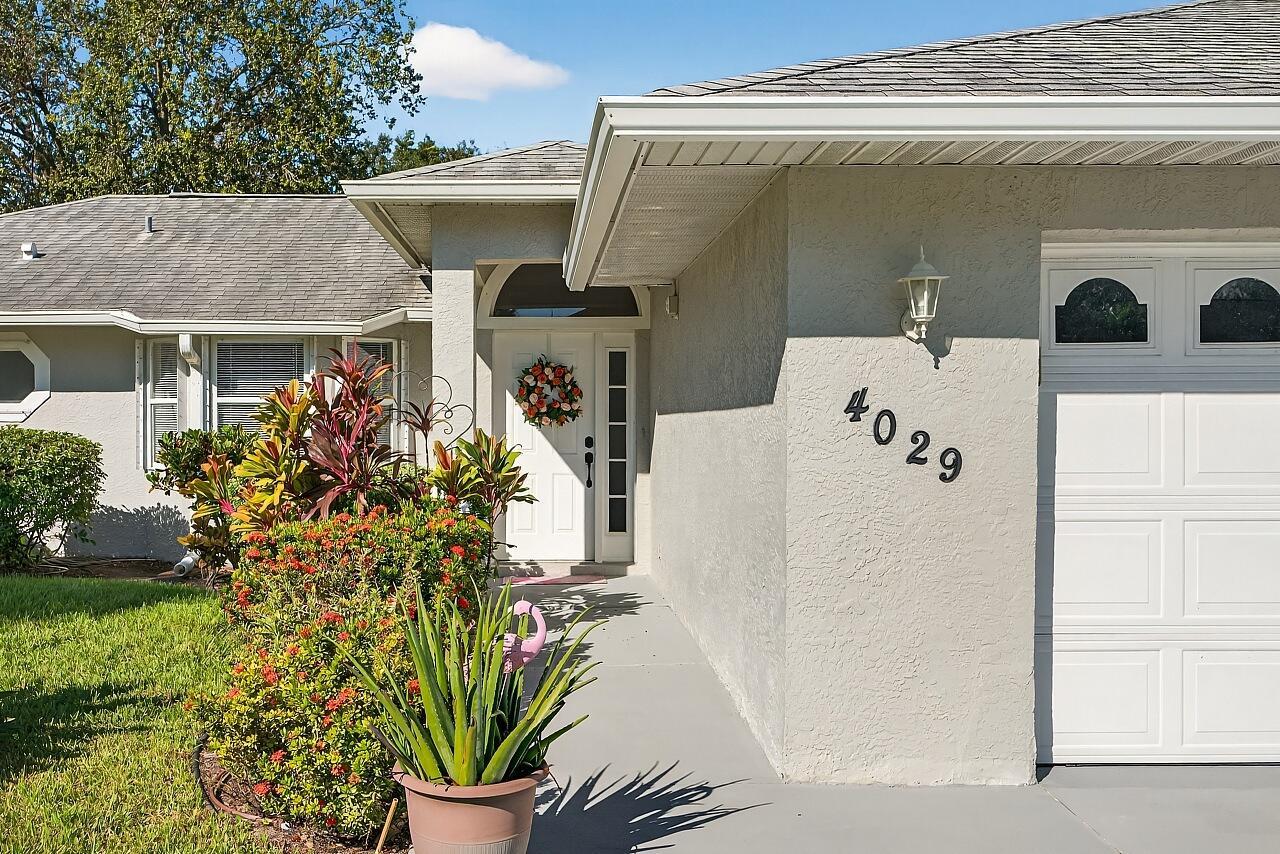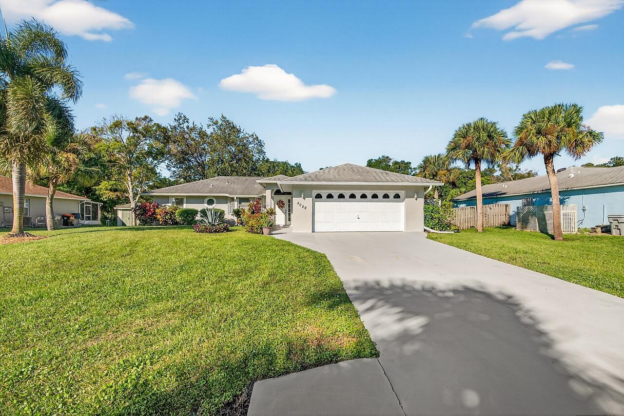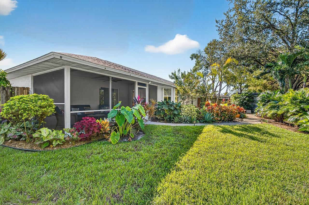 Welcome to your Private Tropical Retreat in desirable Treasure Trail Vero Beach! A rare blend of timeless elegance, comfort, and privacy. This impeccably maintained 3 bedroom, 2 bath, 2 car garage w/ storage shelving CBS home - Not WOOD FRAME- is perfectly situated in one of Vero Beach's most sought after LOW HOA neighborhoods, known for its charm and tranquility. Crafted with enduring CBS construction. Not wood frame! This home rests on a lush, oversized fenced in lot framed by mature, colorful and manicured landscaping, creating a peaceful sense of seclusion. Follow the beautifully paver stone walkway to the expansive screened lanai, ideal for morning coffee, al fresco dining, or evening gatherings under the palms. Inside, a thoughtfully designed split-bedroom