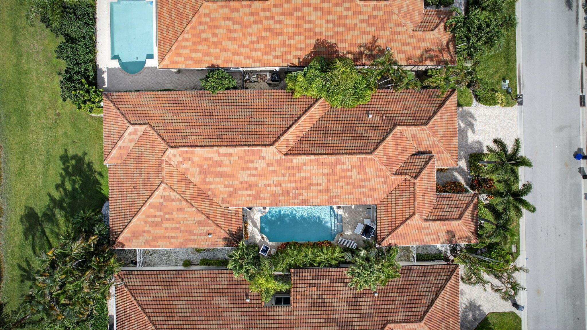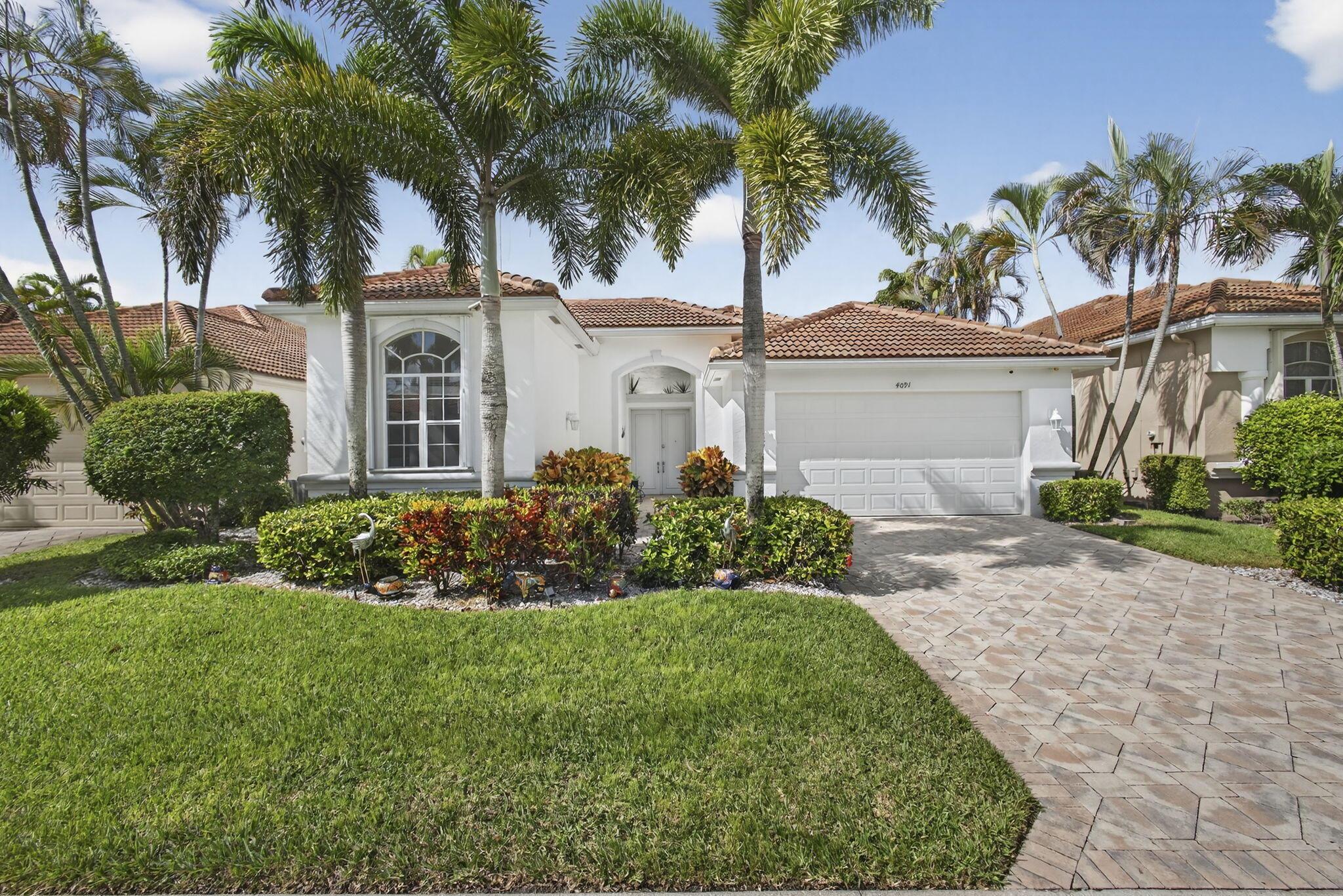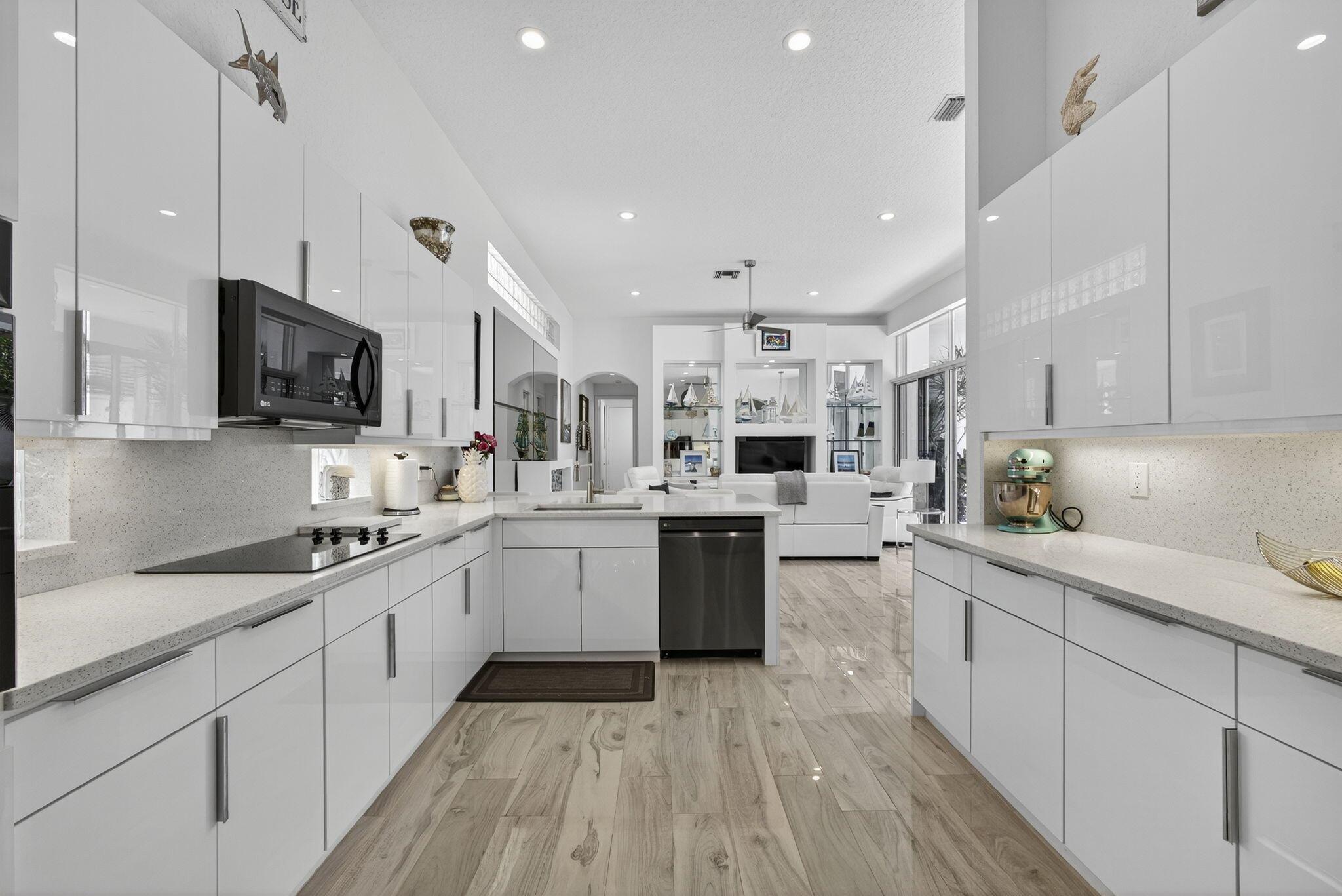 Rarely available courtyard model in Laurel Estates. This stunning home features a private courtyard w/ a large patio & pool surrounded by lush landscaping, plus an oversized 1BD/1BA guest suite with direct courtyard access, ideal for in-laws or guests. The beautifully updated kitchen offers white quartz countertops, white cabinets with pull-outs, and new appliances. Elegant gray & white French porcelain tile flows throughout. The primary suite features new impact French doors that open to the back patio with beautiful lake and golf course views. The great room and dining areas share the same scenic view. A full security system with cameras and remote access adds peace of mind, while the pool area includes a custom safety gate and tasteful blue accent decor for a tranquil outdoor retreat.