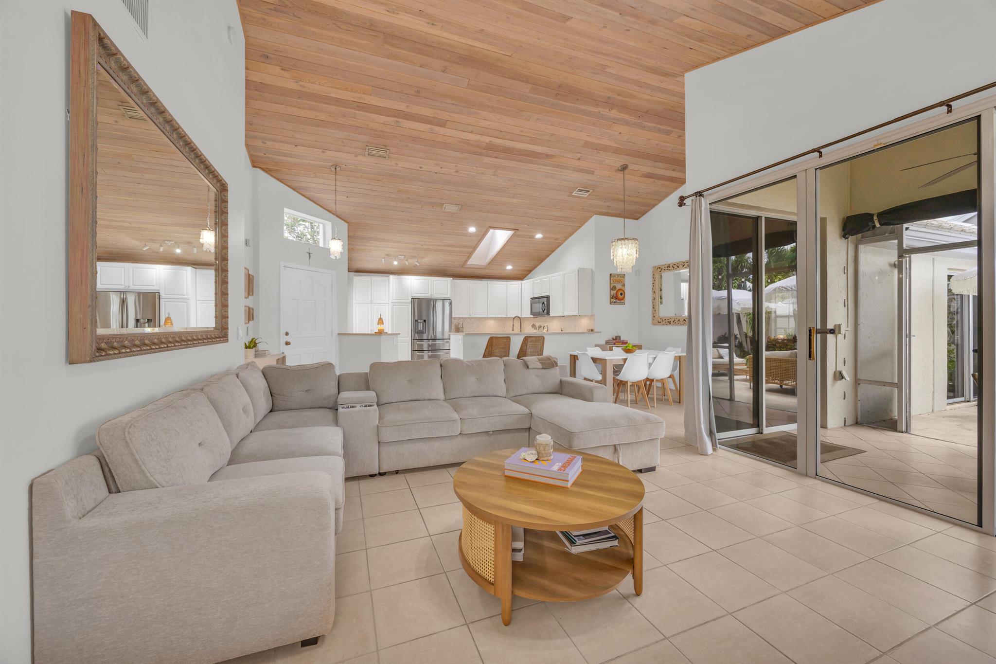 Beautifully updated 3 bedroom, 2 bath home located in the highly desirable Barclay Club at PGA National in Palm Beach Gardens. This single-story residence features a brand-new kitchen with beautiful white cabinets, quartz countertops, a stylish new backsplash, stainless steel appliances and a spacious breakfast bar perfect for casual dining or entertaining. The open-concept living and kitchen area is enhanced by vaulted ceilings finished in rich knotty pine wood, adding warmth, texture and coastal charm to the home's bright, airy feel. The primary suite includes generous closet space and an updated bath, while two guest bedrooms share a refreshed second bath.