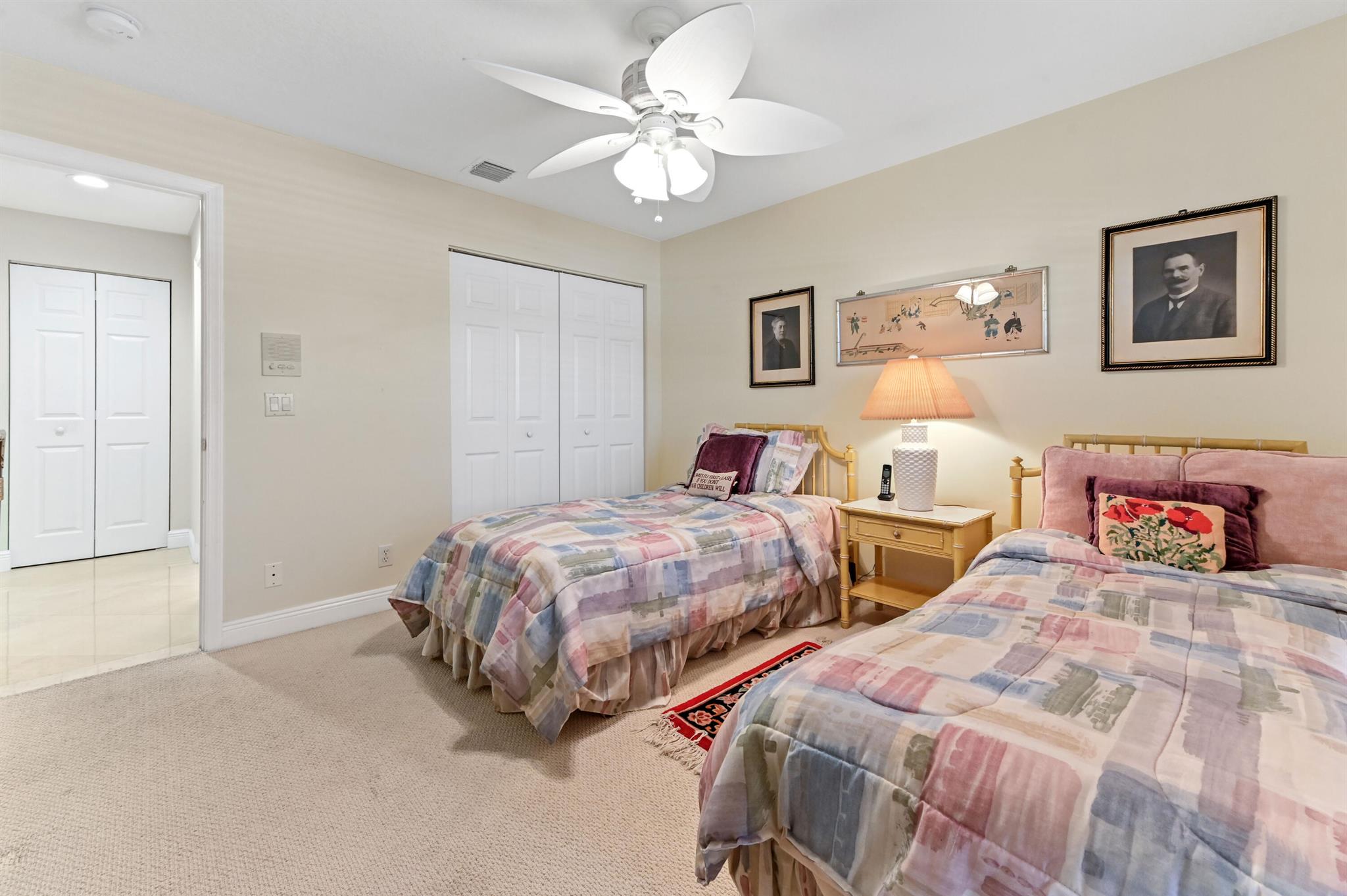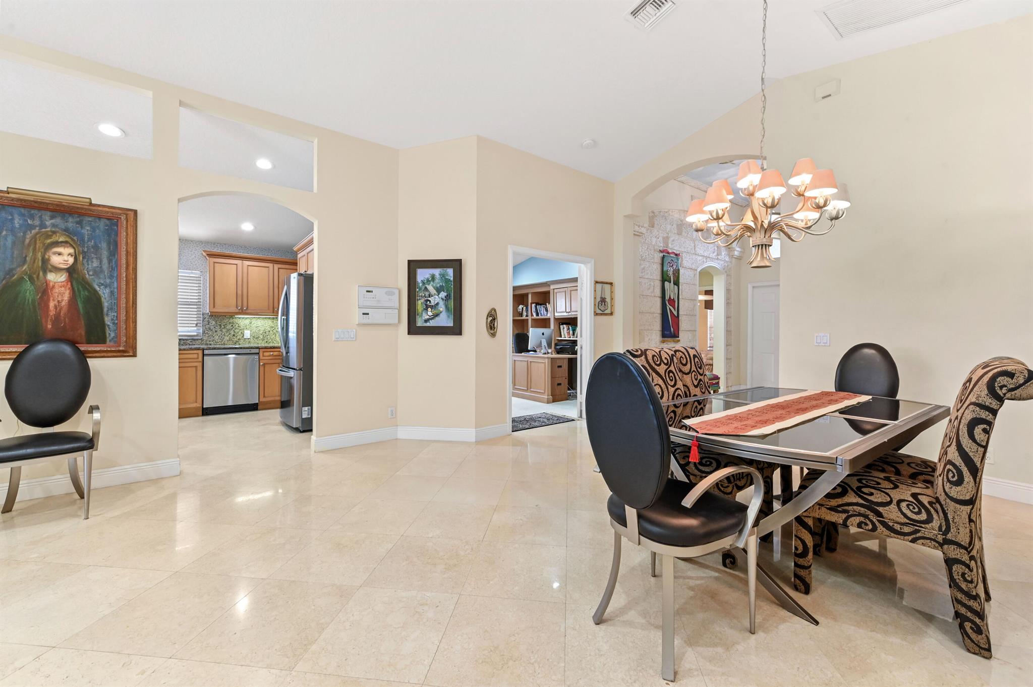 Prepare to be charmed by this beautifully maintained single-story home, perfectly situated in a desirable Lake Worth community. The residence presents exceptional appeal, featuring brand new AC unit, a tile roof, a brick paver driveway, and lush, meticulously cared-for tropical landscaping, including swaying palm trees and exotic plantings. The covered entry is secured by a decorative gated screen door, leading into an interior that immediately impresses with its high ceilings and polished Travertine-look tile flooring throughout the main living areas.