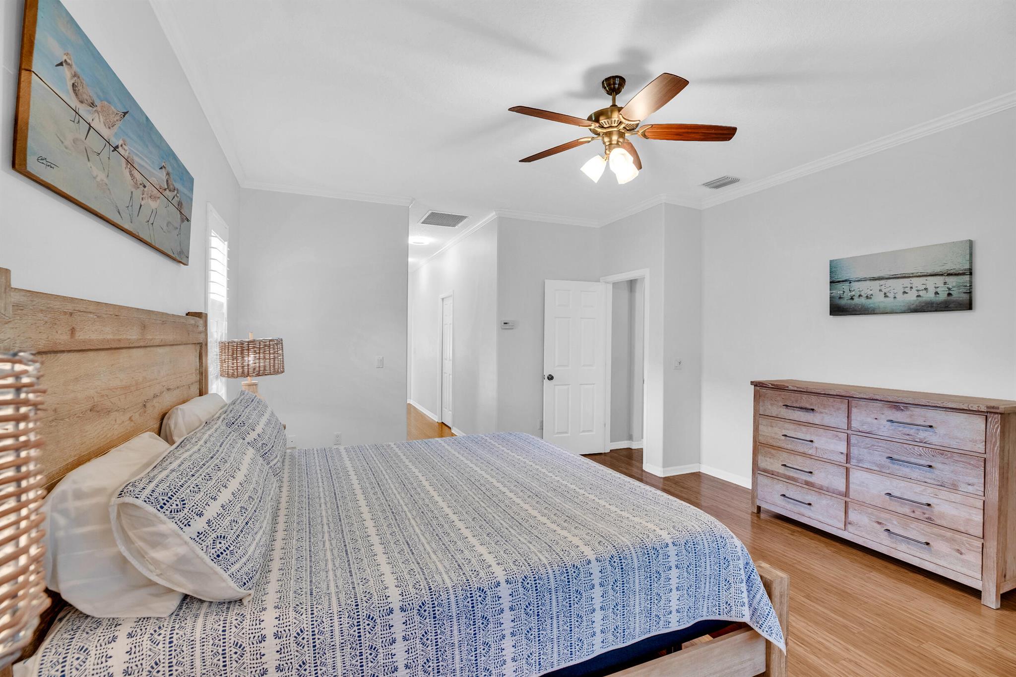 Nestled in the sought-after enclave of The Crossing, this custom-built pool home awaits. Lush .36/acre lot affords tranquility and privacy. Step inside to enjoy living areas that open to the solar-heated pool. Island kitchen features miles of cabinets and counter space with bar seating. Luxe master suite has walk-in closets, dual vanities, soaking tub, and roomy shower. Den adjoins the primary suite and can easily flex as 4th bedroom/nursery with walk-in closet. Circular drive and side-entry garage can park plenty of cars! Reroofed and replumbed, with up-to-date HVAC units and water heater, full hurricane protection and built-in generator. One-acre lake is the focal point of this elegant neighborhood. Life is a breeze on these oak-canopied streets!
