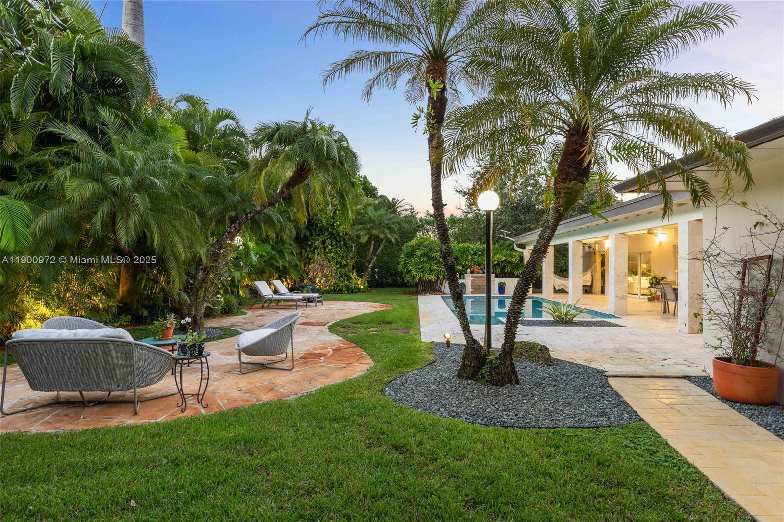 Hidden behind a lush private atrium, this 5BD/4.5BA residence lives like a private retreat. The entry sets a tranquil tone—an open-air enclave that adds privacy and a peaceful sense of arrival. Inside, light and greenery fill every space, where wood-clad ceilings, glass doors, and natural textures create relaxed sophistication. The show-stopping primary suite is a true sanctuary, rarely found in this price category—nearly two rooms in one, with a lounge area, private pool access, and a spa-inspired bath. On the opposite side, four generous bedrooms, two ensuite, offer comfort and privacy. Tall privacy hedges surround the pool, creating a serene escape with spaces to dine, lounge, or unwind. Homes of this character are seldom available—come experience it for yourself.