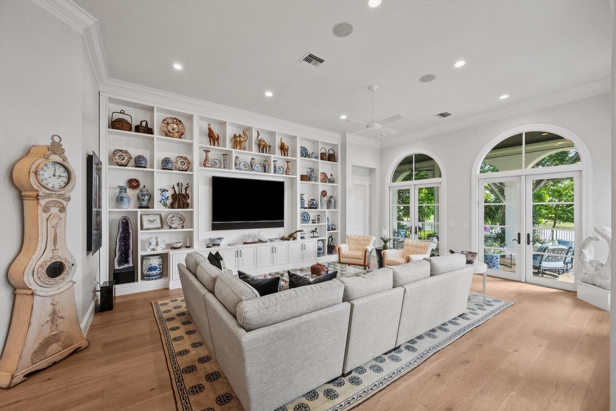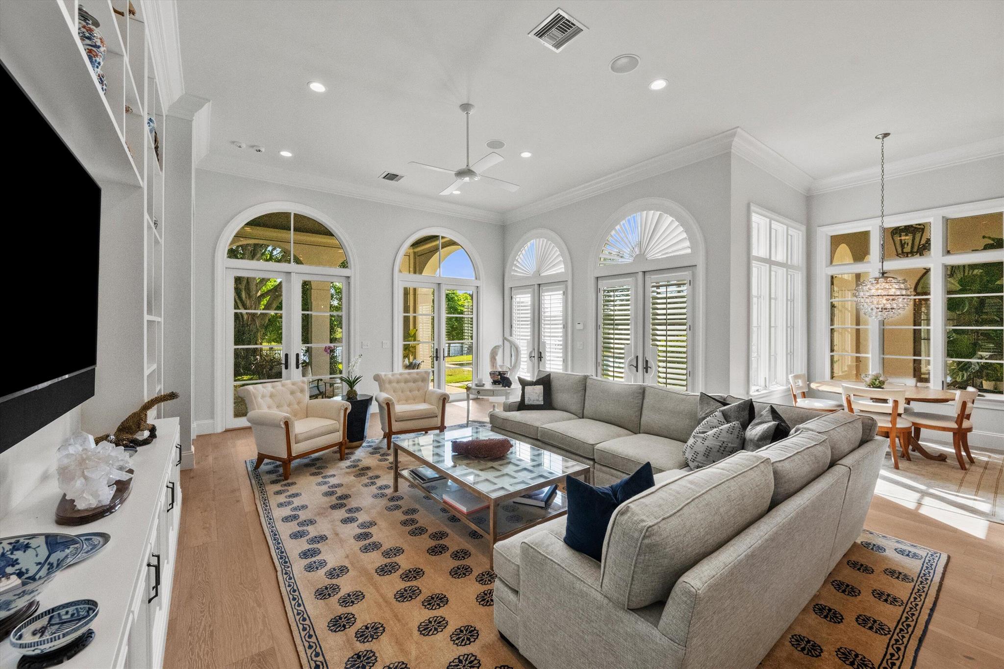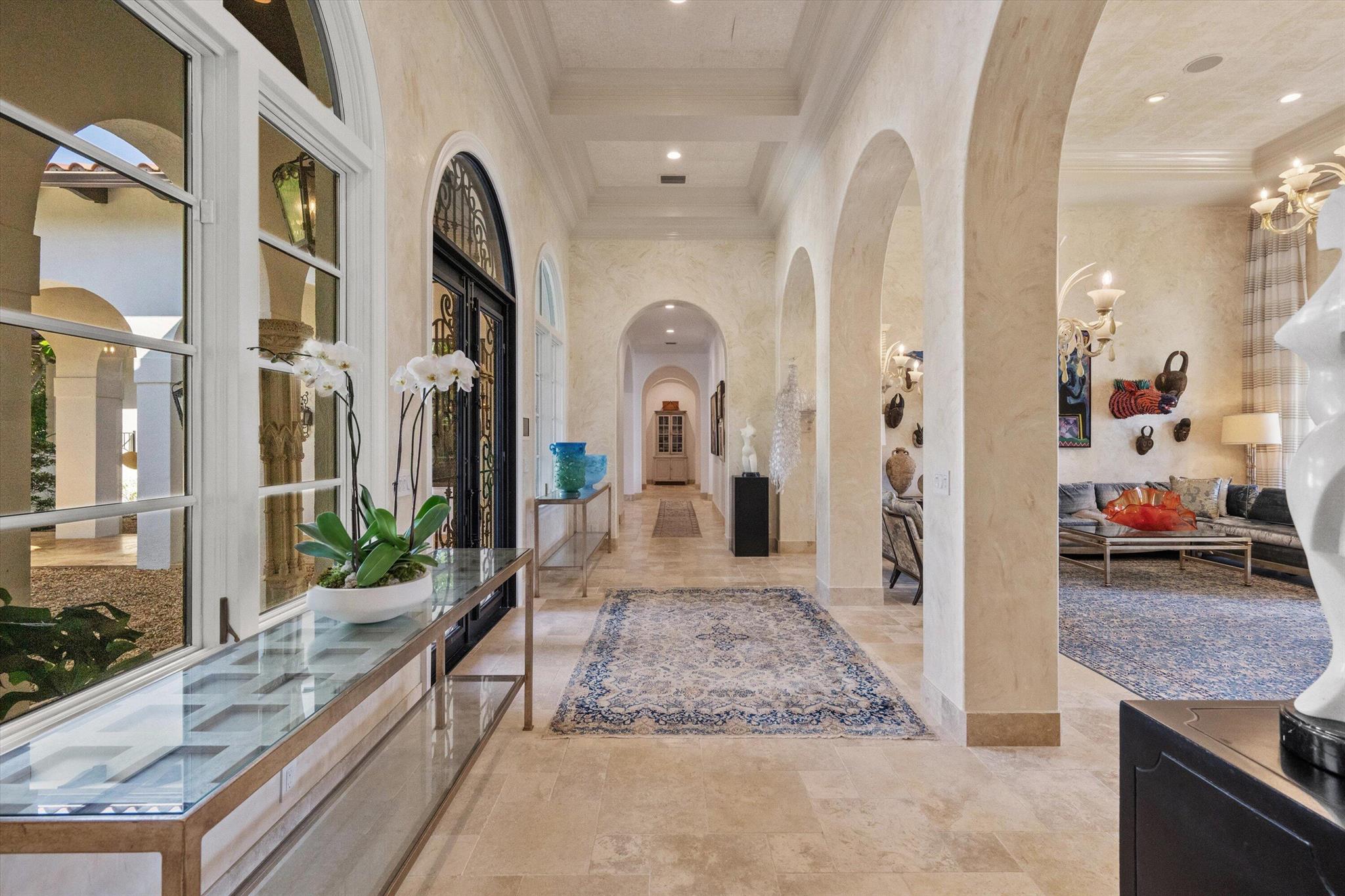 Exuding sophistication and timeless appeal, this stunning Cypress Island estate epitomizes luxury living within the prestigious Palm Beach Polo Golf and Country Club. Perfectly situated on a serene waterfront lot, the residence offers nearly 6,000 square feet of refined single-level living with 4 bedrooms, 6.5 bathrooms, and a 3-car garage.Sunlit interiors reveal a gourmet chef's kitchen appointed with Wolf appliances, a glass-enclosed walk-in wine cellar adjacent to the formal dining area, and an elegant living room anchored by a beautifully crafted fireplace. The owner's wing provides a private sanctuary featuring a sitting area, dual baths, and generous dressing spaces, while three spacious guest suites each include private baths and walk-in closets.