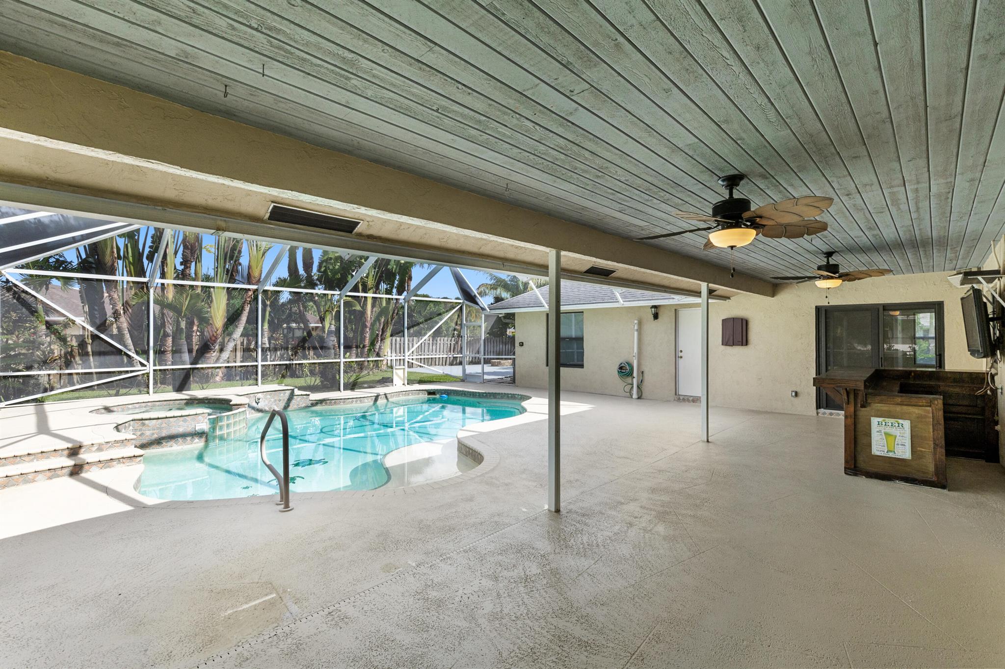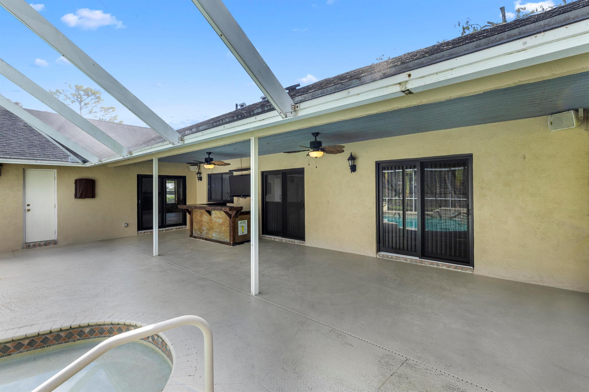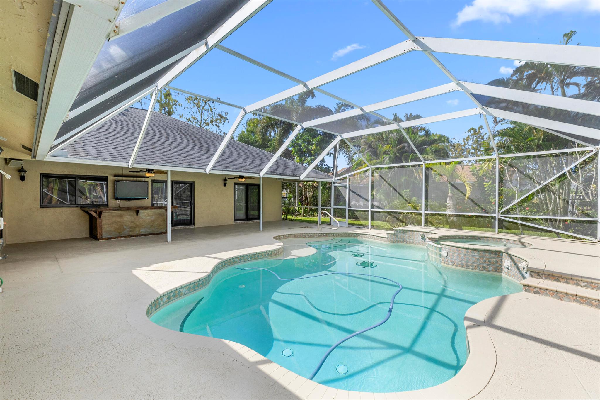 Stunning 4-bedroom, 2.5-bath pool /spa home offering approximately 2,400 sq. ft. of air-conditioned living space on a sprawling 1/3-acre corner lot in Pinewood Manor, featuring NEW impact windows and sliding doors (2025), impact-rated front door and bathroom pool door (2025), an impact-rated garage door (2021), a newer roof (2017), and a resort-style screened-in pool with heated spa and custom patio bar! Located in one of Wellington's most desirable non-HOA neighborhoods, this home offers the perfect blend of comfort, quality, and South Florida lifestyle living. NO HOA and NO restrictions! Bright split floor plan with high ceilings, wood floors in all bedrooms, a renovated kitchen opening to a spacious family room with fireplace and wet bar.