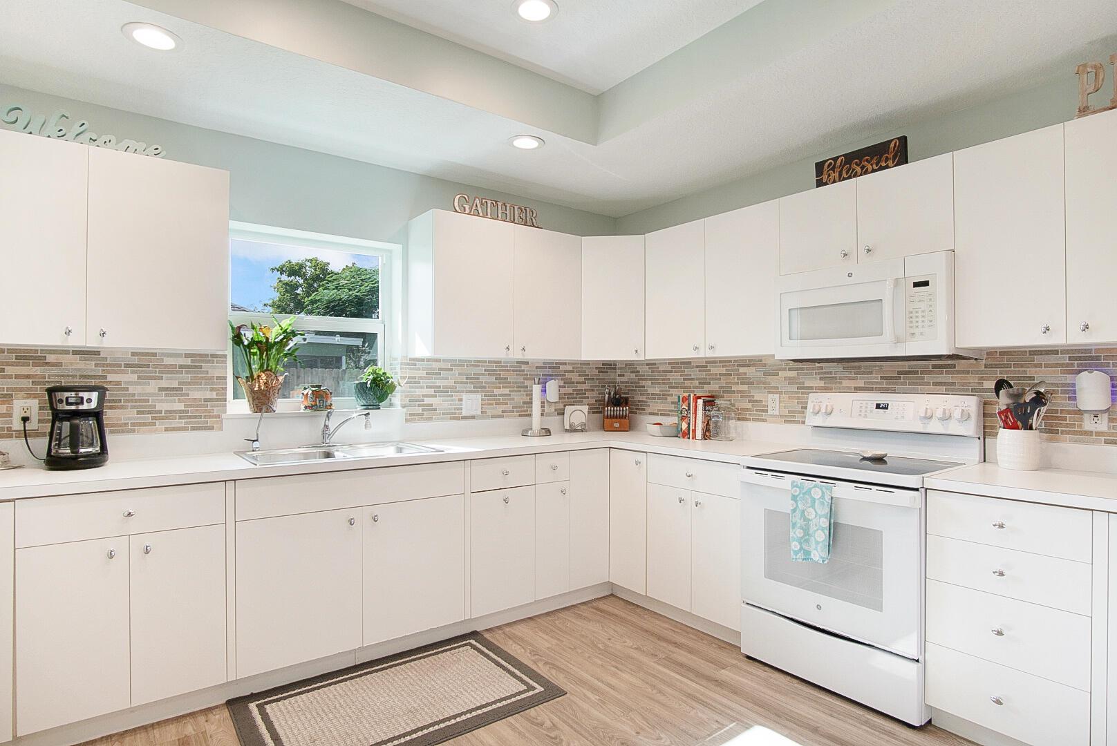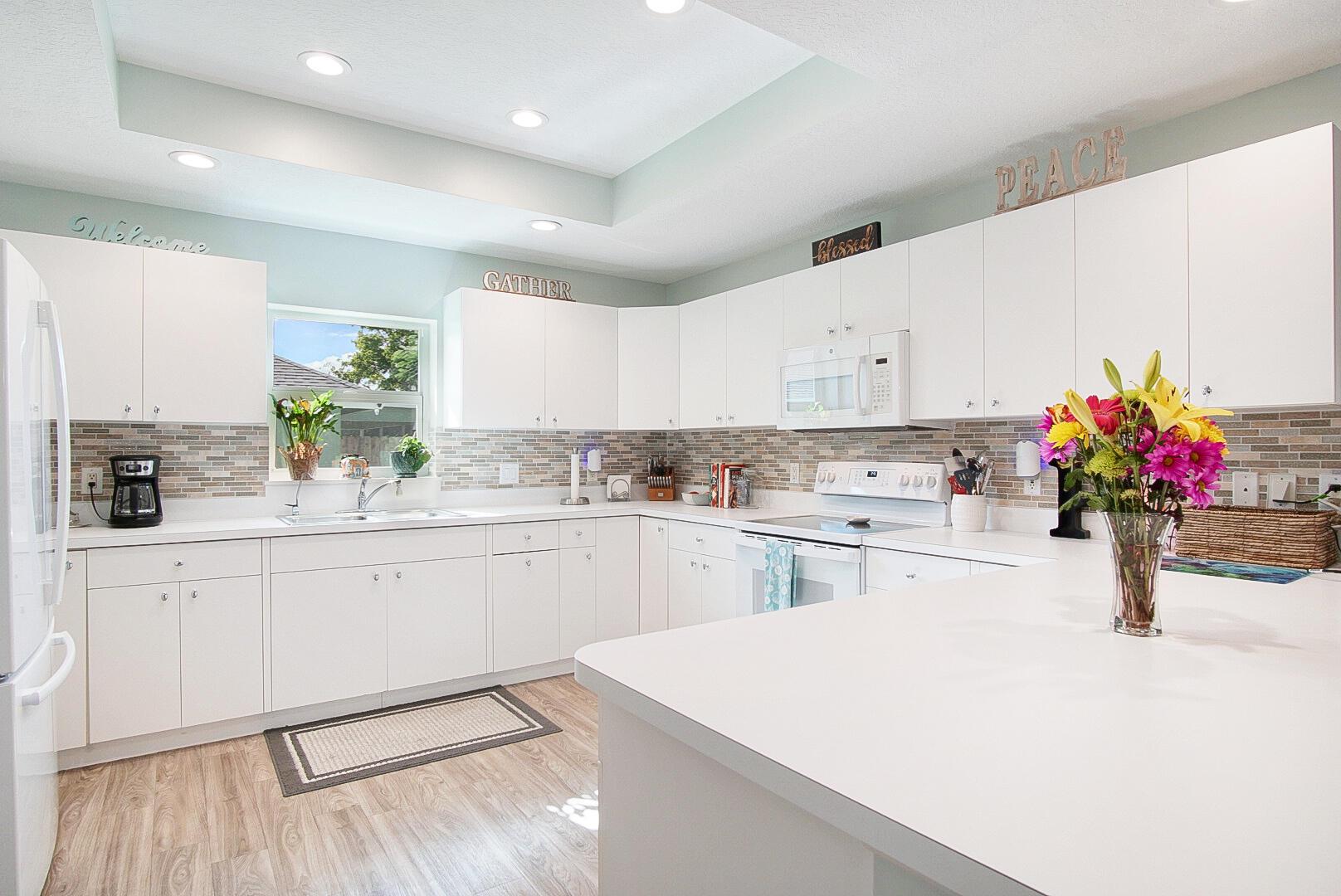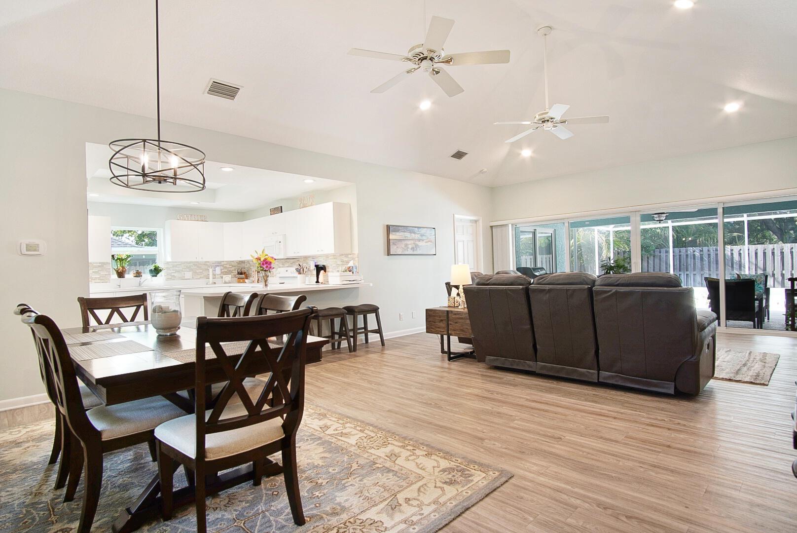 Super Clean, partially upgraded 3/3/2 home in deisrable Zeus Park neighborhood just 1-1/2 miles to beach. Vaulted ceilings, overhead lighting, lots of windows and wall to wall sliders opening to outside covered patio, expand the living space. The home boasts 2 Master Suites, vinyl flooring, lots of cabinets and prep space in white kitchen with Breakfast Bar, 2022 Bottom Freezer Refrigerator, 2024 Washer / Dryer, w/warranties, 2025 New Hurricane Impact Windows/Sliders, 2025 R38 Insulation added. Move-In ready!! Residents of this area can walk/bike to beach,restaurants, shops, parks and have many options for golf and boating. Residents have private boat ramp rights through the Hobe Sound Boat & Dock Assoc, public tennis, pickleball, racquetball, soccer & baseball fields. Florida living!