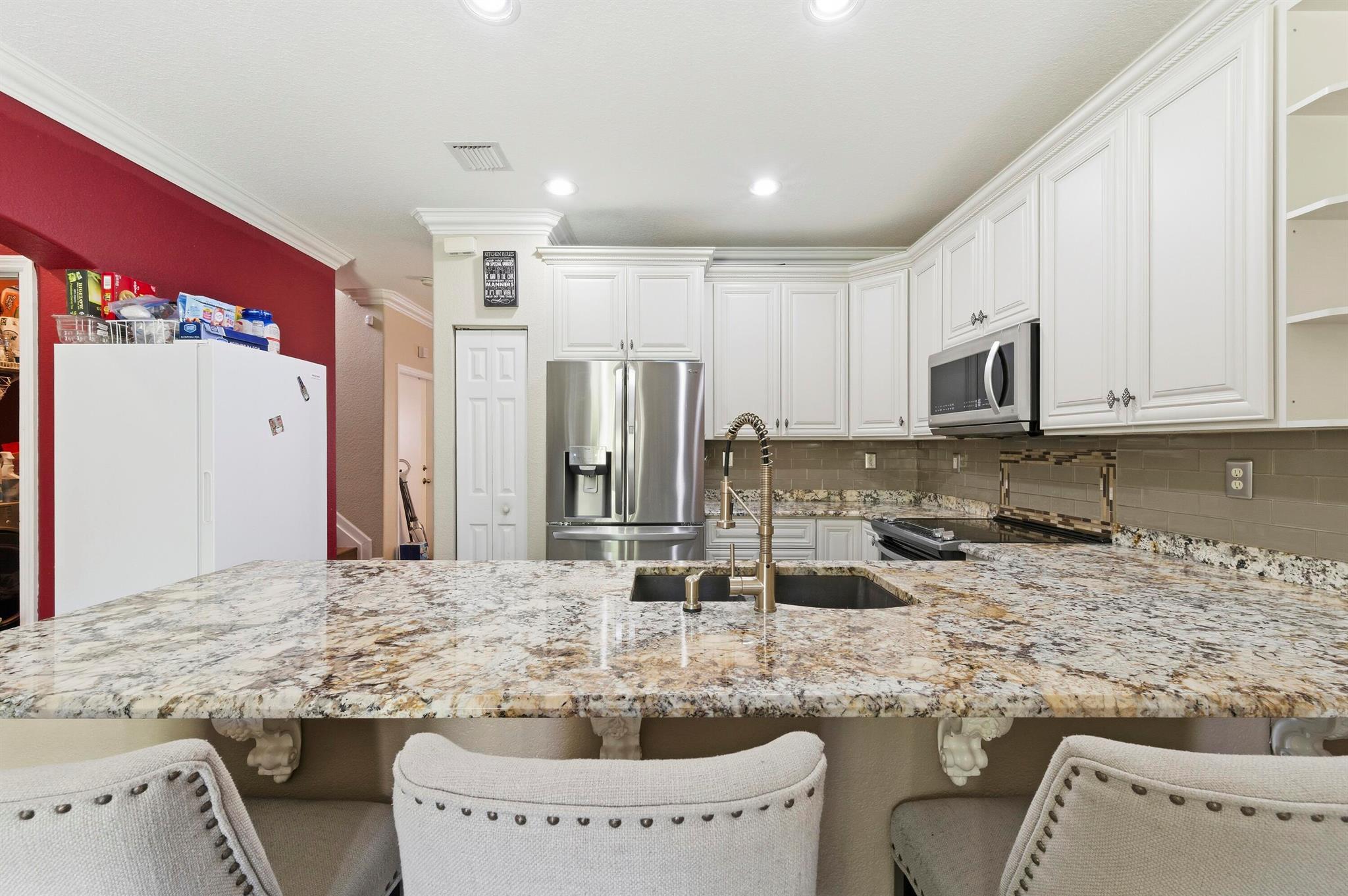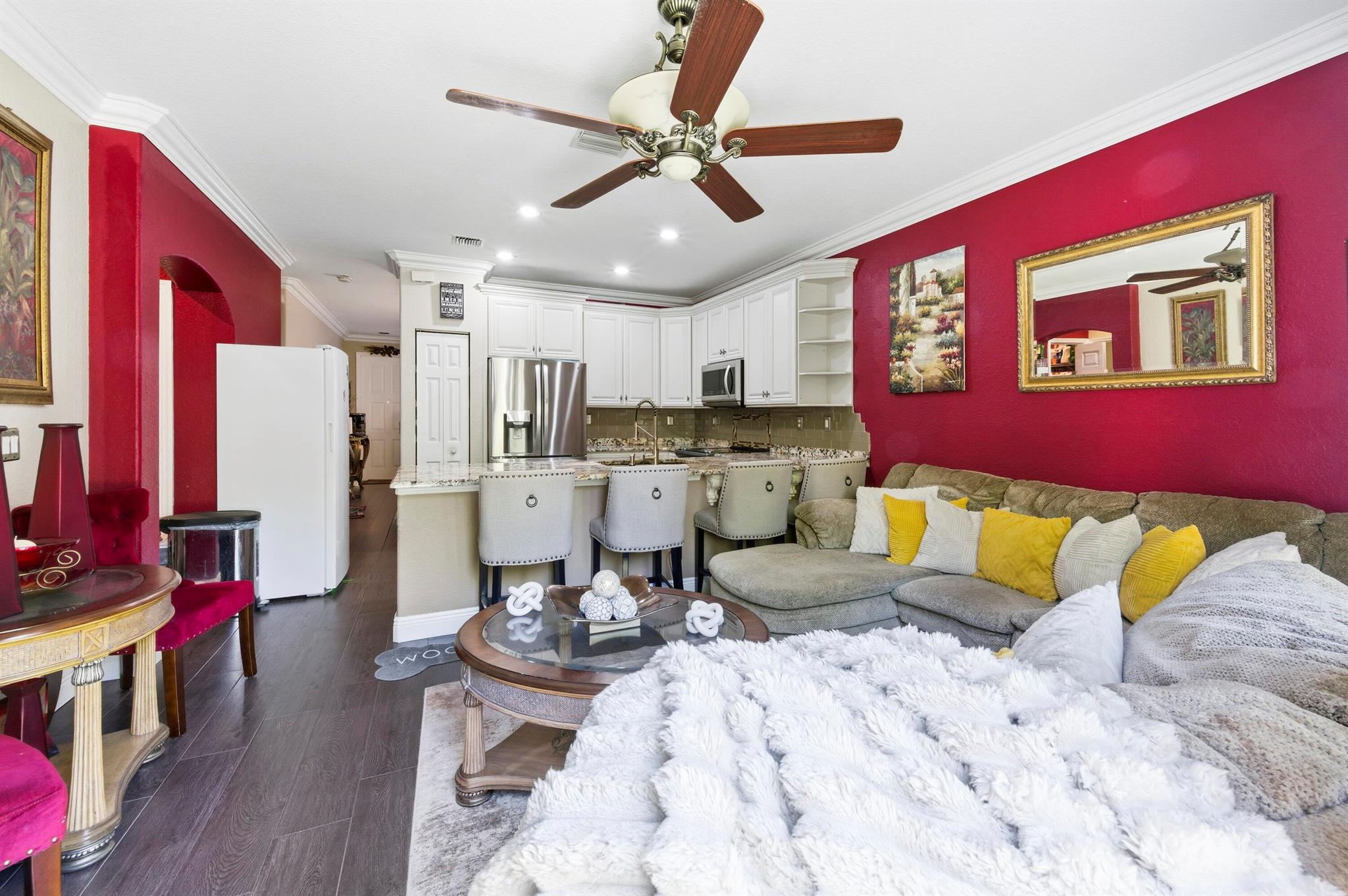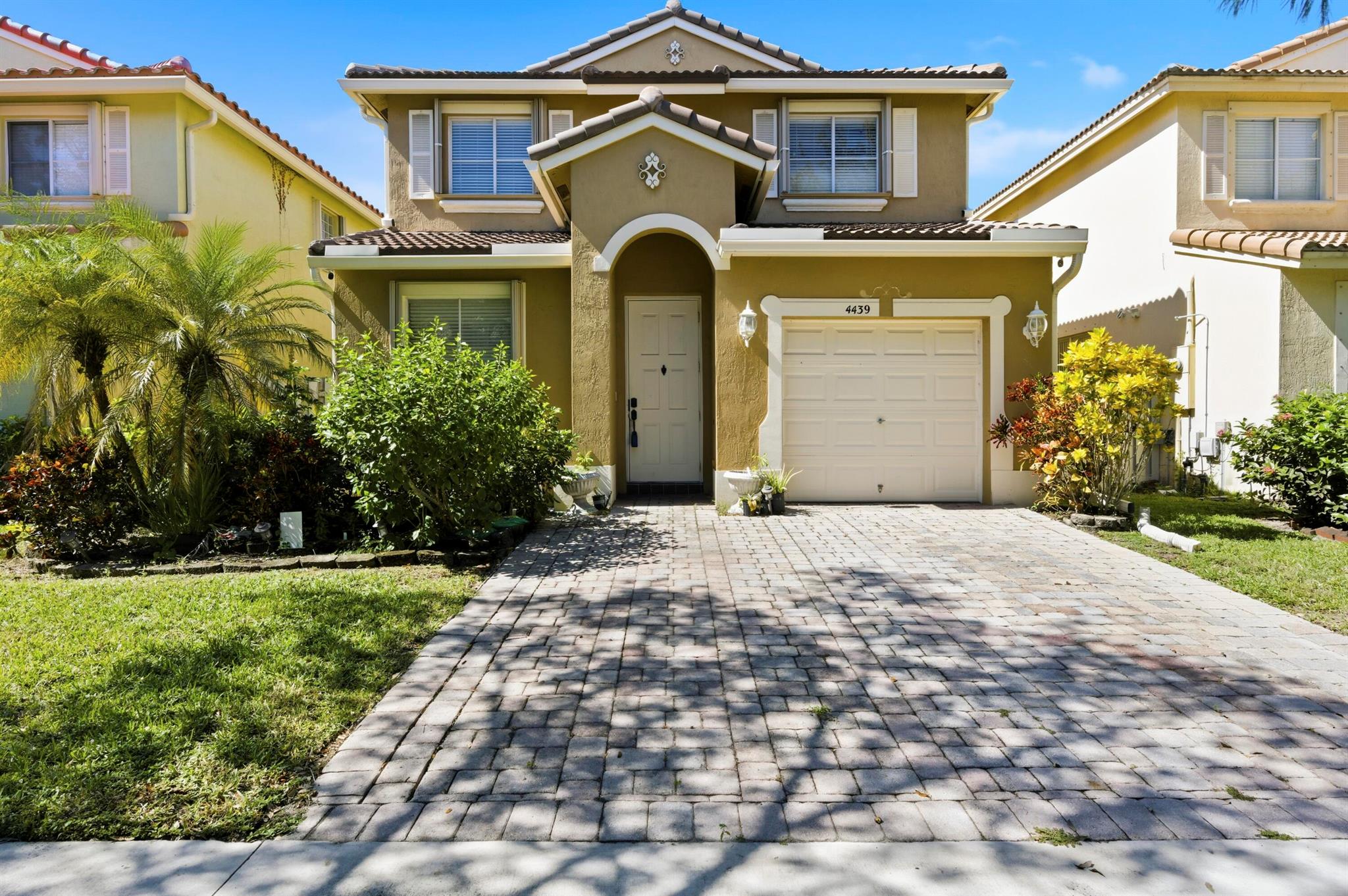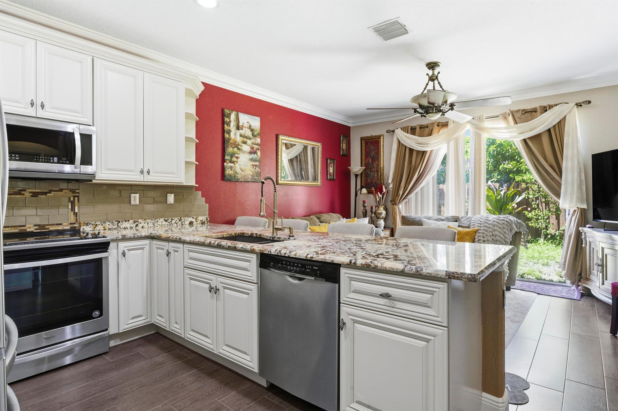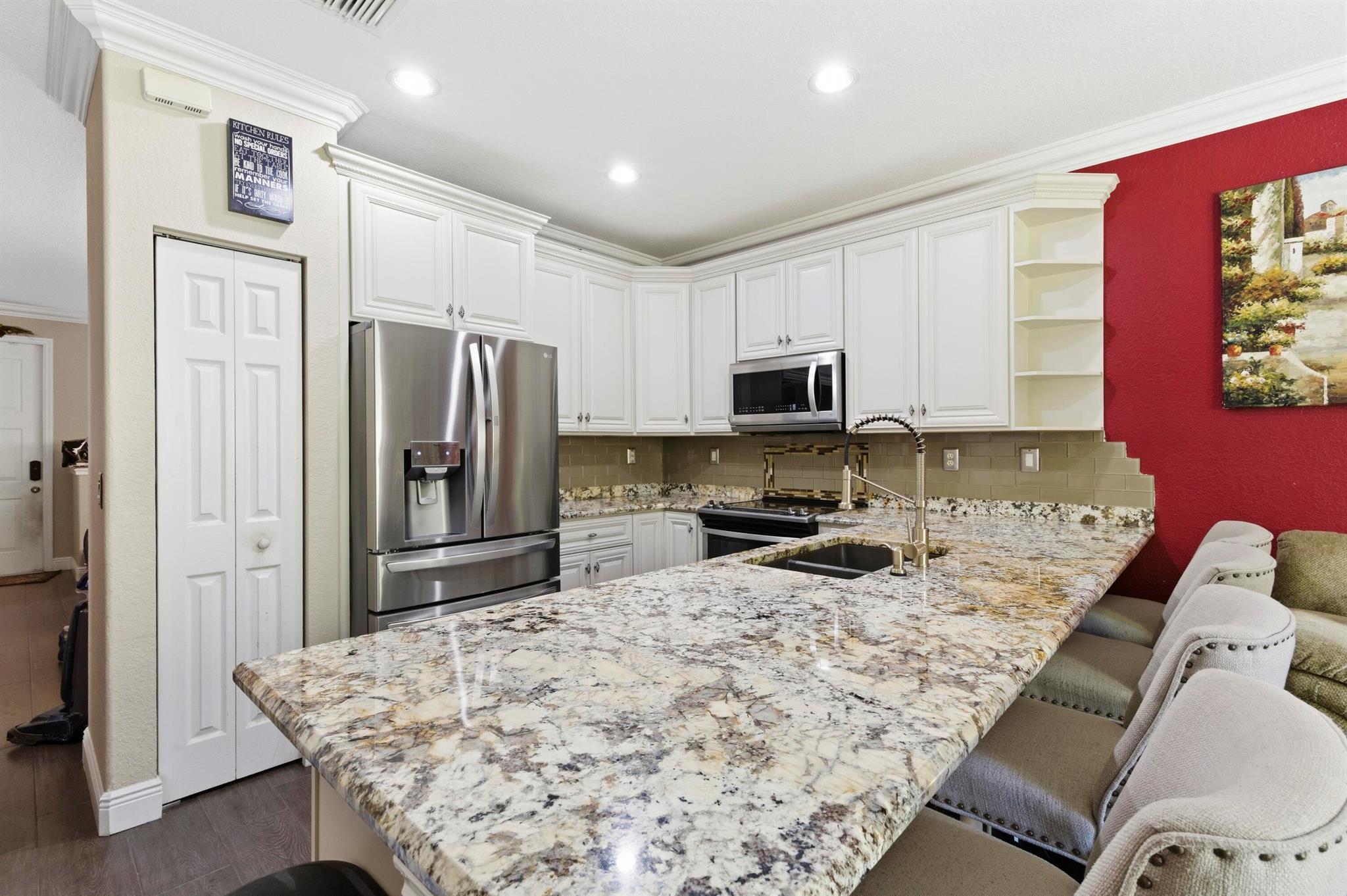 NEW ROOF 2024! This beautifully updated home features accordion shutters, classic crown molding, and a modern design throughout. The kitchen and bathrooms have been upgraded with premium granite countertops, elegant cabinetry, and stainless steel appliances. Enjoy tile flooring downstairs and wood flooring upstairs, large windows with plenty of natural light, and a private fenced yard. The home includes a garage, freshly painted exterior, and outdoor security cameras that stay with the property. One bedroom and a full bathroom are conveniently located downstairs. The spacious master suite offers a gorgeous updated bathroom, and all bedrooms are generously sized.Located in the desirable Lakes of Laguna gated community with very low HOA fees, residents enjoy resort-style amenities