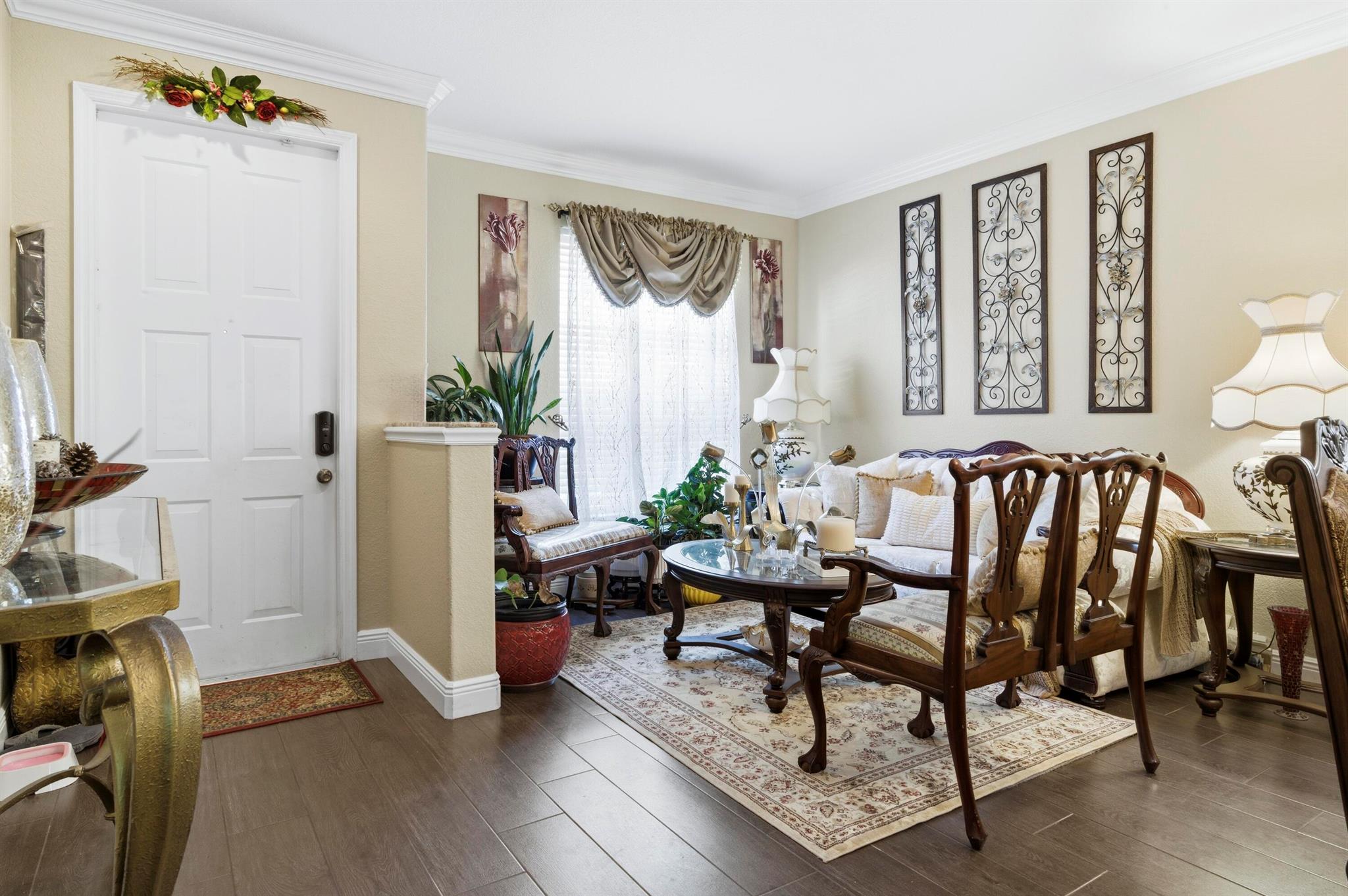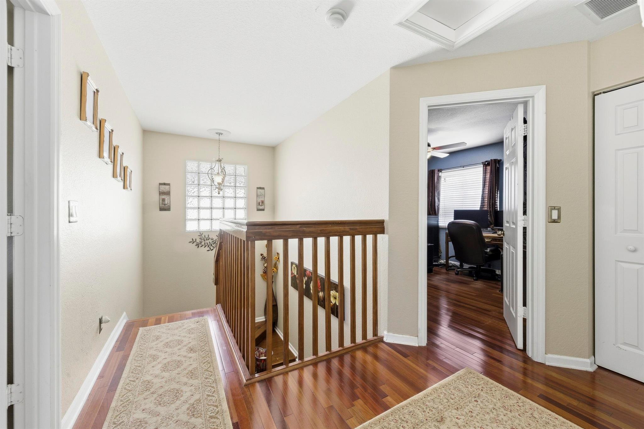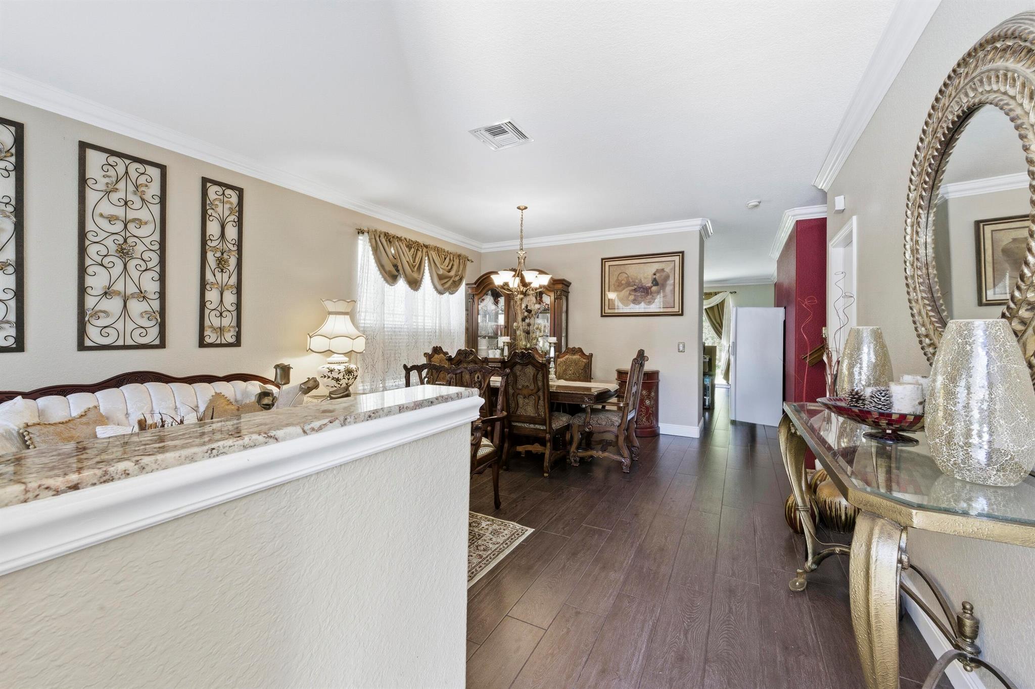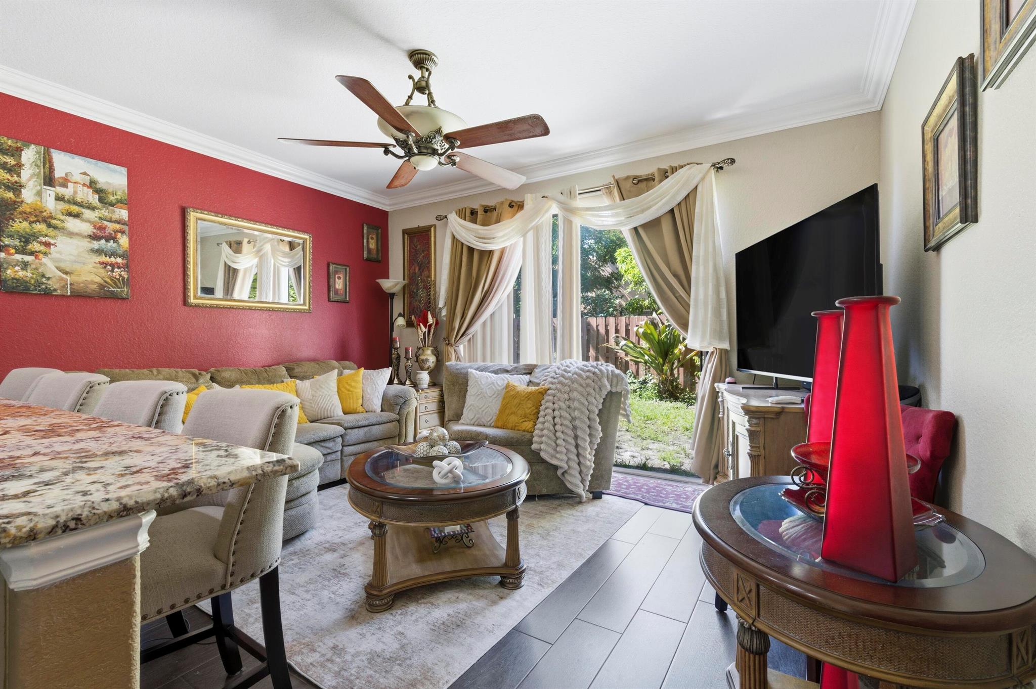NEW ROOF 2024! This beautifully updated home features accordion shutters, classic crown molding, and a modern design throughout. The kitchen and bathrooms have been upgraded with premium granite countertops, elegant cabinetry, and stainless steel appliances. Enjoy tile flooring downstairs and wood flooring upstairs, large windows with plenty of natural light, and a private fenced yard. The home includes a garage, freshly painted exterior, and outdoor security cameras that stay with the property. One bedroom and a full bathroom are conveniently located downstairs. The spacious master suite offers a gorgeous updated bathroom, and all bedrooms are generously sized.Located in the desirable Lakes of Laguna gated community with very low HOA fees, residents enjoy resort-style amenities