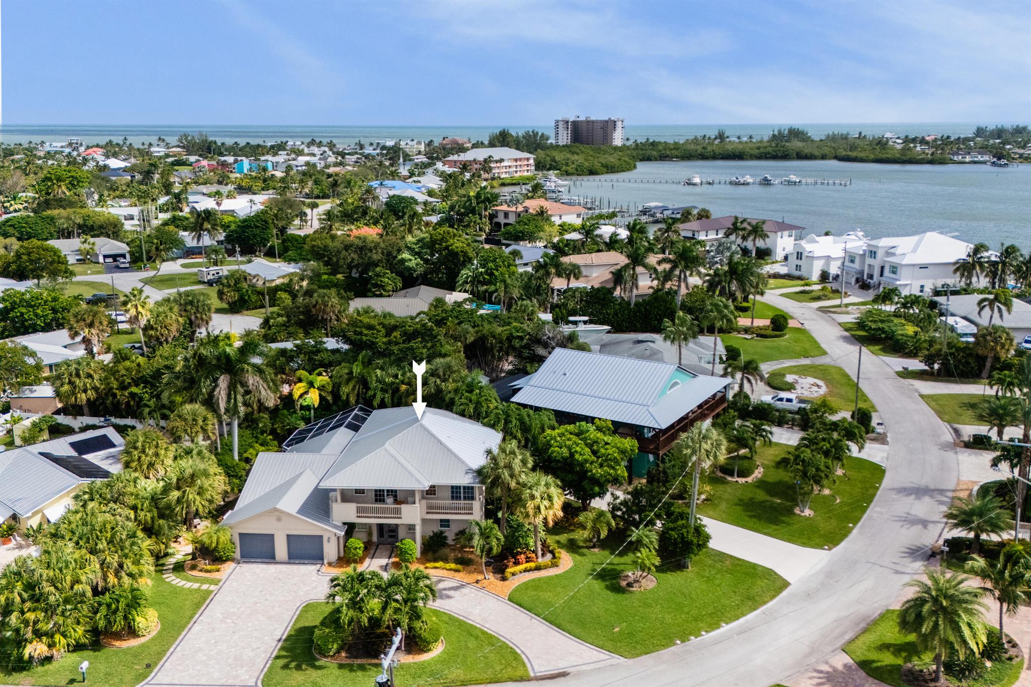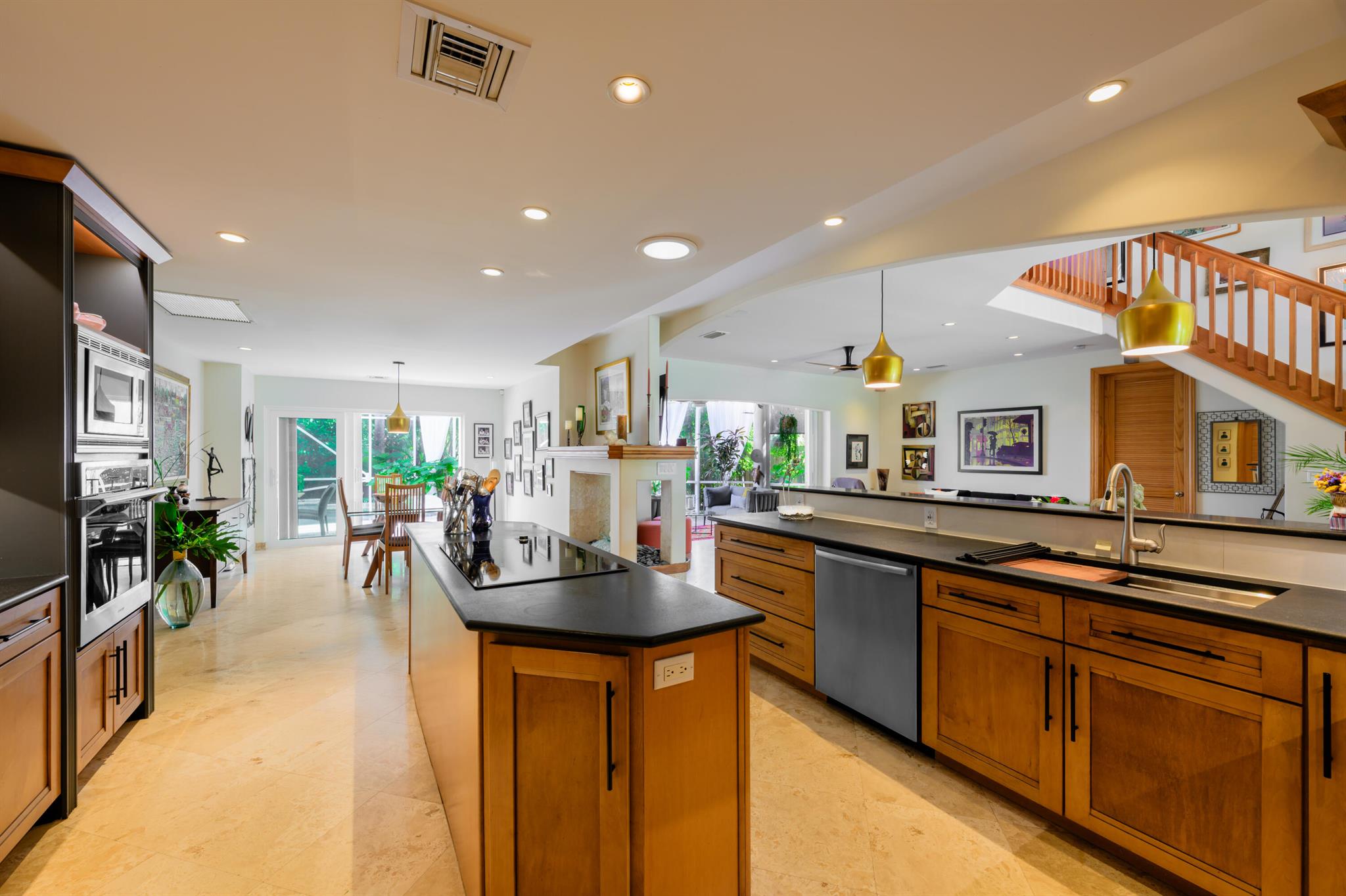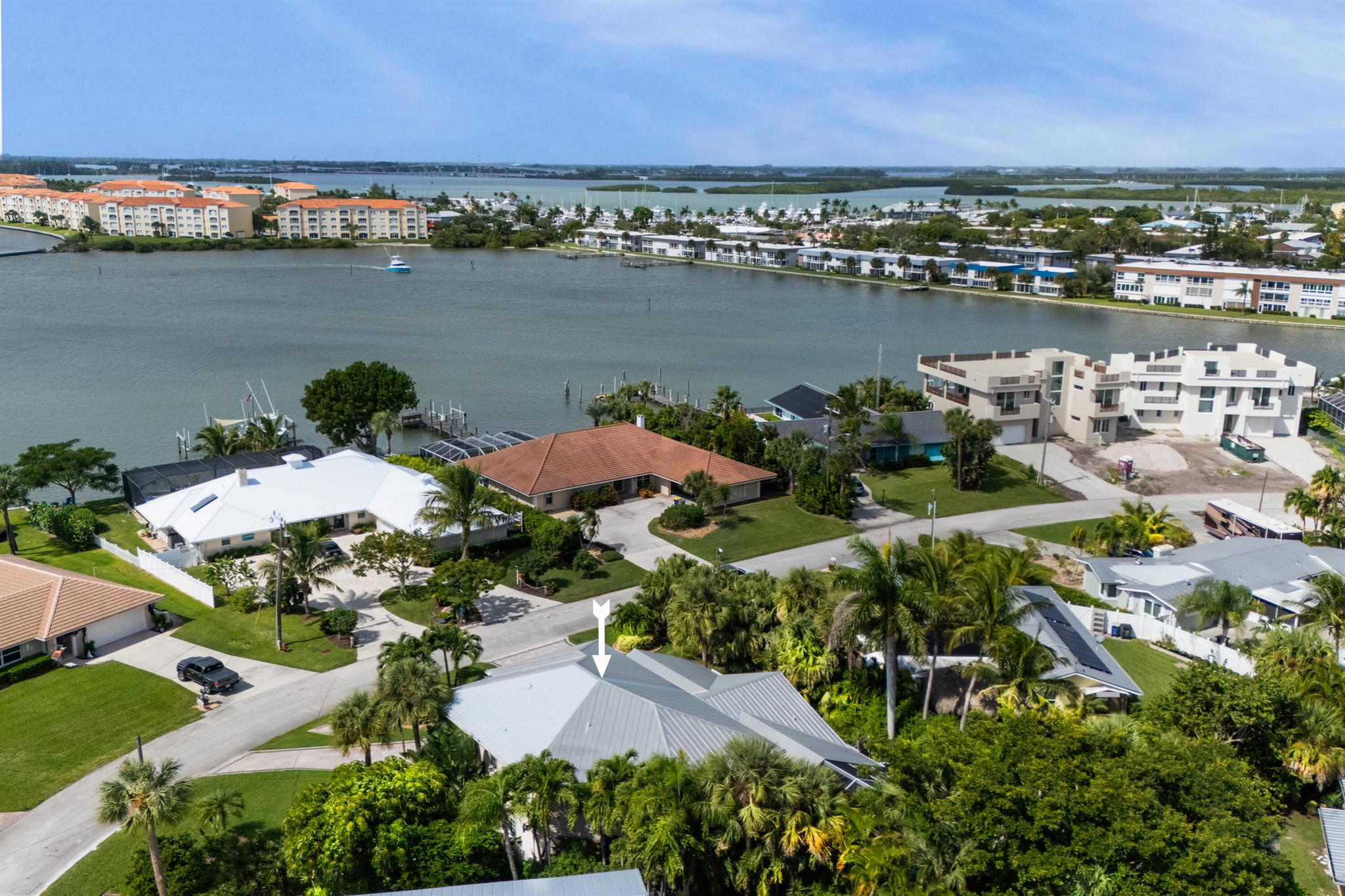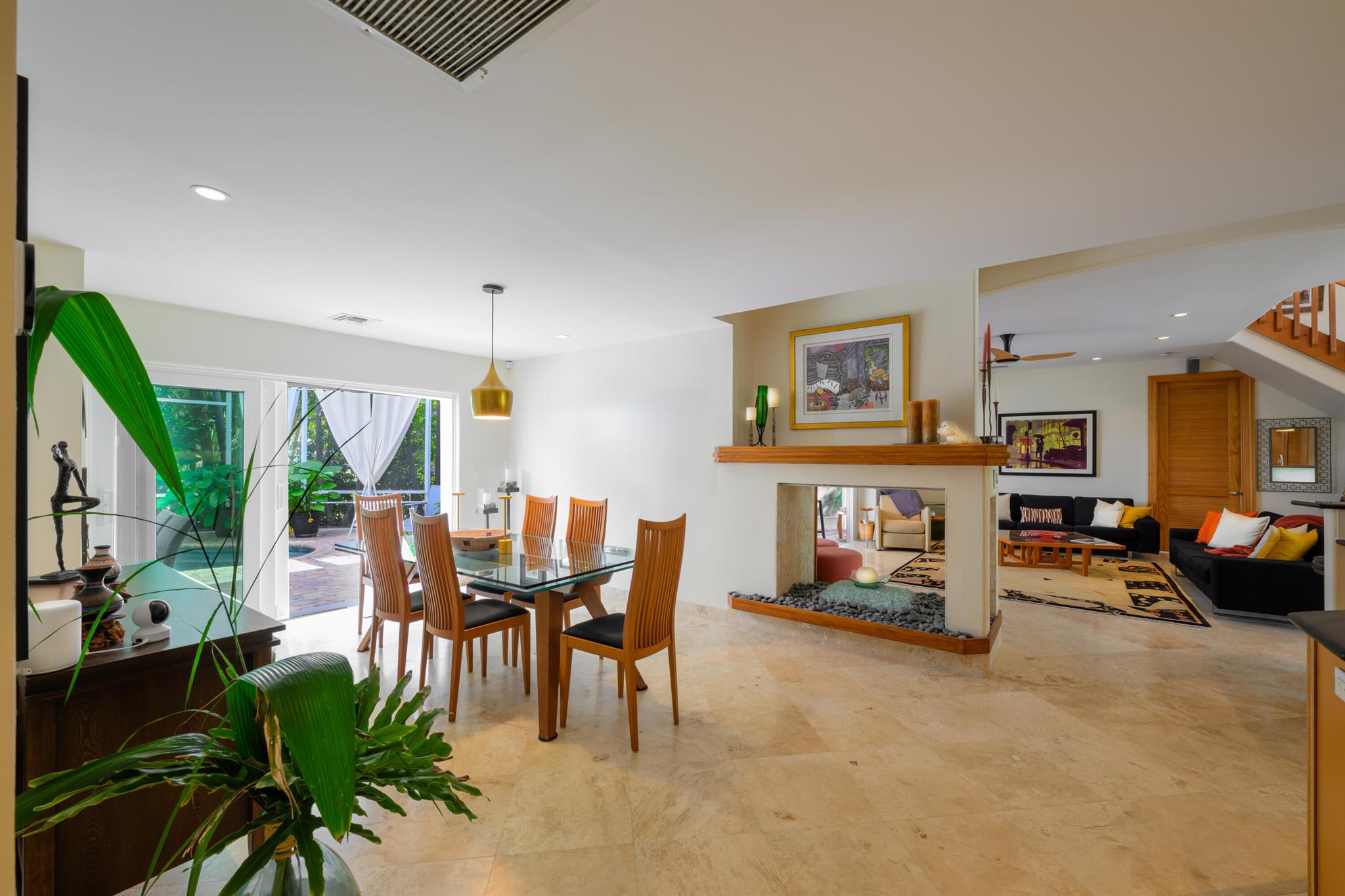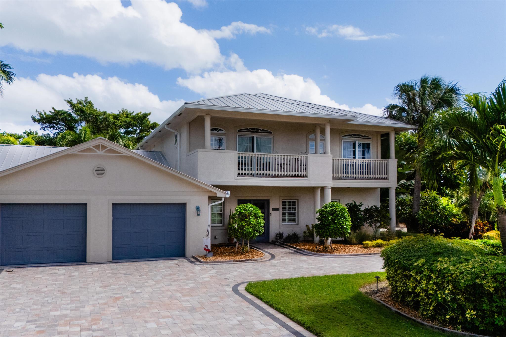 Unique custom craftsmanship in this beautiful Zen Island home with water views of the Intracoastal. Large rooms, tall ceilings and incredible style. It has that wow factor right when you walk in the front door into a architects designer great room that overlooks the heated salt water pool and indoor and outdoor living areas. Travertine flooring throughout the downstairs, with one large primary bedroom with private bath, plus two guest bedrooms and a full bath. Spacious open great room, amazing kitchen with a large dining area. All these areas open up to the tropical pool oasis with privacy landscaping--so serene! Secluded Primary bedroom suite upstairs. A full balcony with sunrise and sunset water views to relax on, and a spa like en-suite. Upstairs are all-natural oak floors,